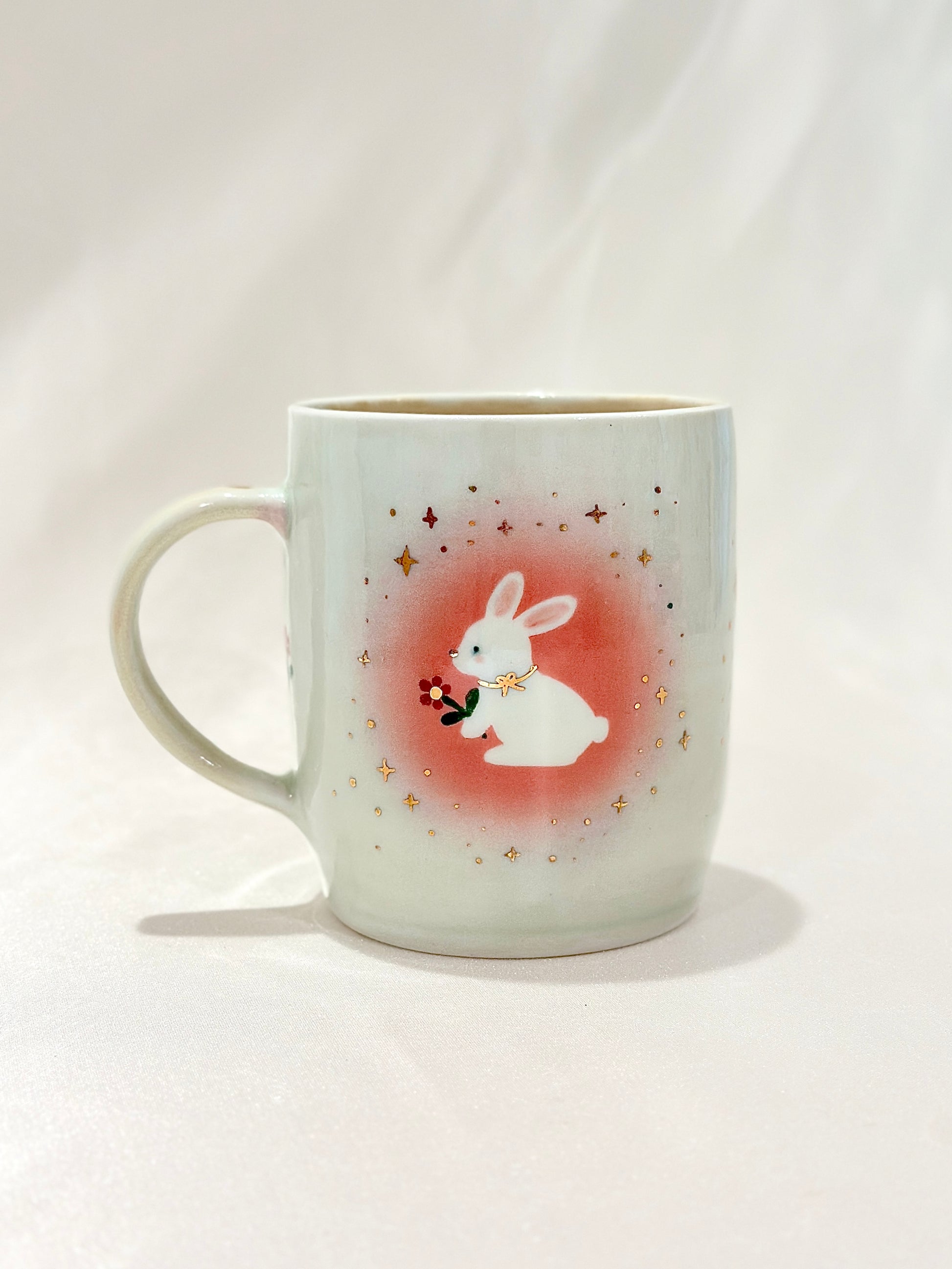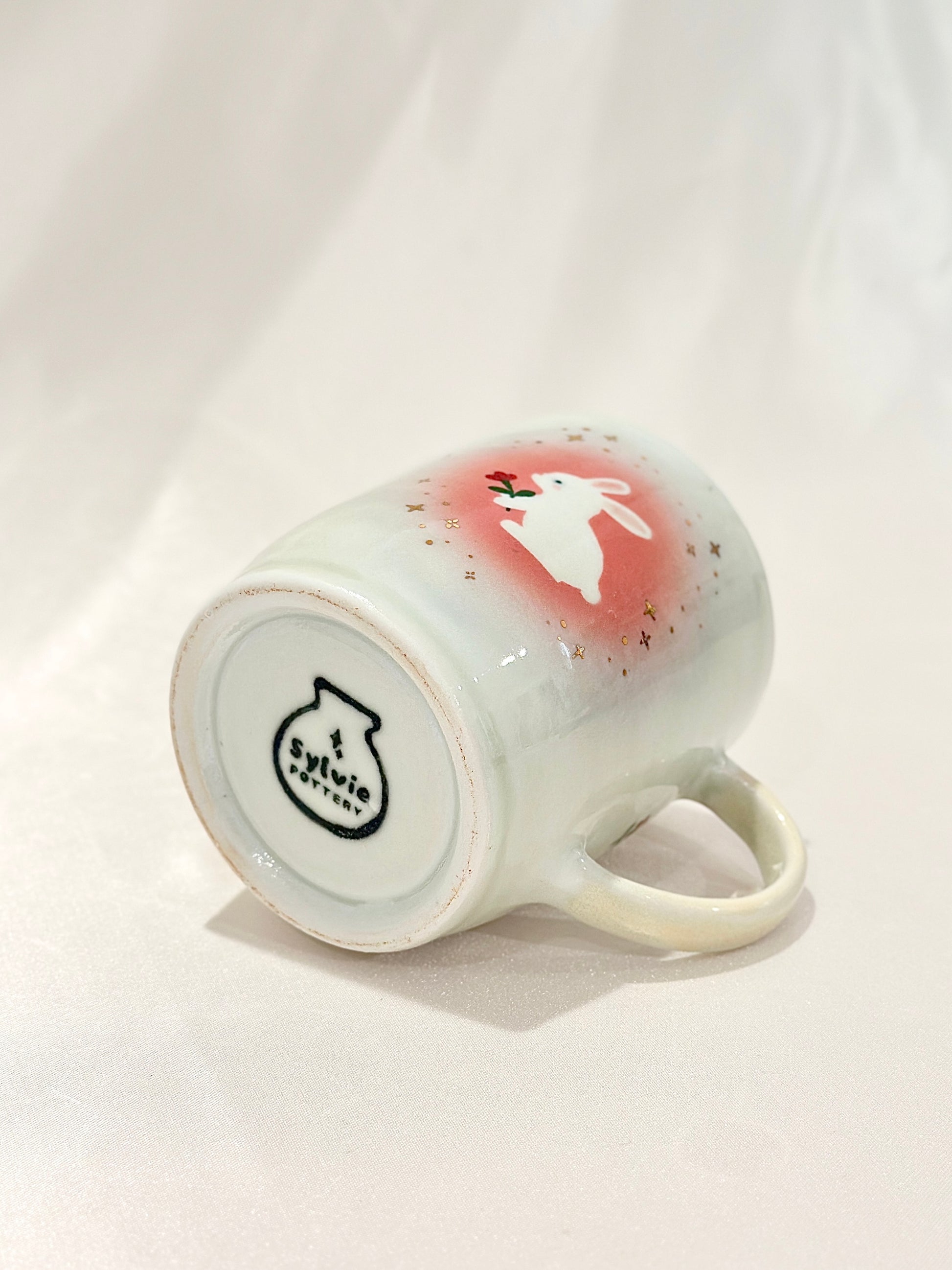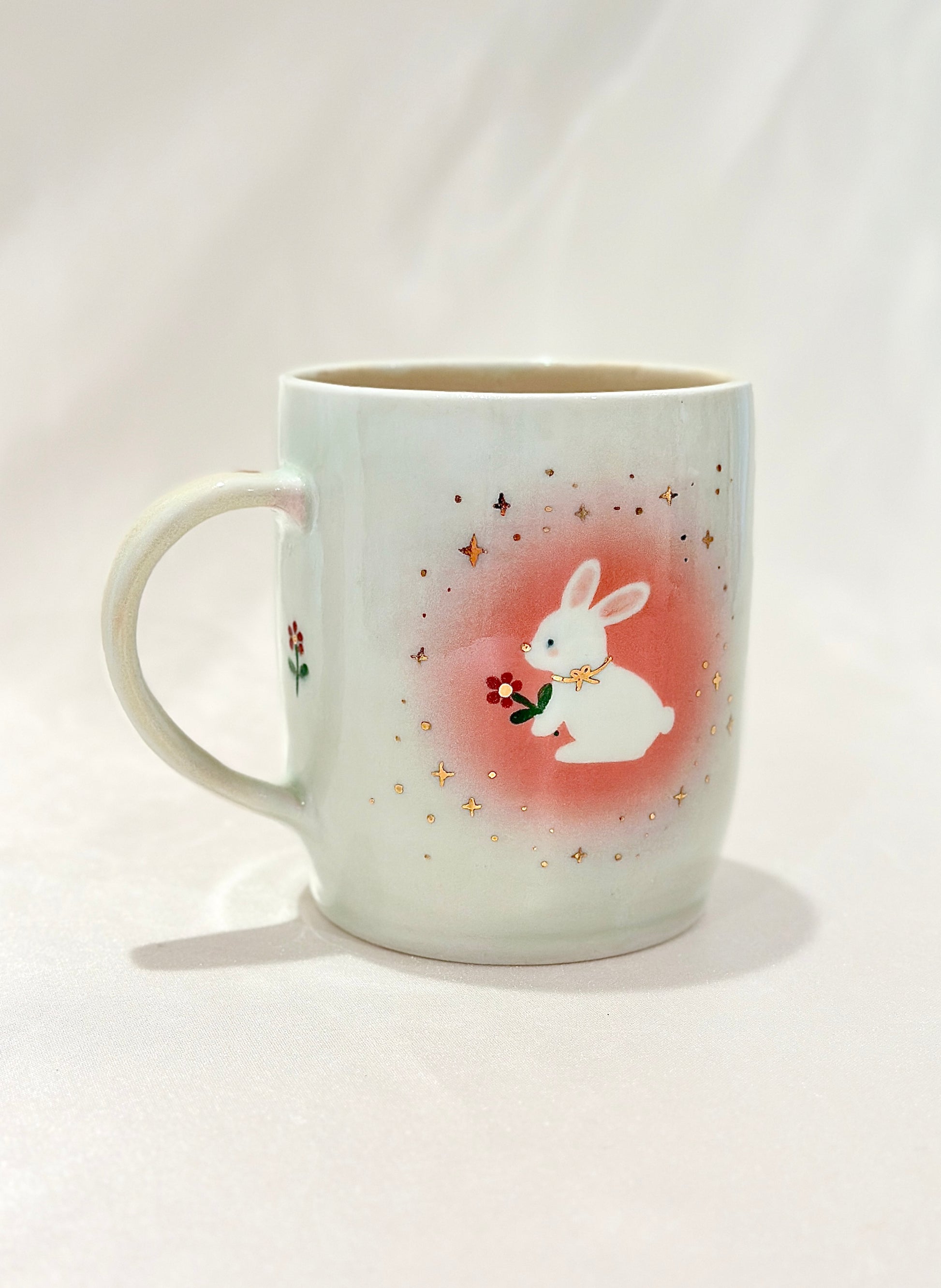 A soft white bunny holds a red flower beneath a sky of hand-painted 24k gold stars, sitting in a blush of pink like a wish in midair. It’s a small reminder that love doesn’t need to be loud to be felt, sometimes the simplest gestures carry the deepest warmth 🌟