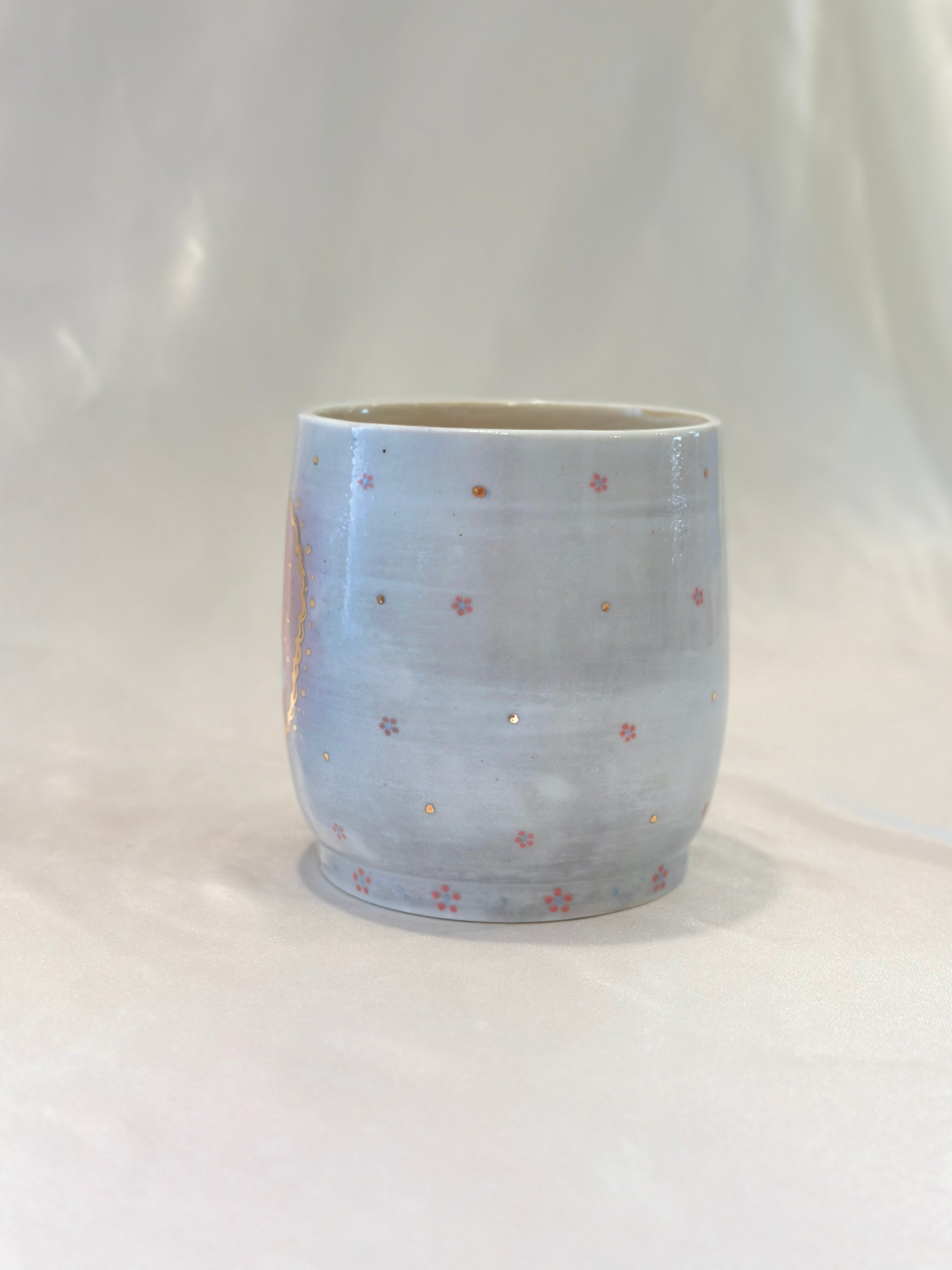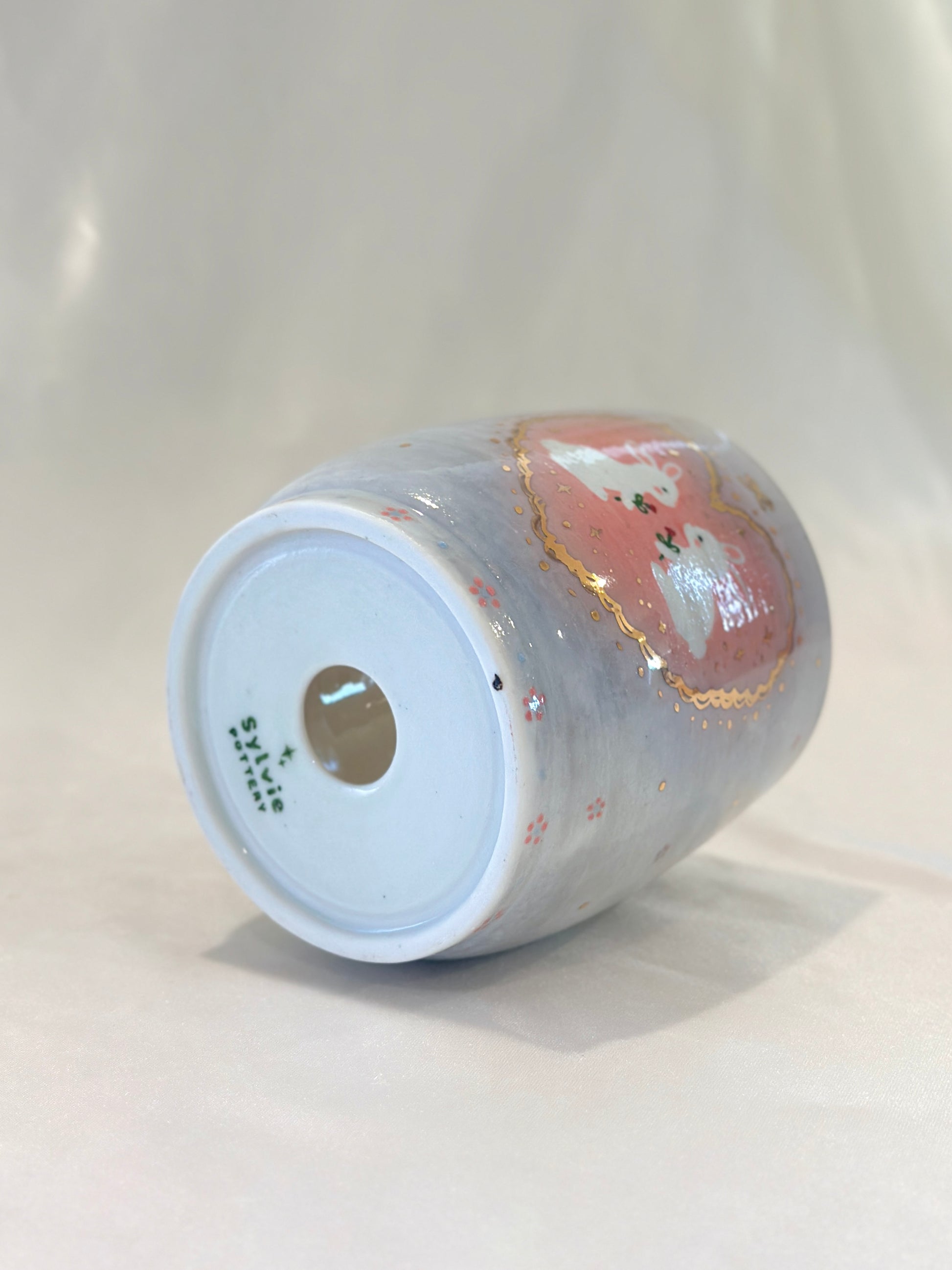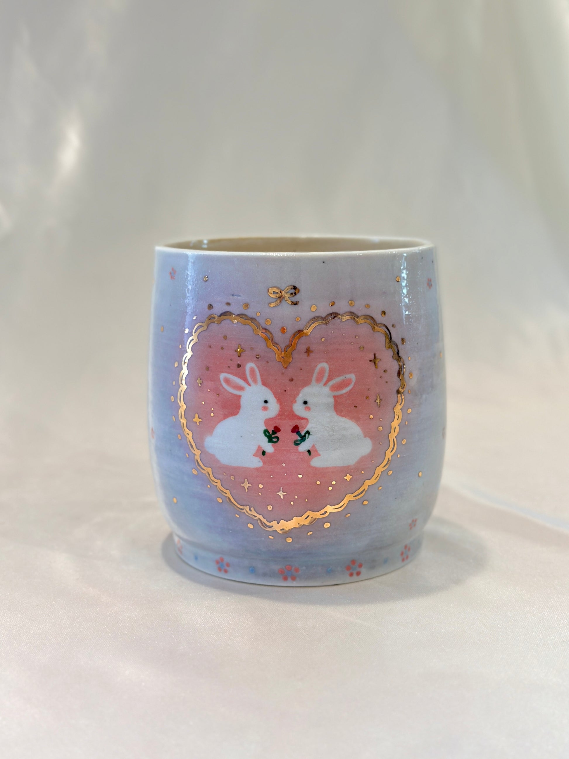 Two white bunnies sit face to face in a soft pink heart, surrounded by delicate 24k gold details, shimmering stars, and a tiny golden bow. The backdrop of lavender blue glaze adds a soft, peaceful glow to the piece. Finished with a drainage hole, it’s ready to cradle your favorite plant with sweetness and grace. Please note- has a grayish tint🐇