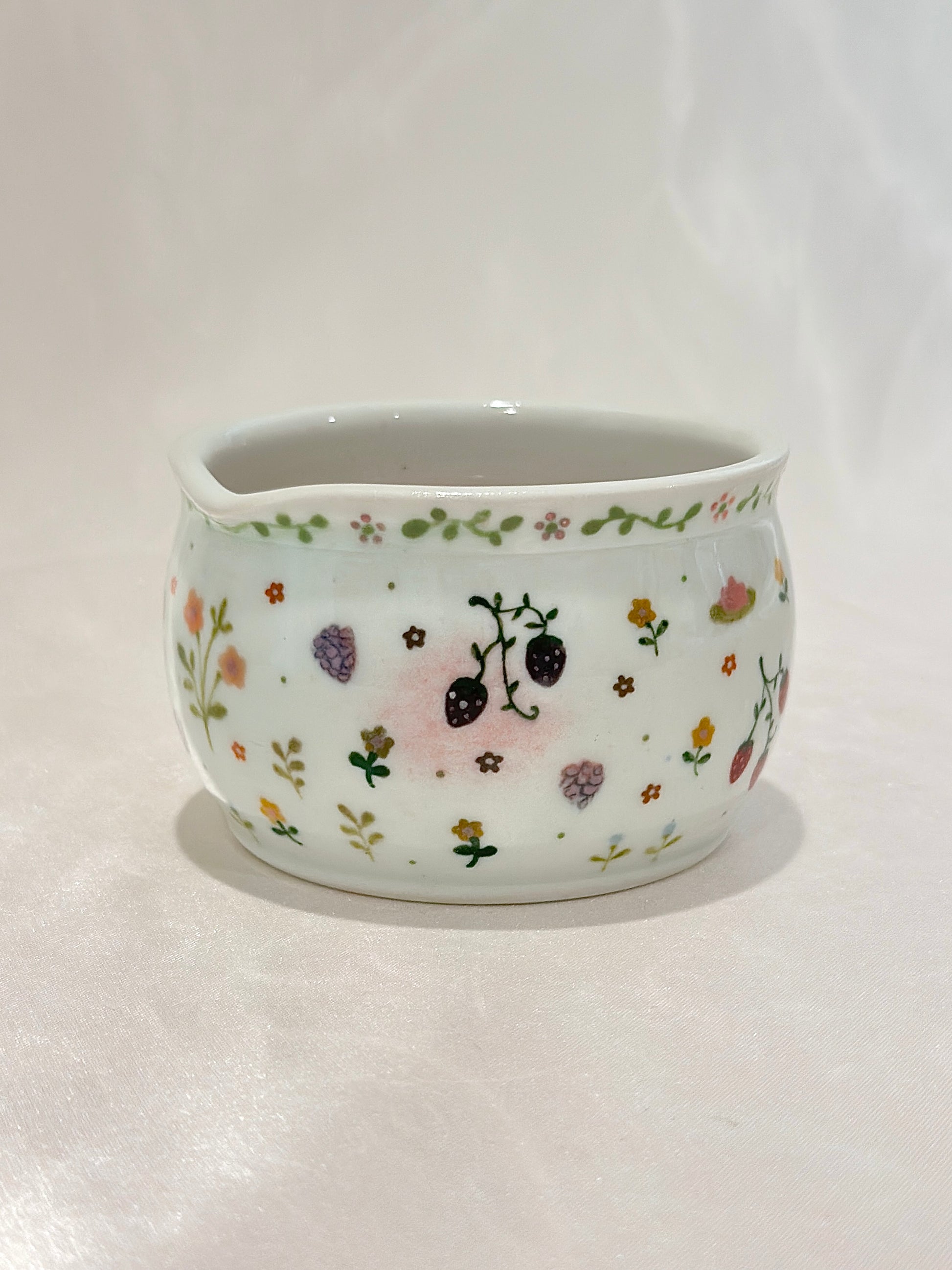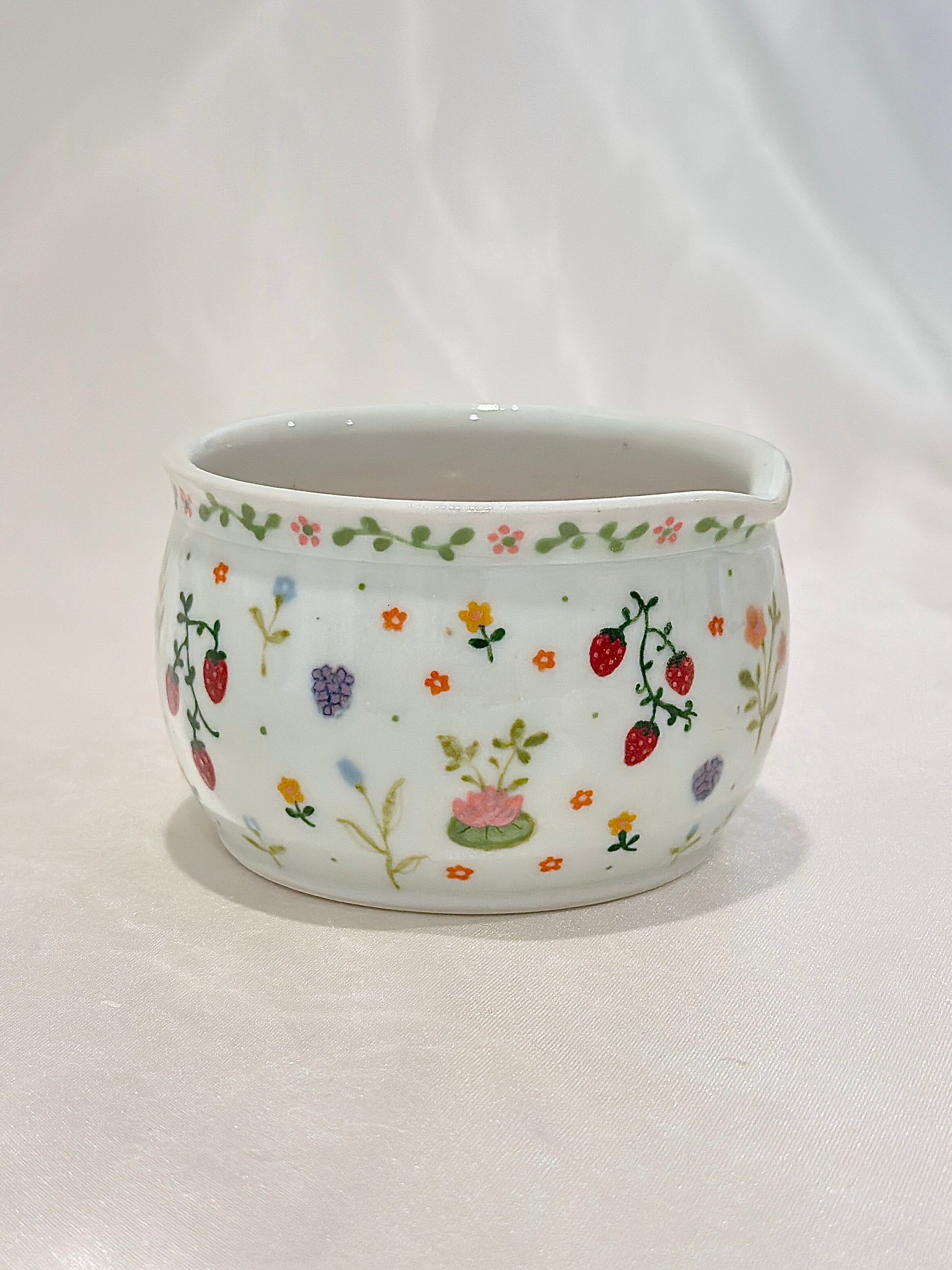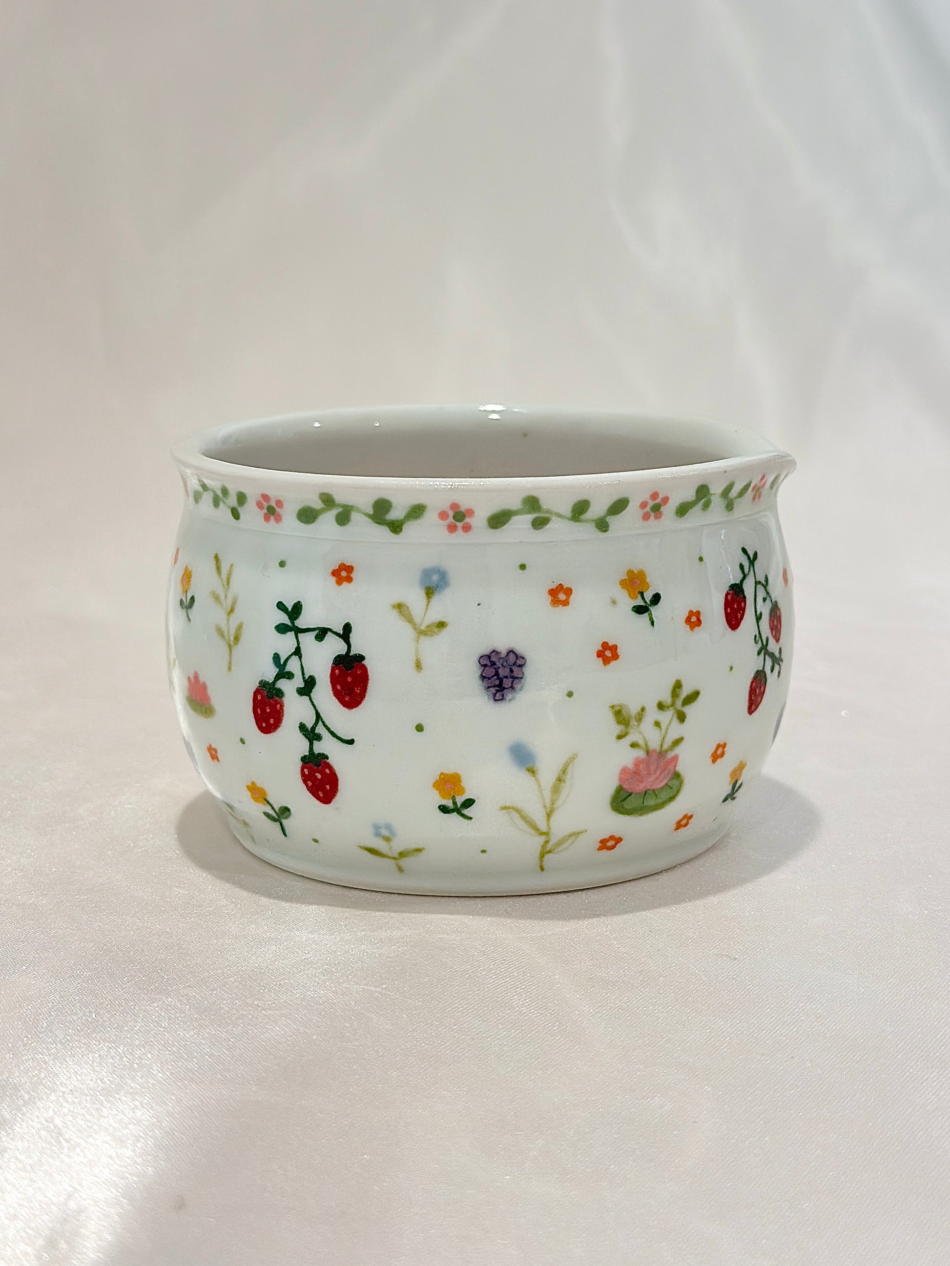 Strawberries, blossoms, and tiny garden treasures scatter across the porcelain like a meadow kissed by morning light. It feels like a celebration of summer’s sweetness, captured in a bowl meant to brighten your everyday 🍓