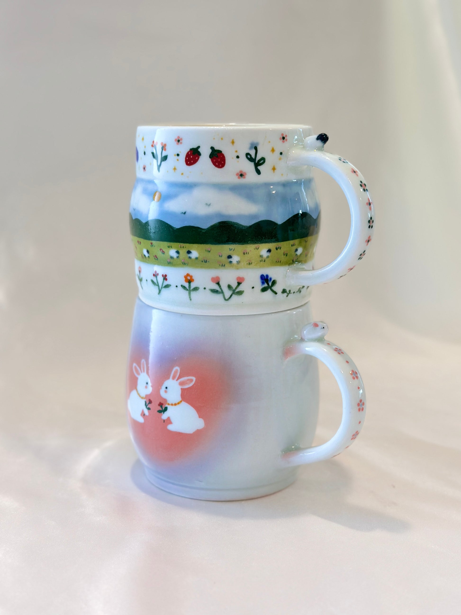 Two white bunnies face one another on both sides of the mug, each pair nestled inside a soft blush heart and offering tiny flowers. This mug also has a special sculpted bunny perched on the handle. It's a sweet and soulful companion, made to soften your day and bring warmth to every sip. Please note: Oval rim, natural speckling, and a small cosmetic craze line visible in photo 🐇🌸