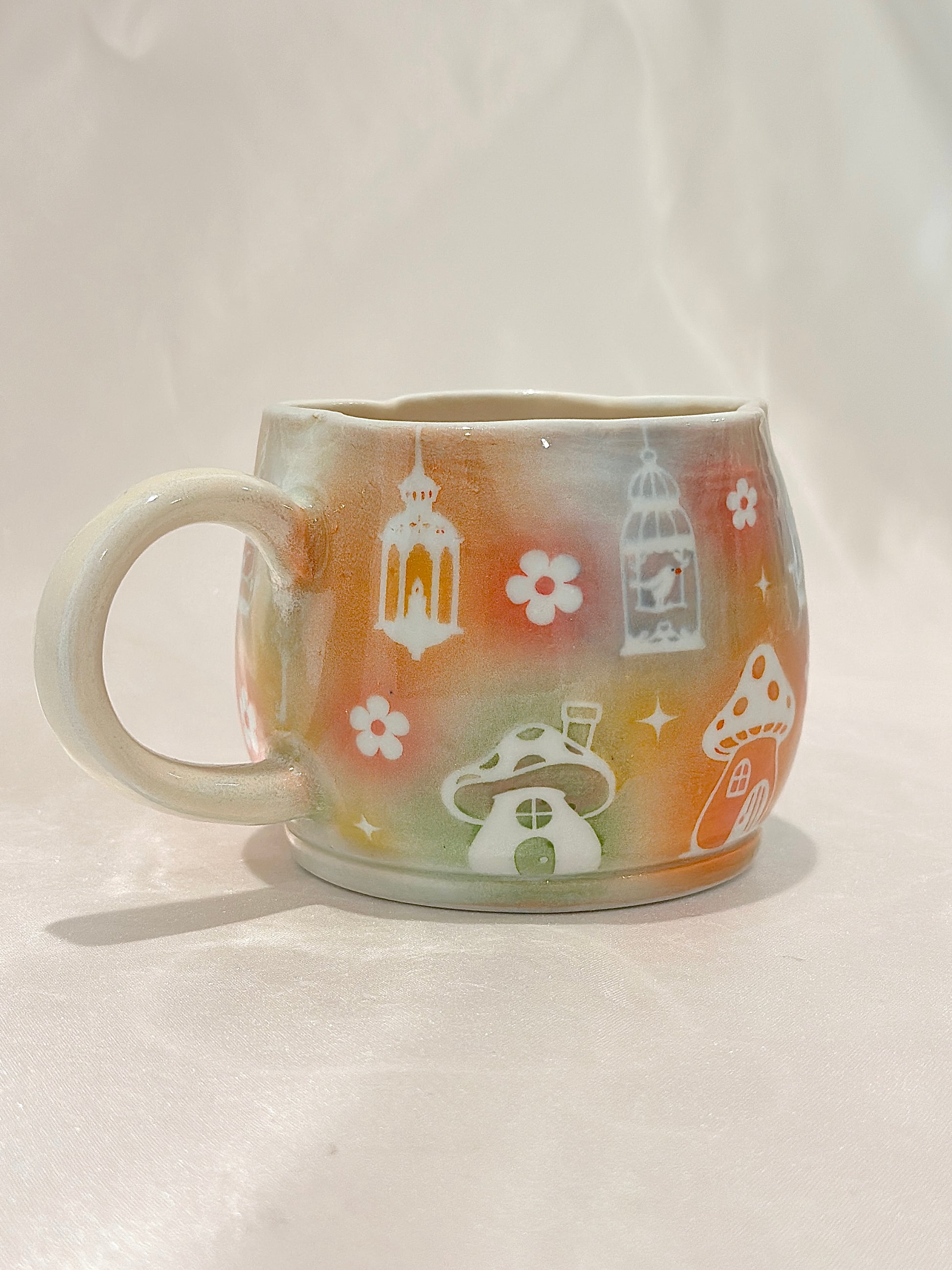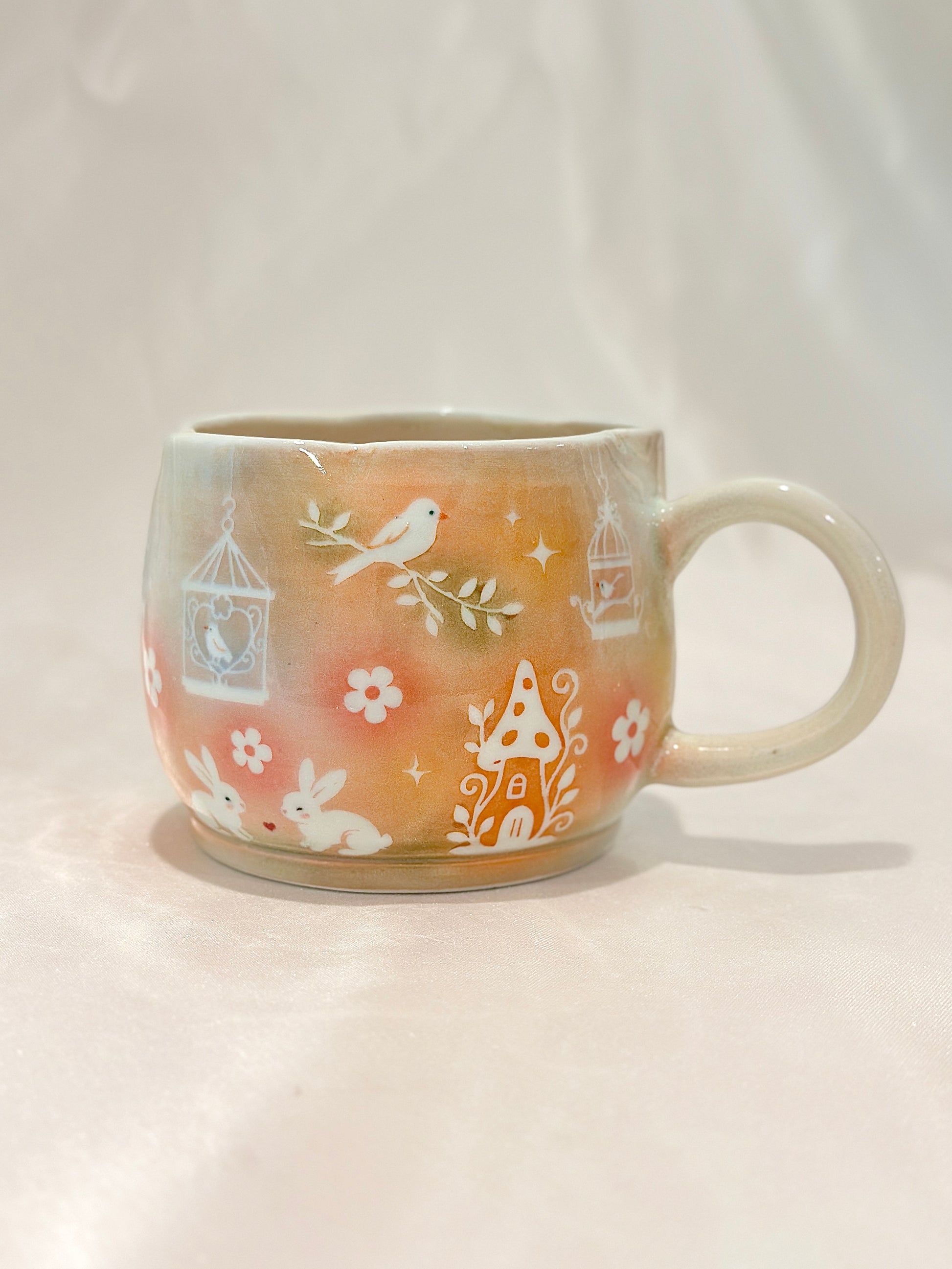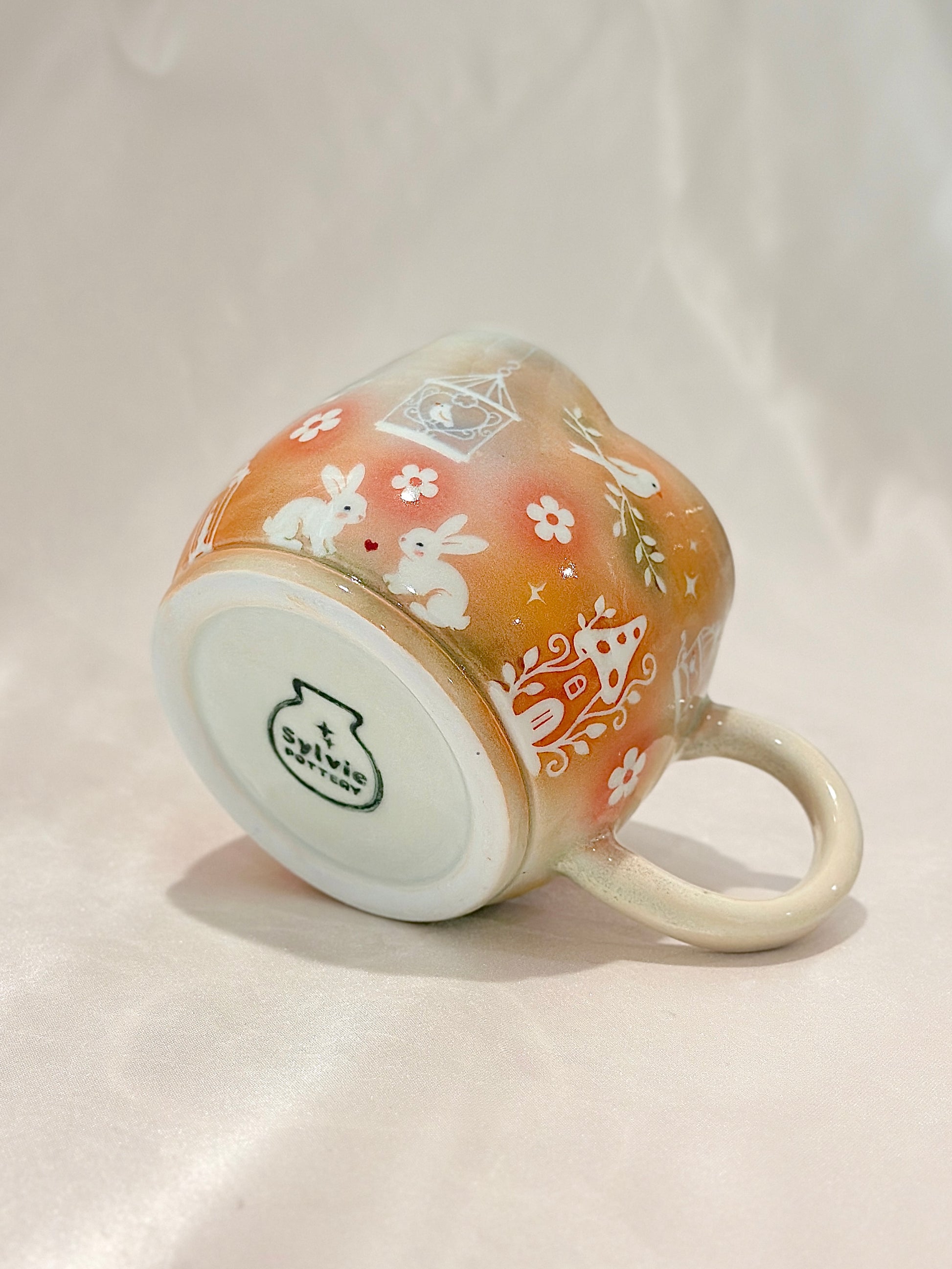 A flower-rimmed mug painted in soft autumn pastels carries a playful scene of bunnies, songbirds, and little mushroom cottages. It’s a piece that invites you to sip slowly and remember the gentle magic woven through everyday life, always with a touch of cozy wonder. Please note: The flower-rimmed shape is slightly wonky and sprinkled with speckles 🐇
