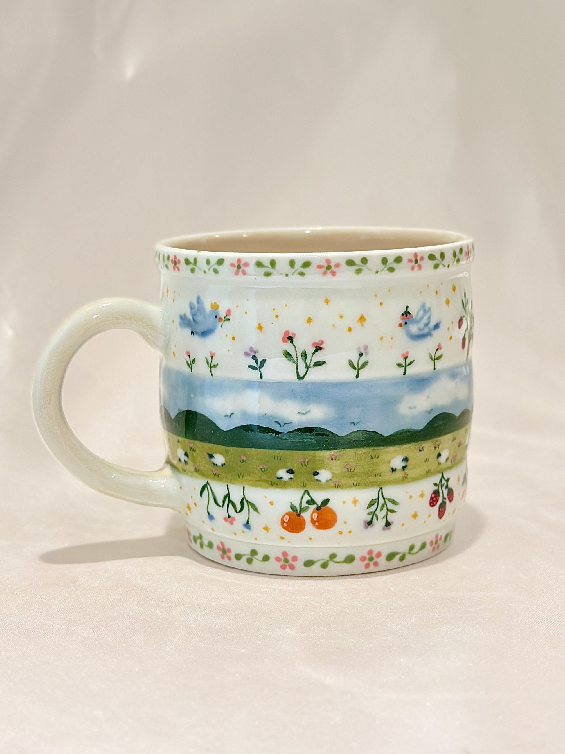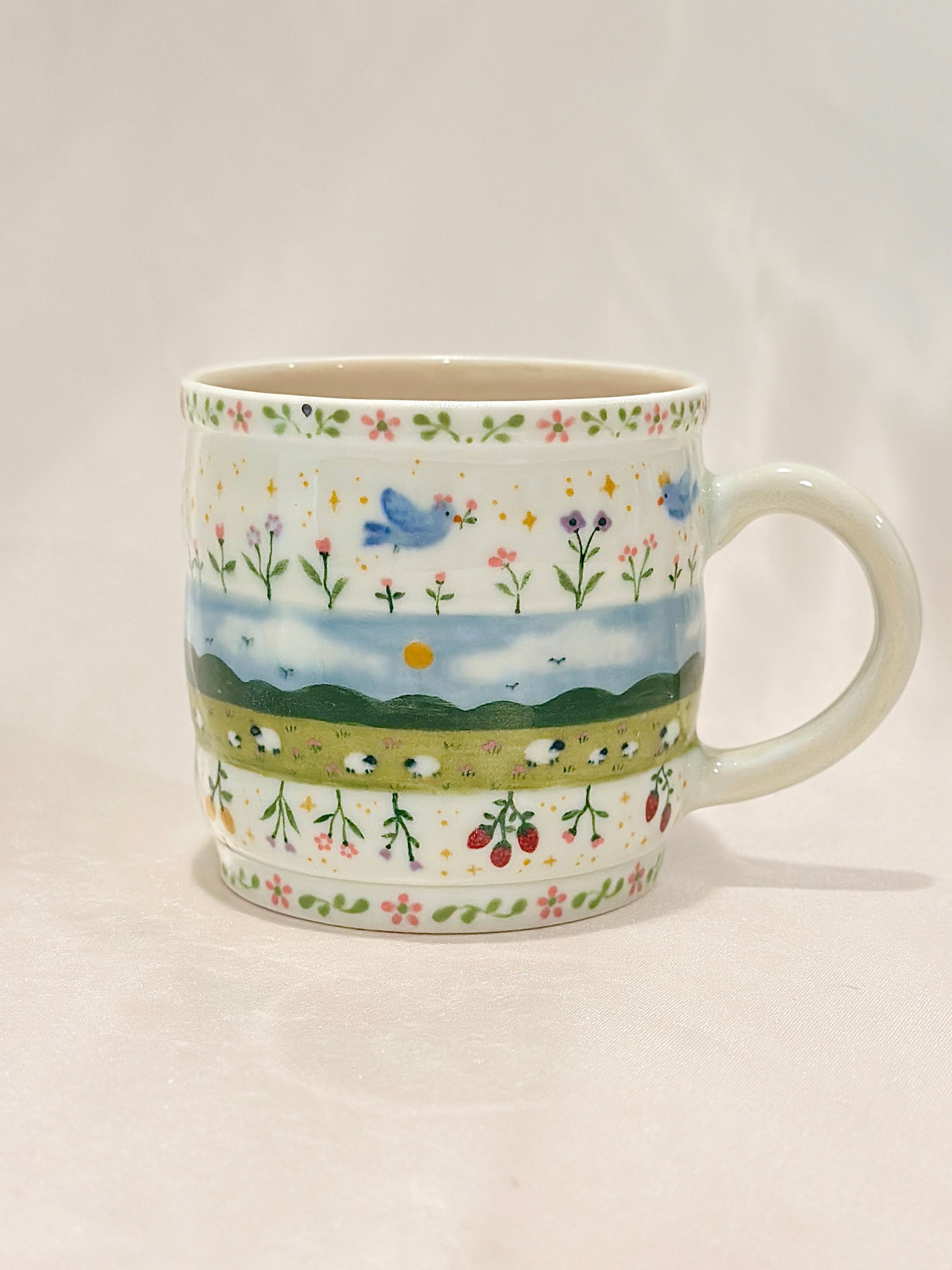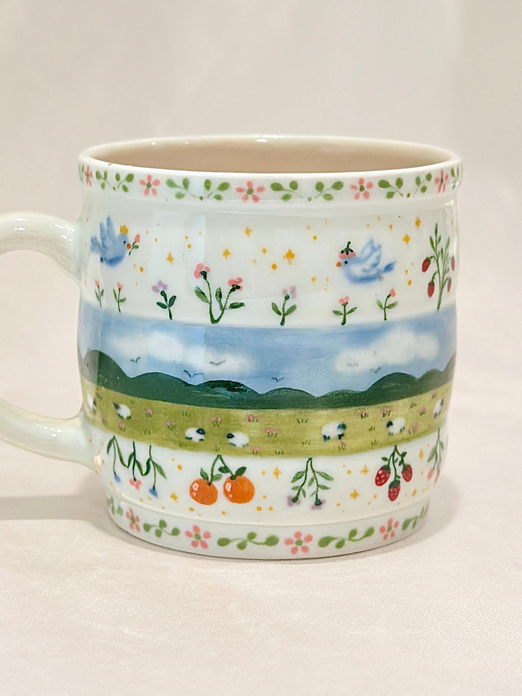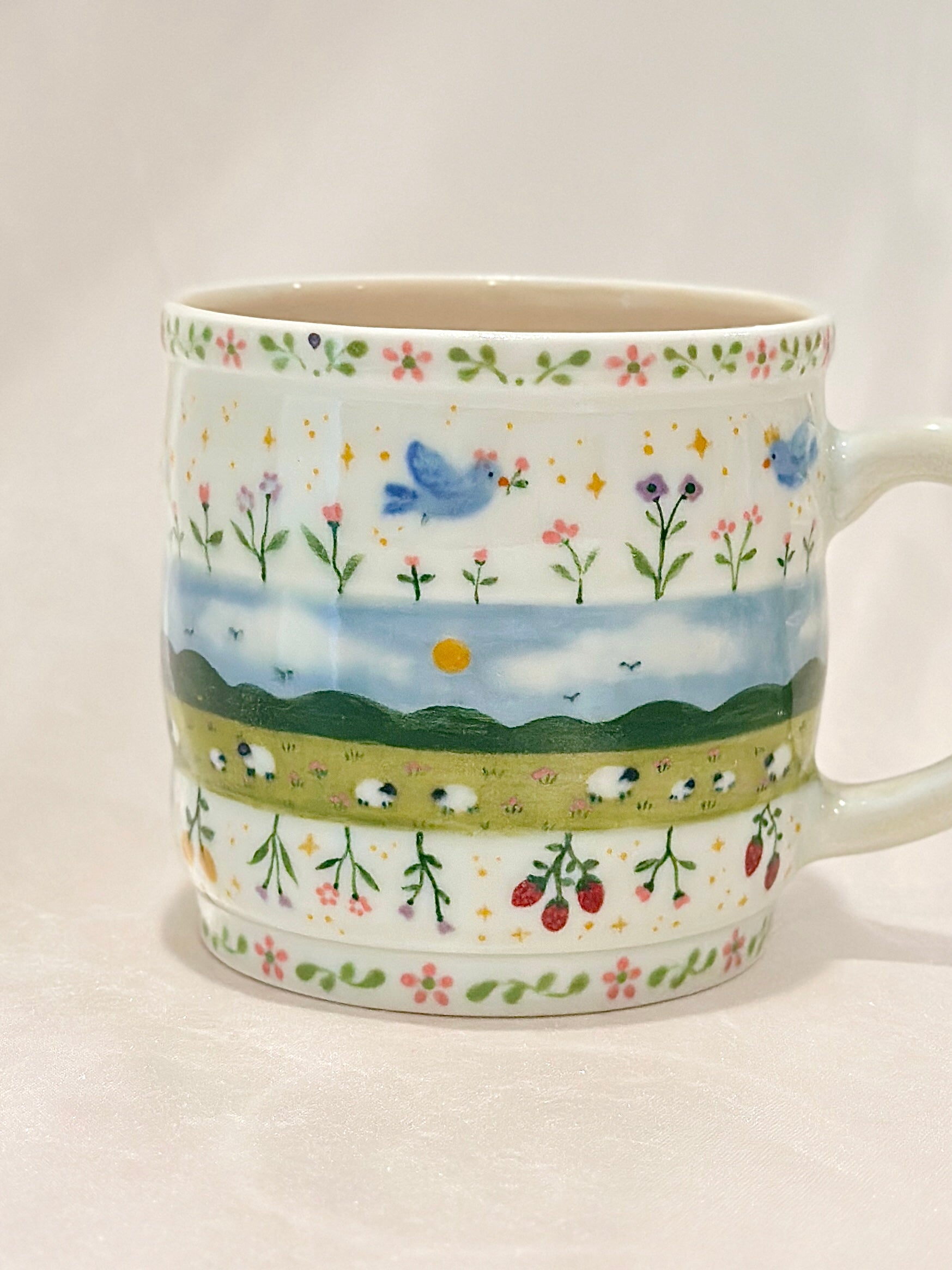 Rolling green hills dotted with sheep stretch beneath a golden sun, framed by blooming flowers, fluttering bluebirds, and sweet fruits. This mug invites you to pause, breathe, and taste the quiet abundance of life. Please note: Some speckles ✨