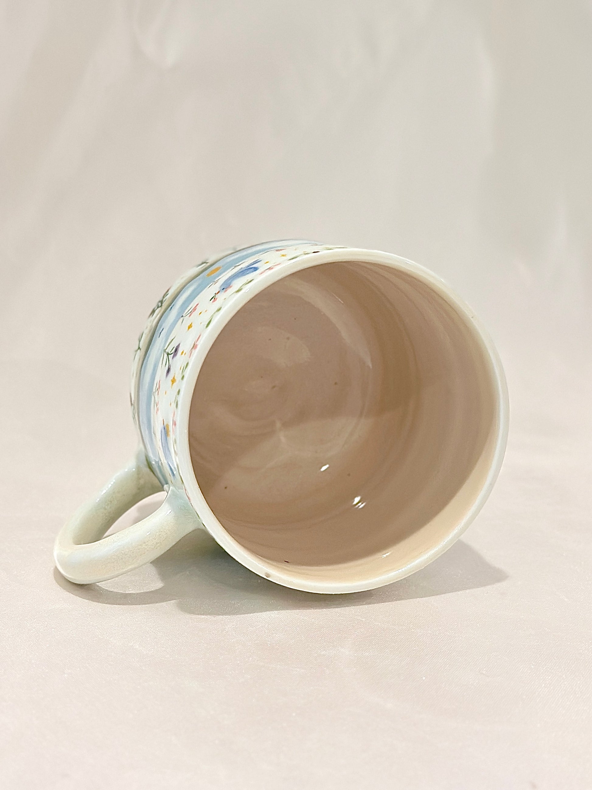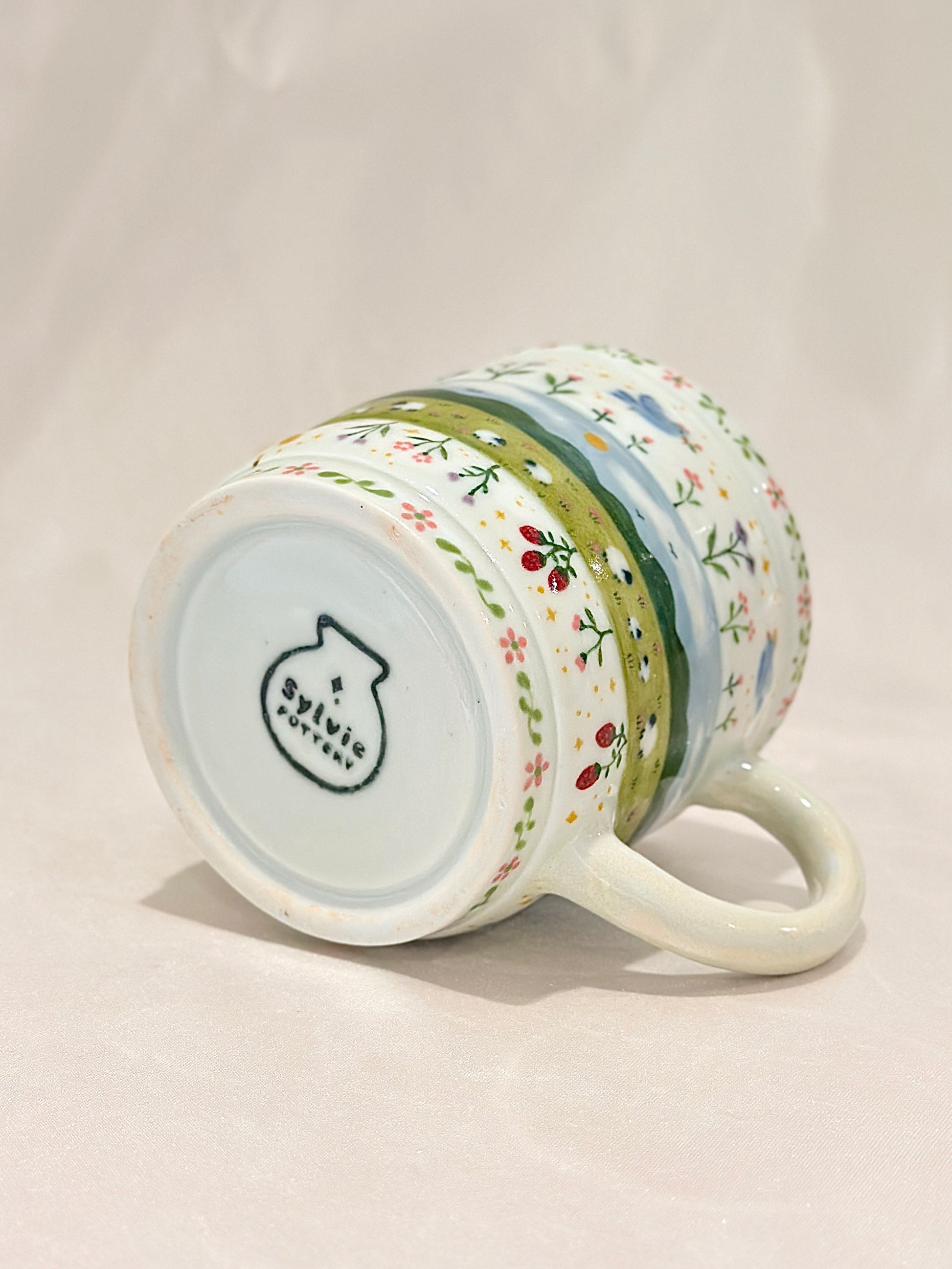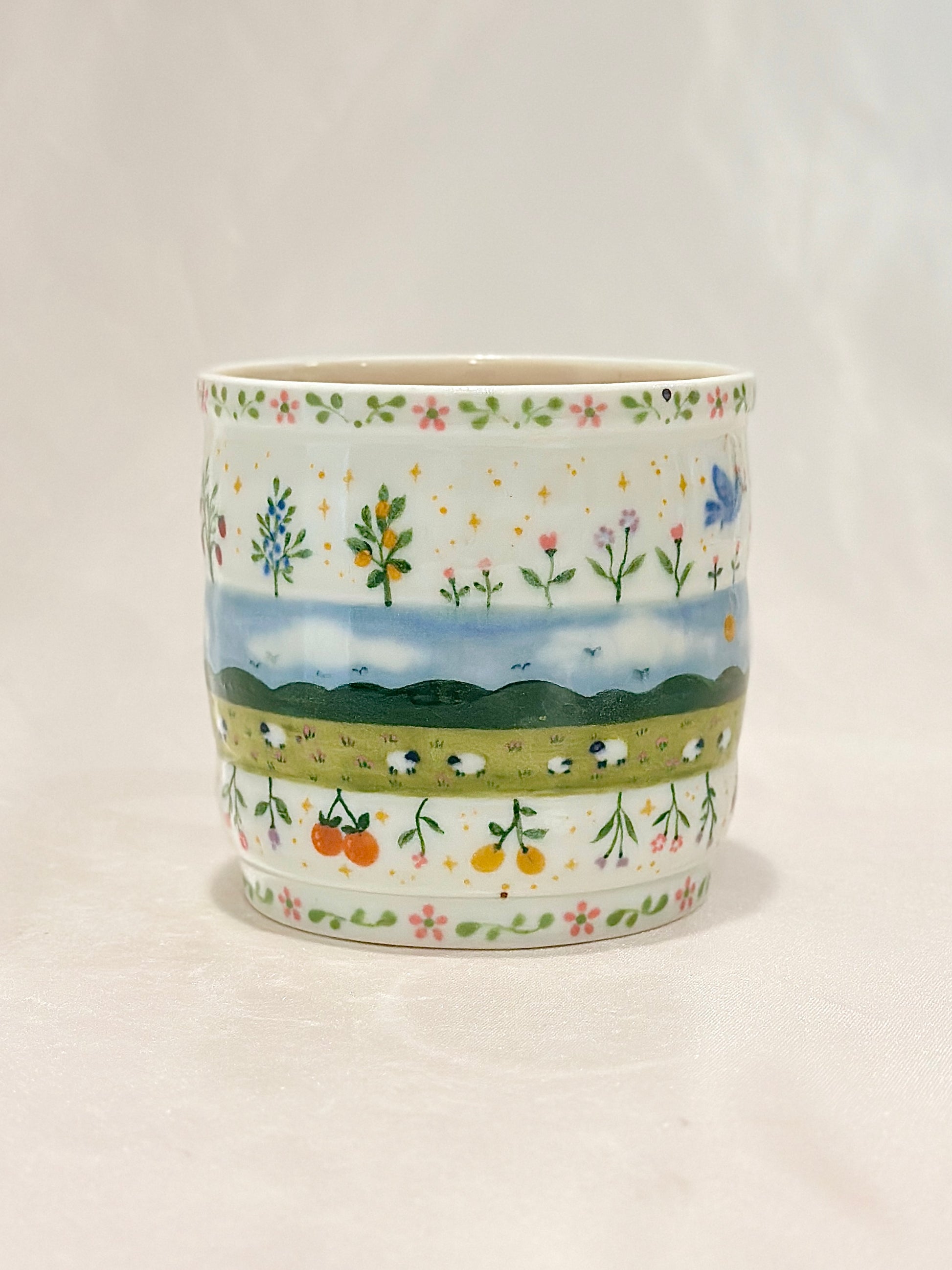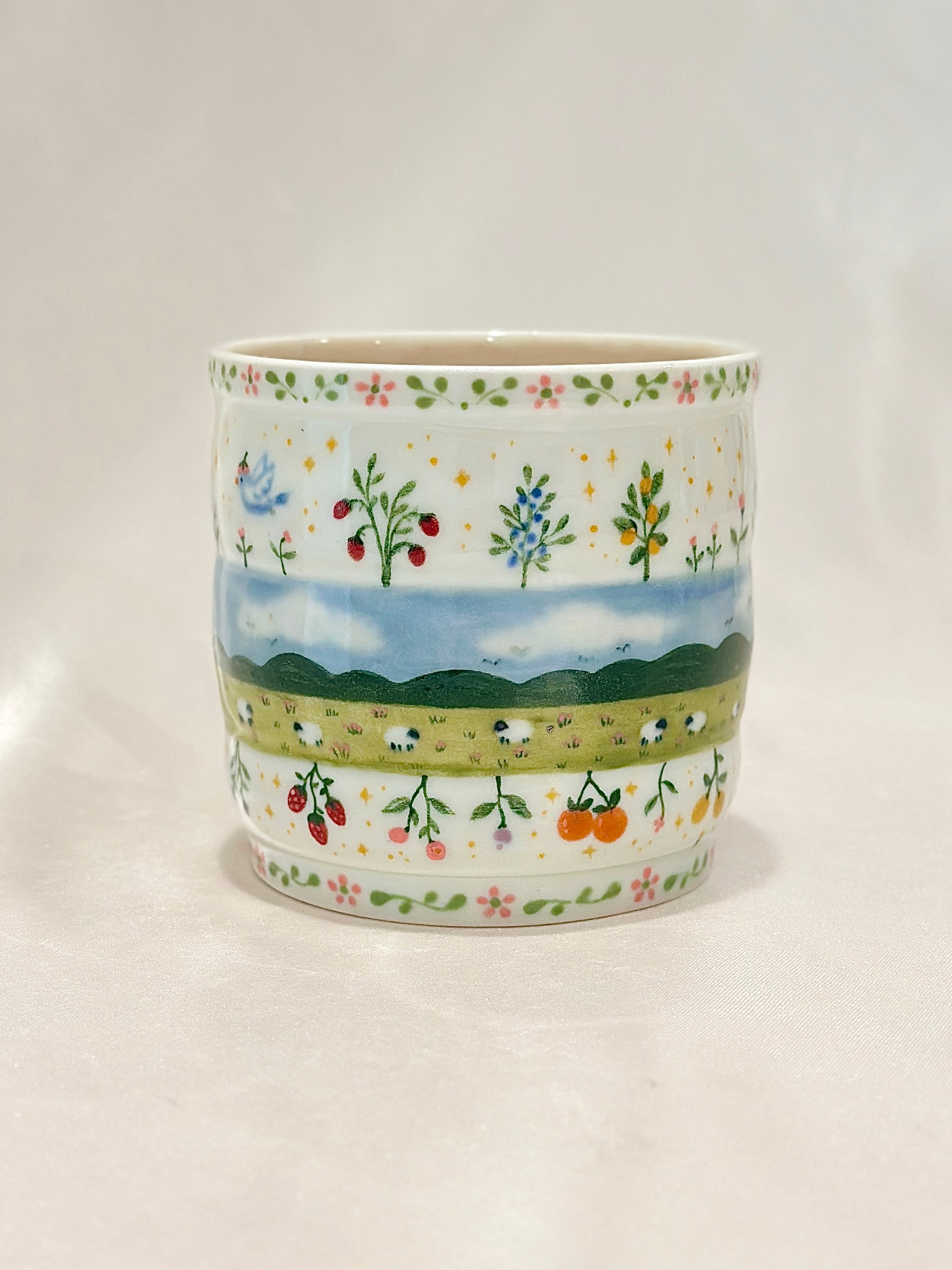 Rolling green hills dotted with sheep stretch beneath a golden sun, framed by blooming flowers, fluttering bluebirds, and sweet fruits. This mug invites you to pause, breathe, and taste the quiet abundance of life. Please note: Some speckles ✨