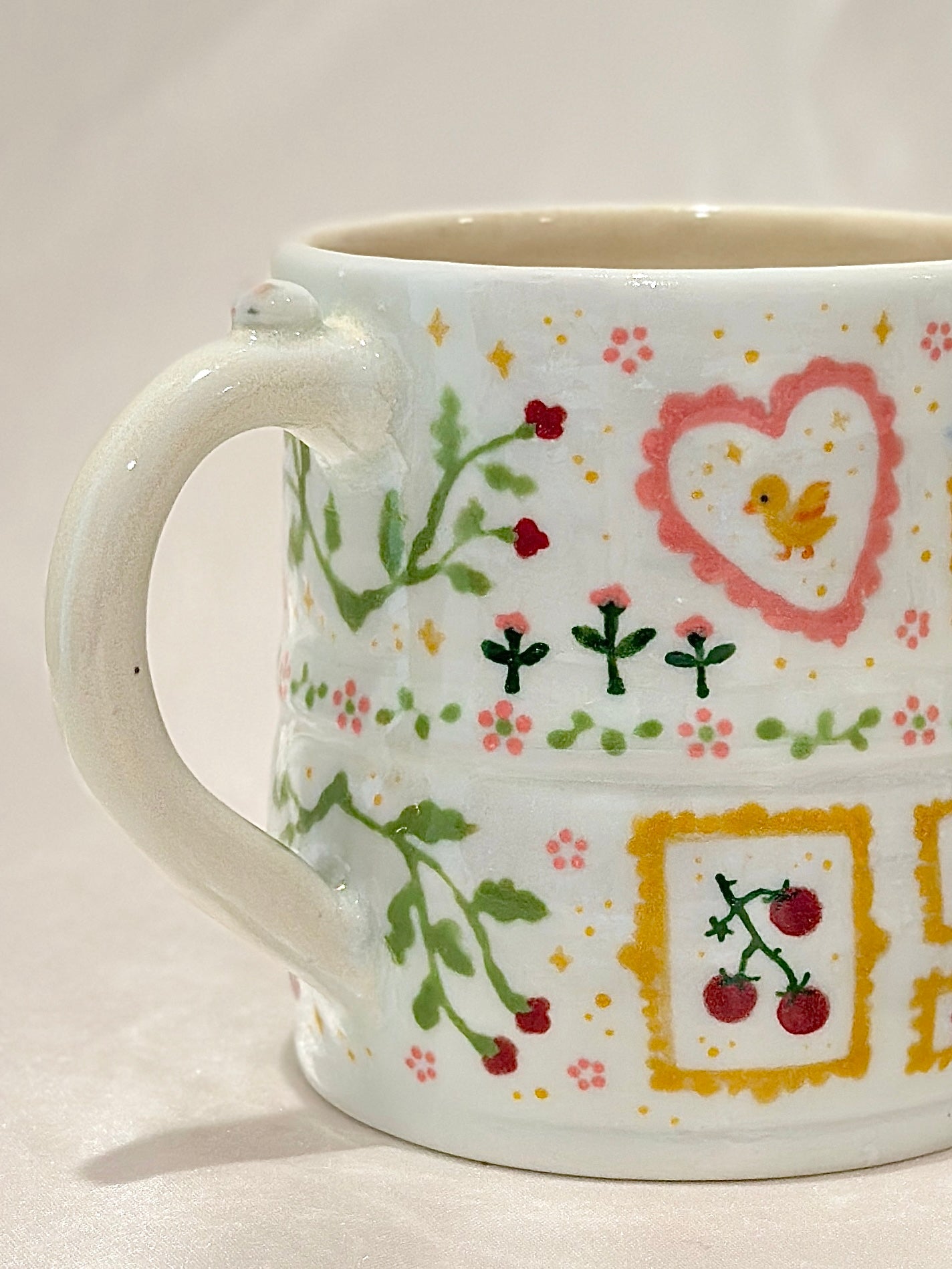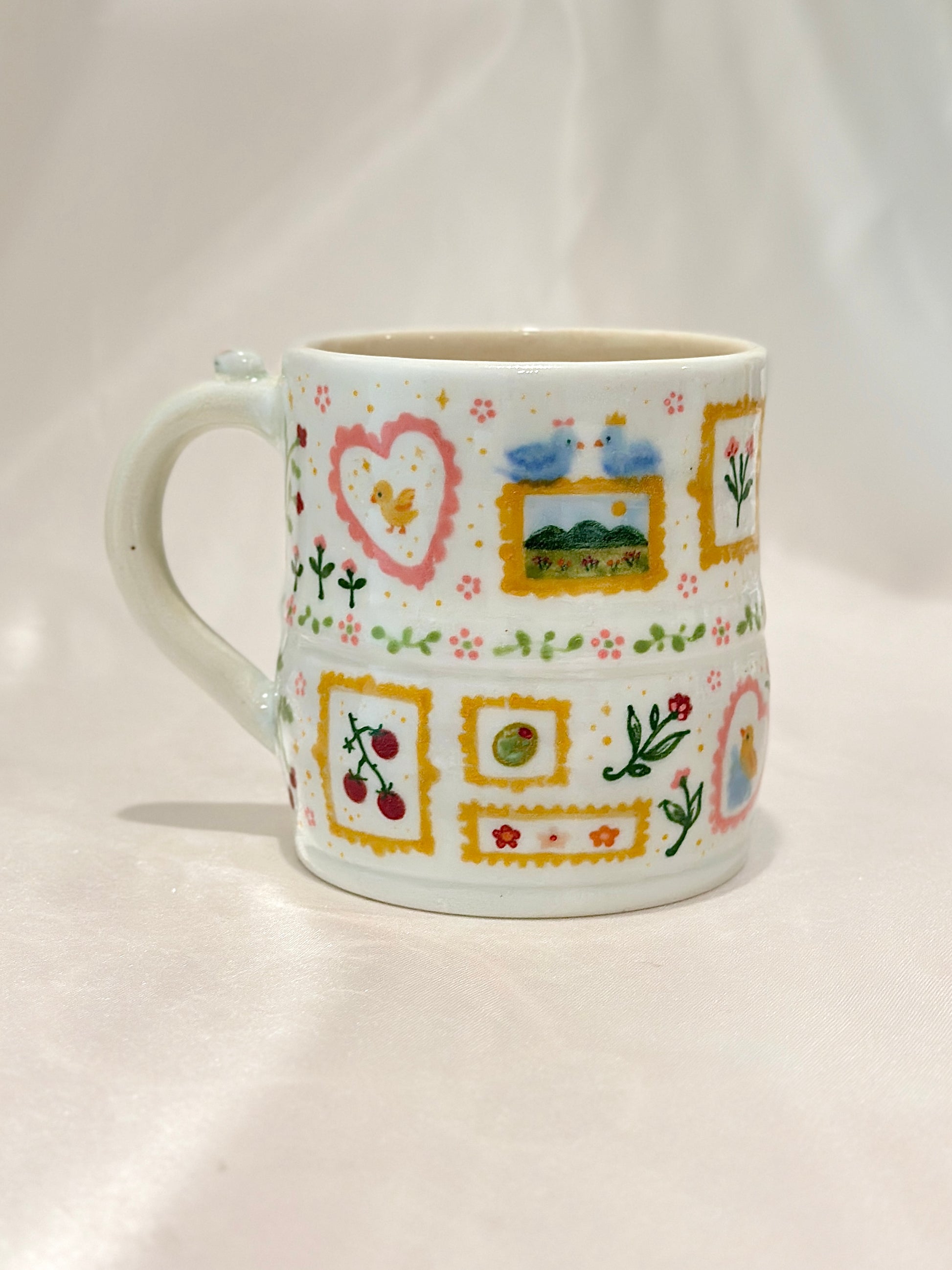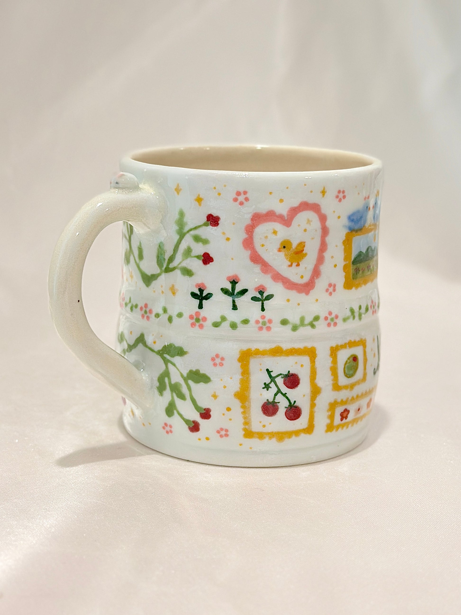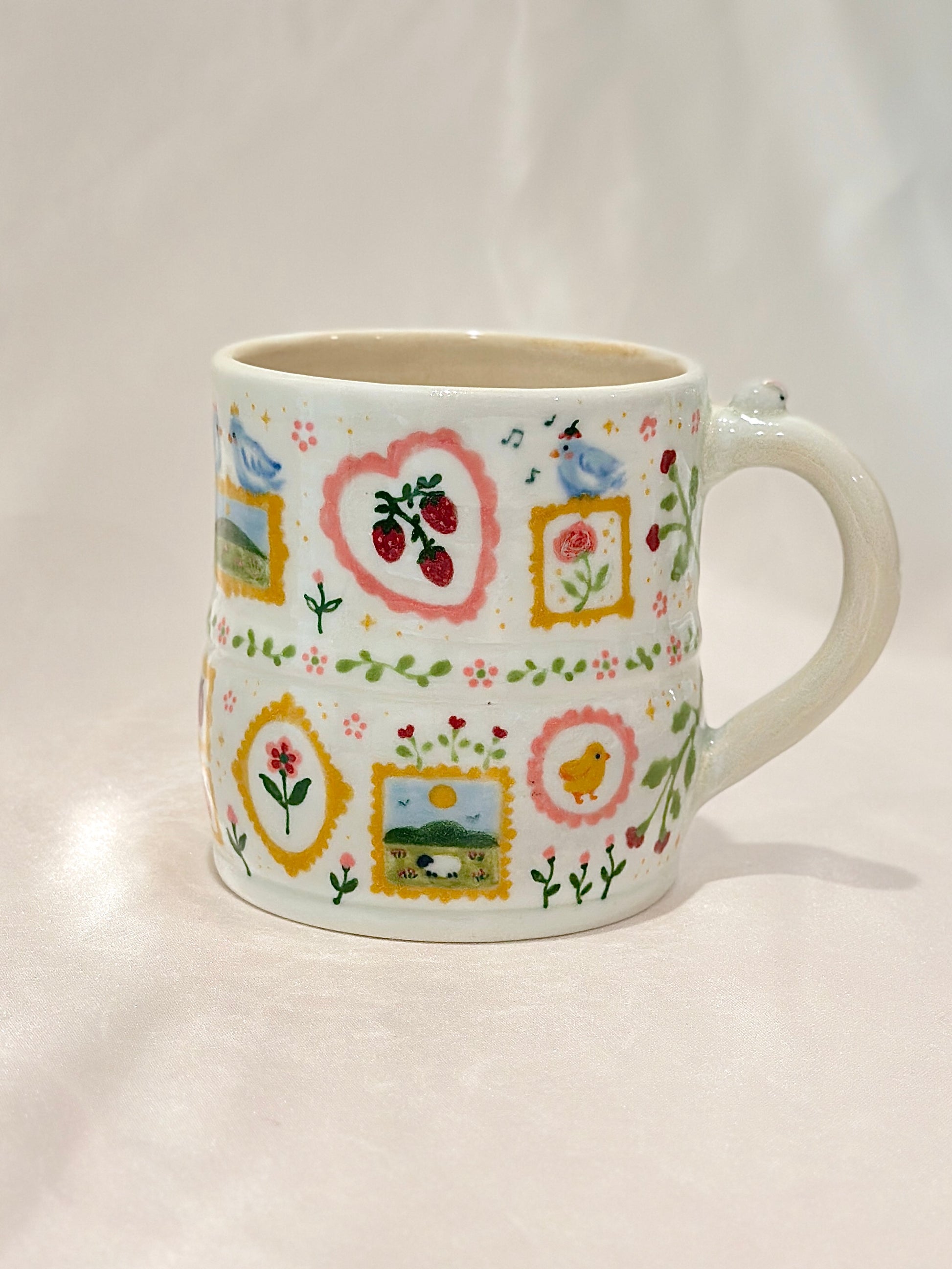 Little painted frames circle the mug like treasures on display, strawberries, roses, chicks, and fields beneath the sun. It feels like a collection of tiny memories, each one full of sweetness and light 🖼️