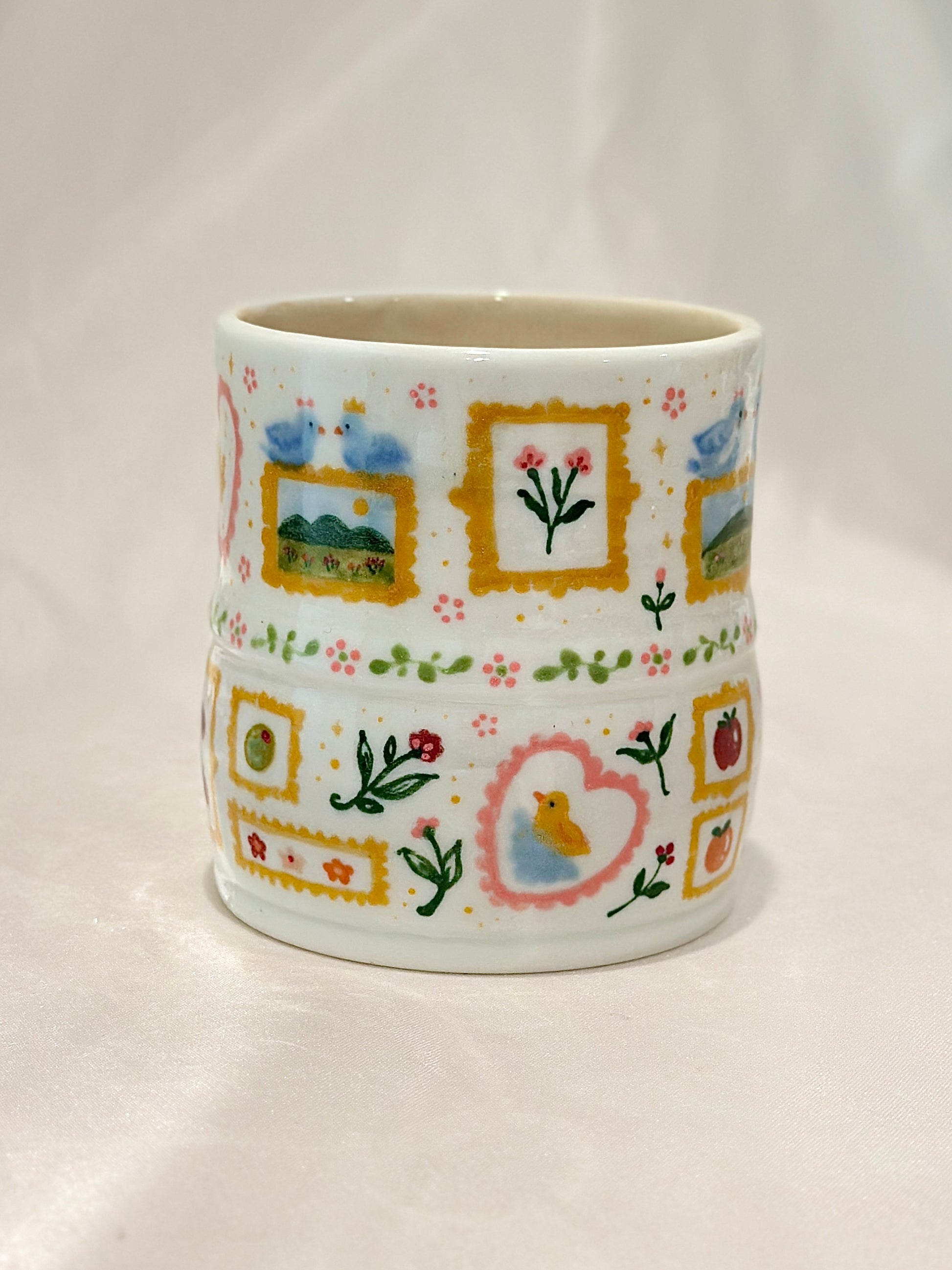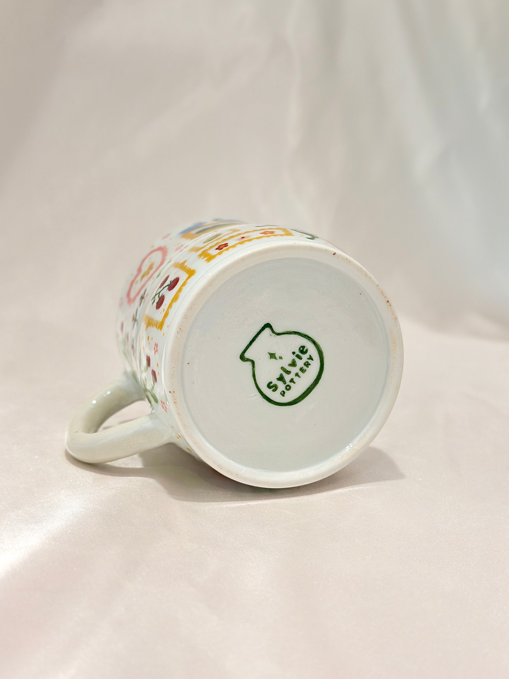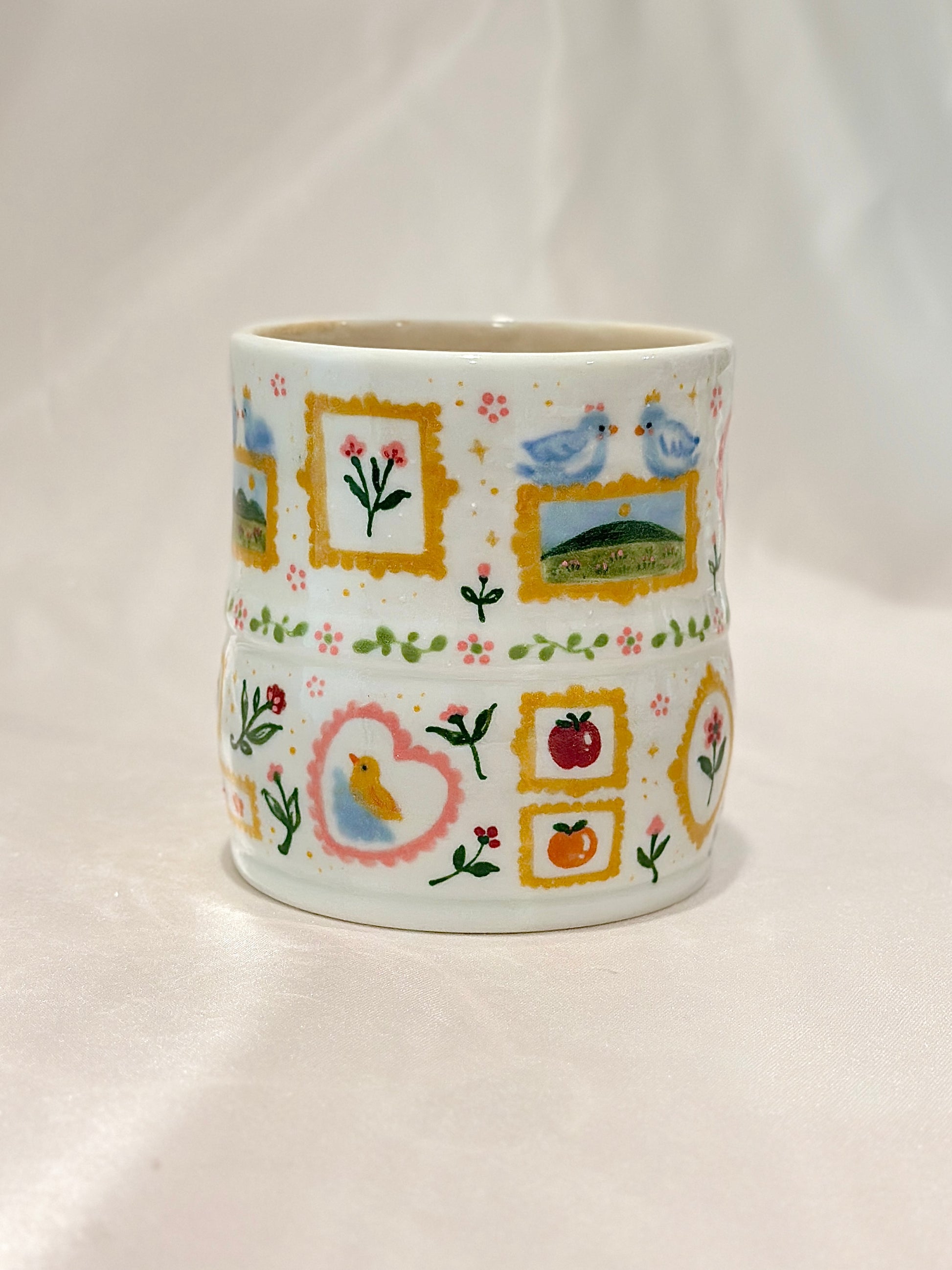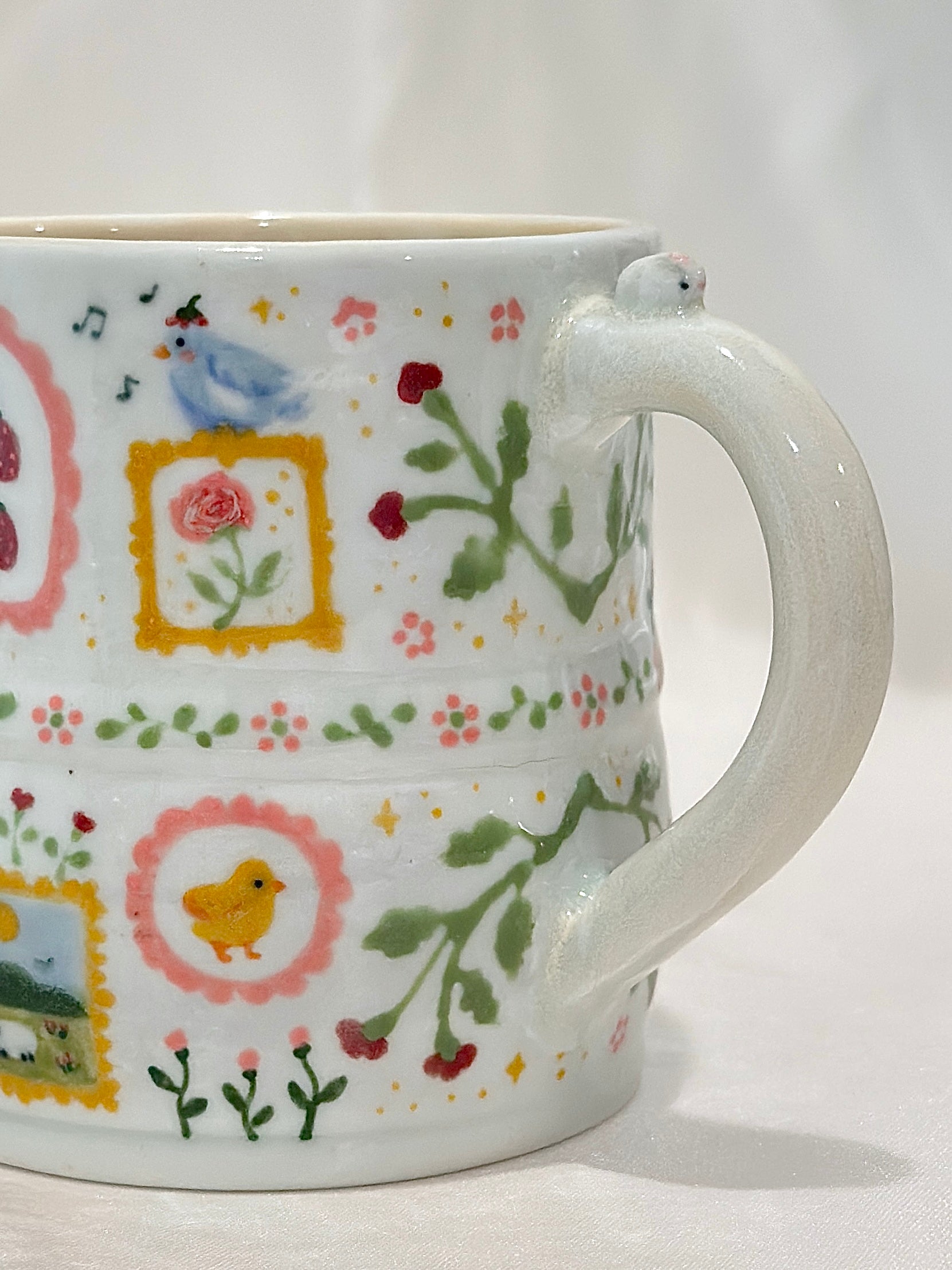 Little painted frames circle the mug like treasures on display, strawberries, roses, chicks, and fields beneath the sun. It feels like a collection of tiny memories, each one full of sweetness and light 🖼️