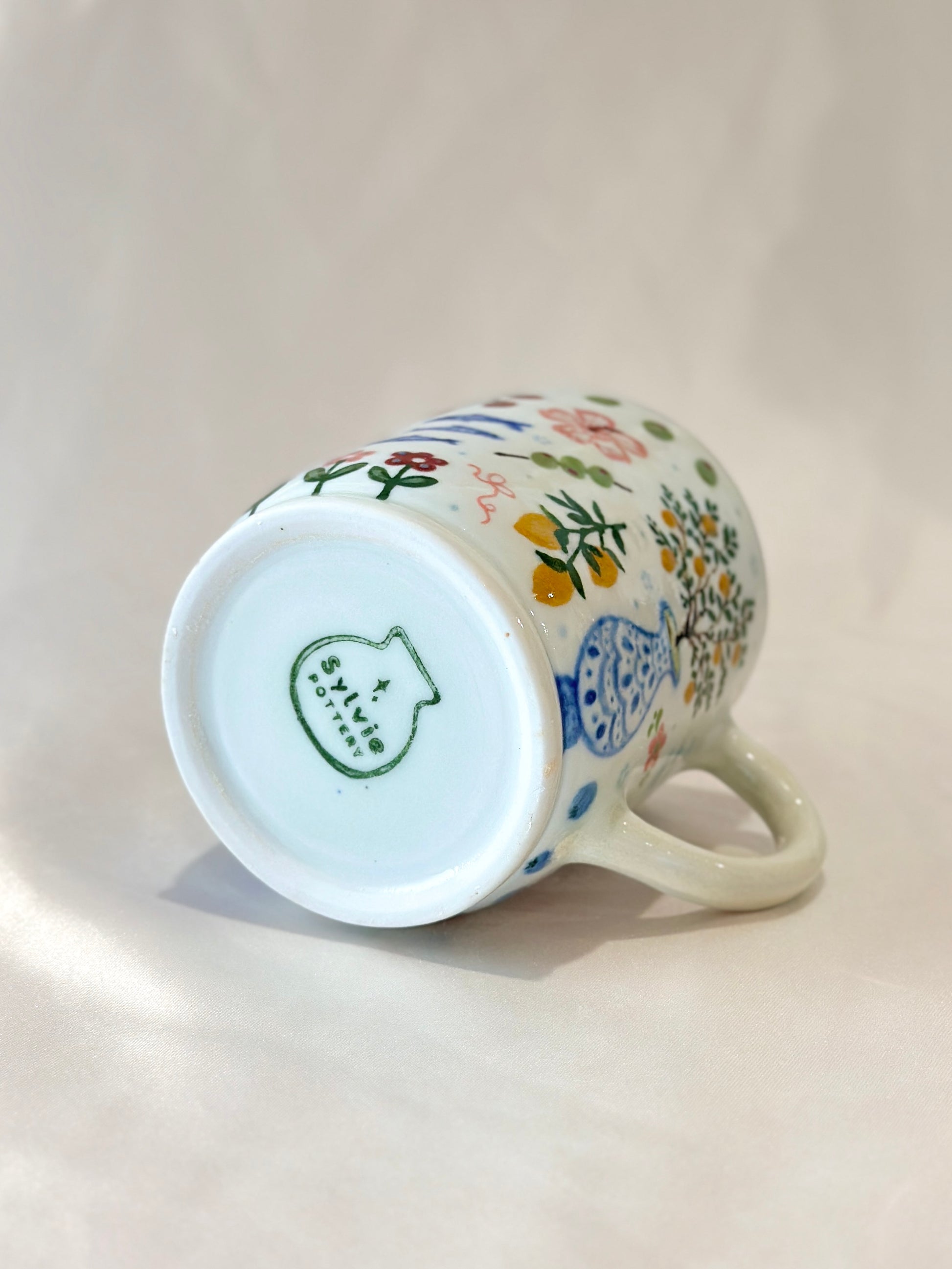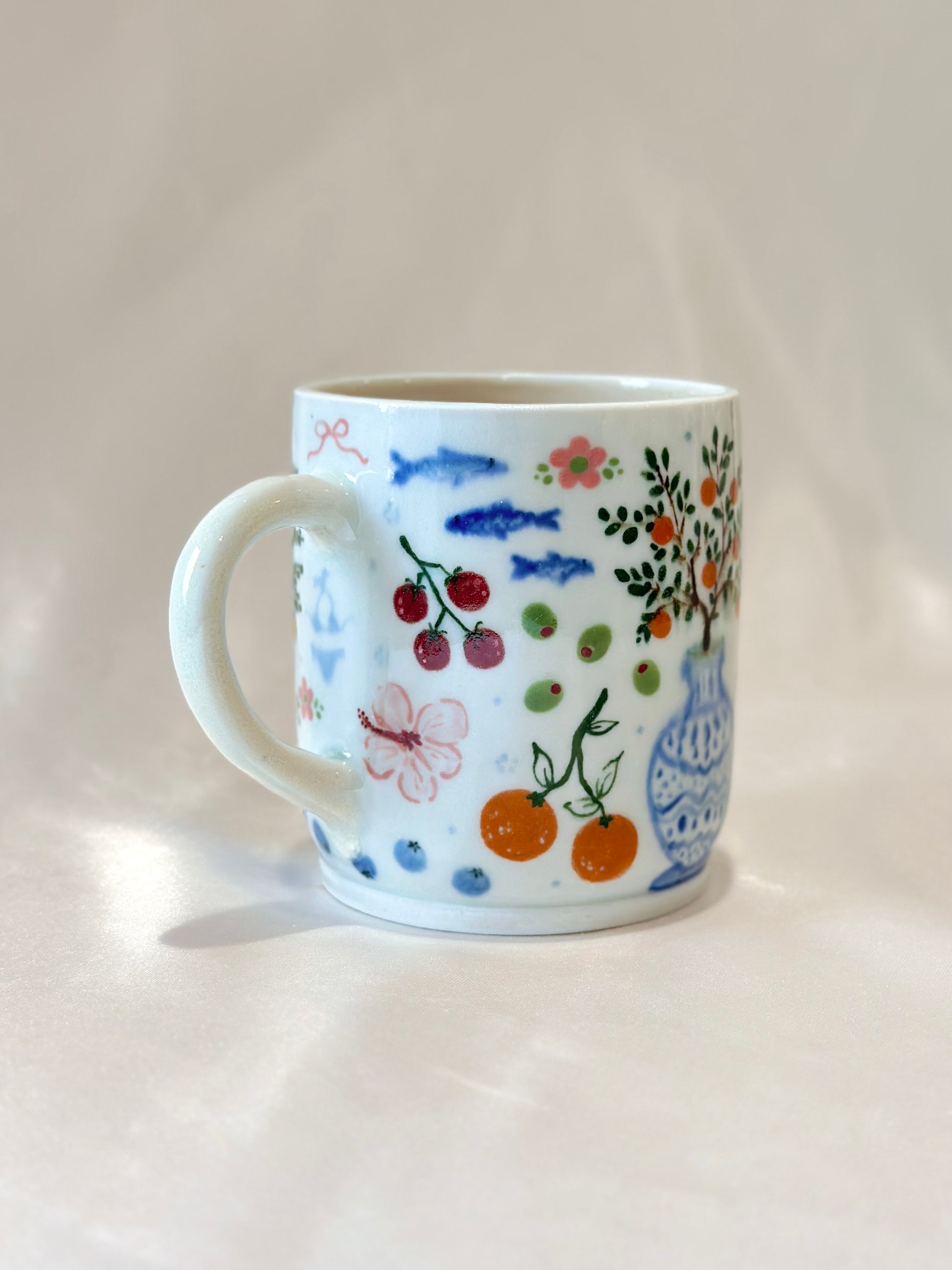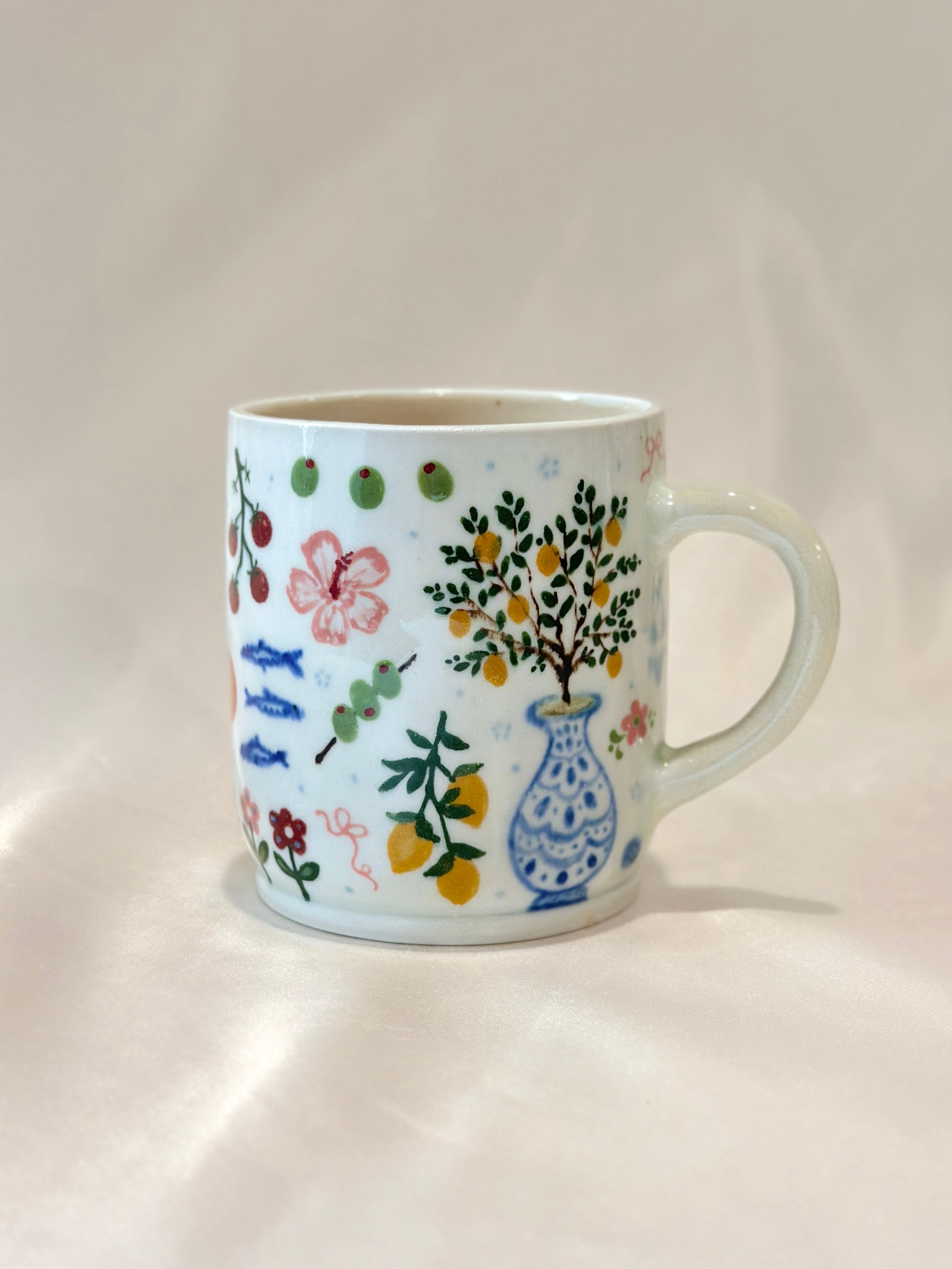 A hand-painted orchard of citrus trees, olives, fruits, tomatoes, and tiny sardines wraps tenderly around the porcelain mug, playful, colorful, and full of life. This piece is meant to remind you that beauty is always blooming, even in the smallest details of life. May it bring you warmth with each sip 🍋