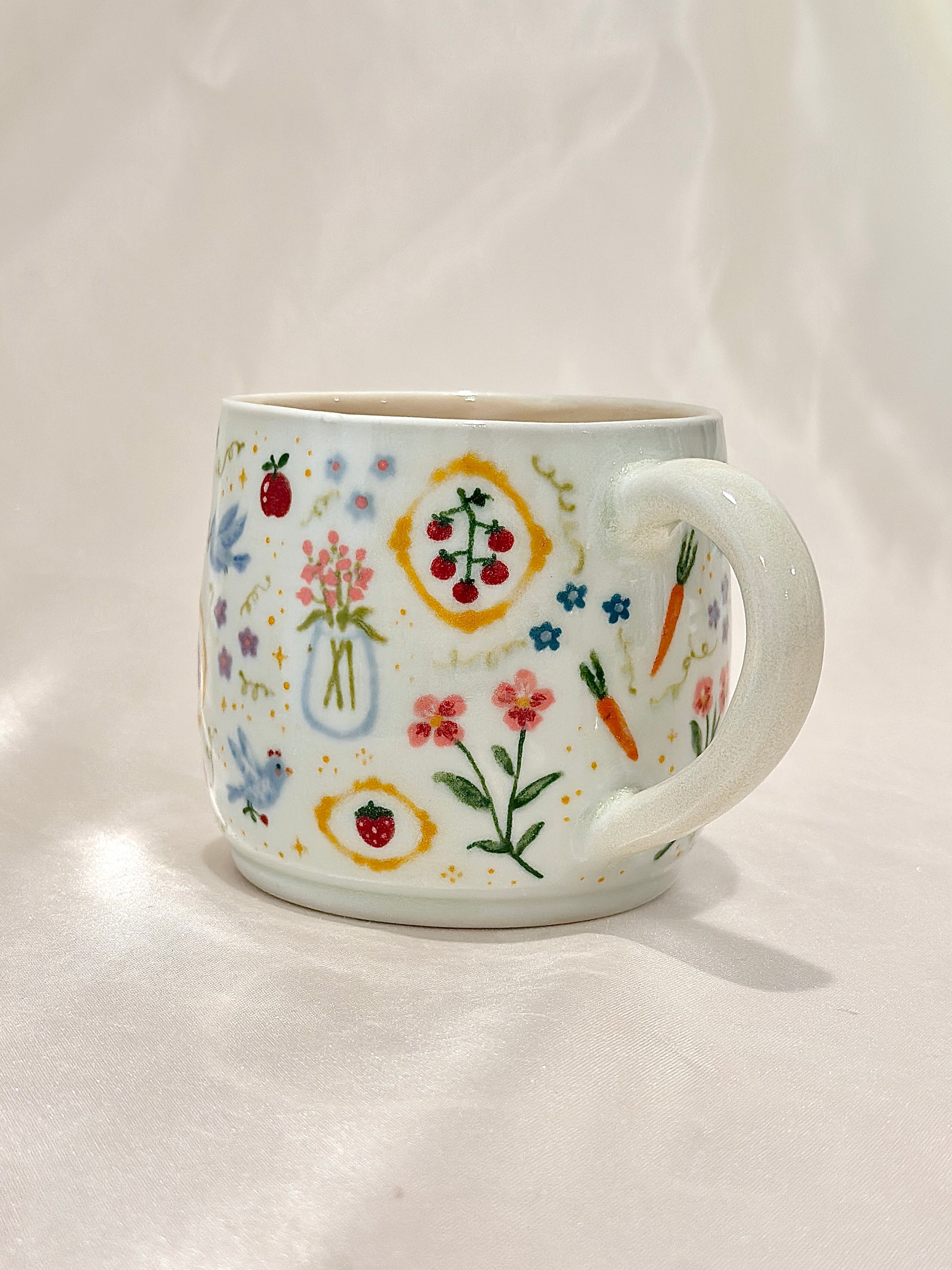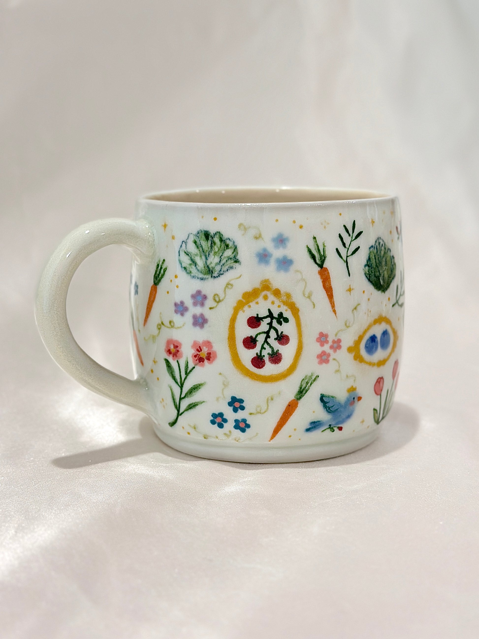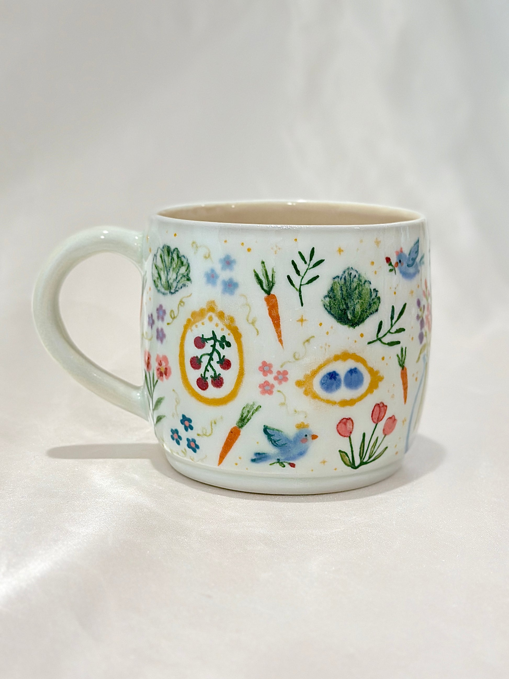 Painted veggies, blossoms, and bluebirdies gather like a farmer’s market in porcelain. This mug feels abundant and earthy, celebrating the beauty of simple nourishment and joyful gardens. Please note: Slightly wonky rim 🌱