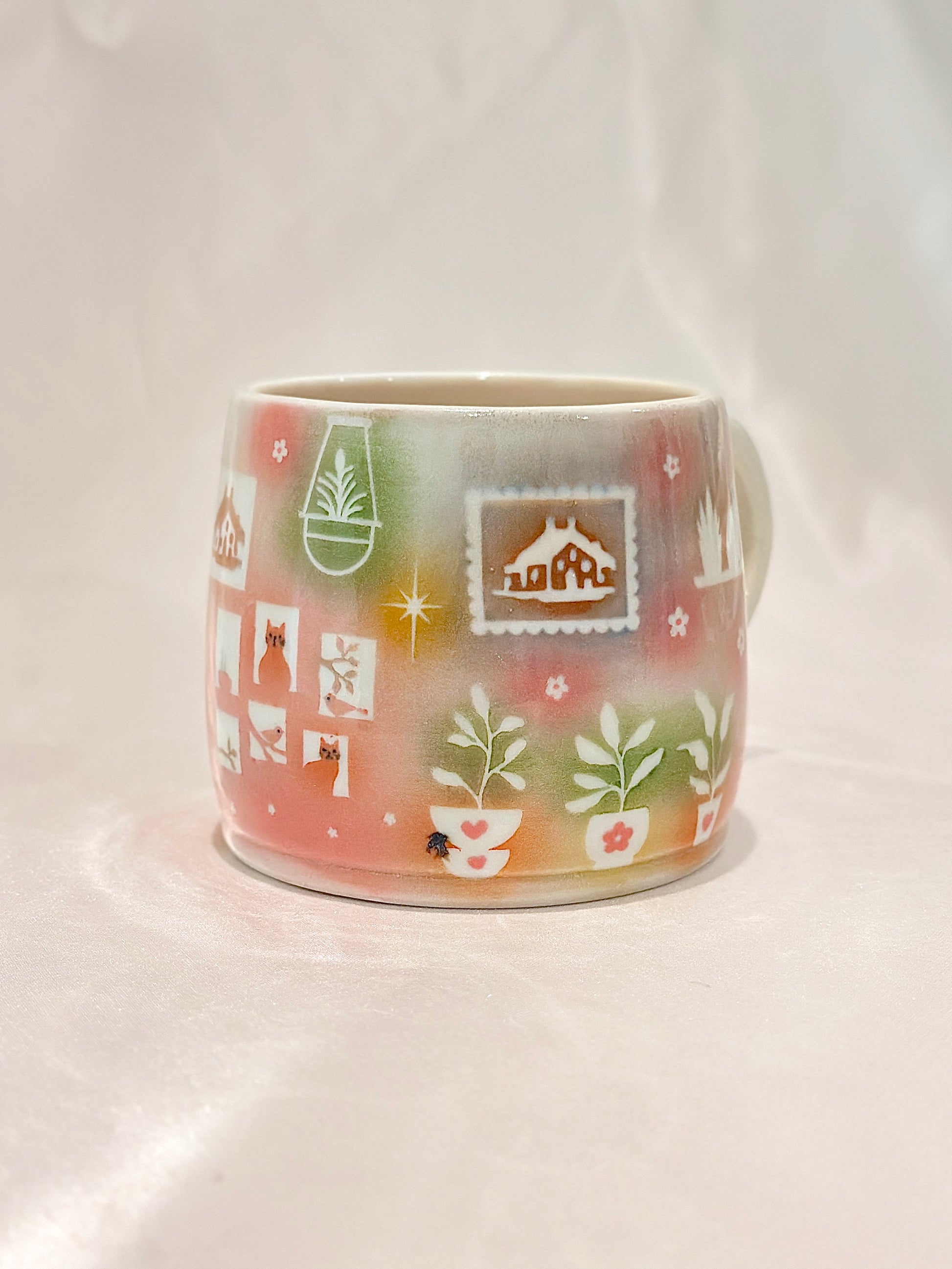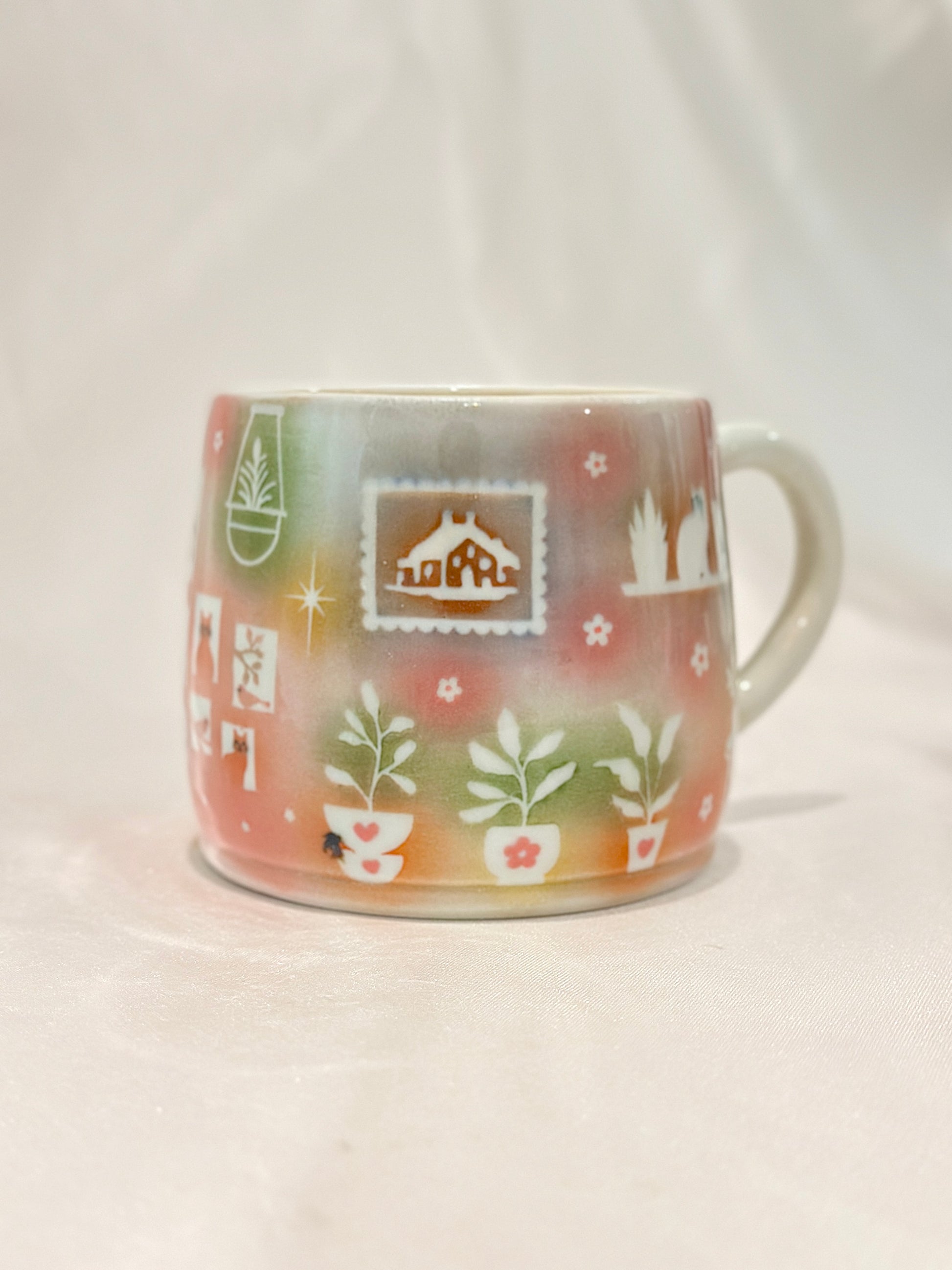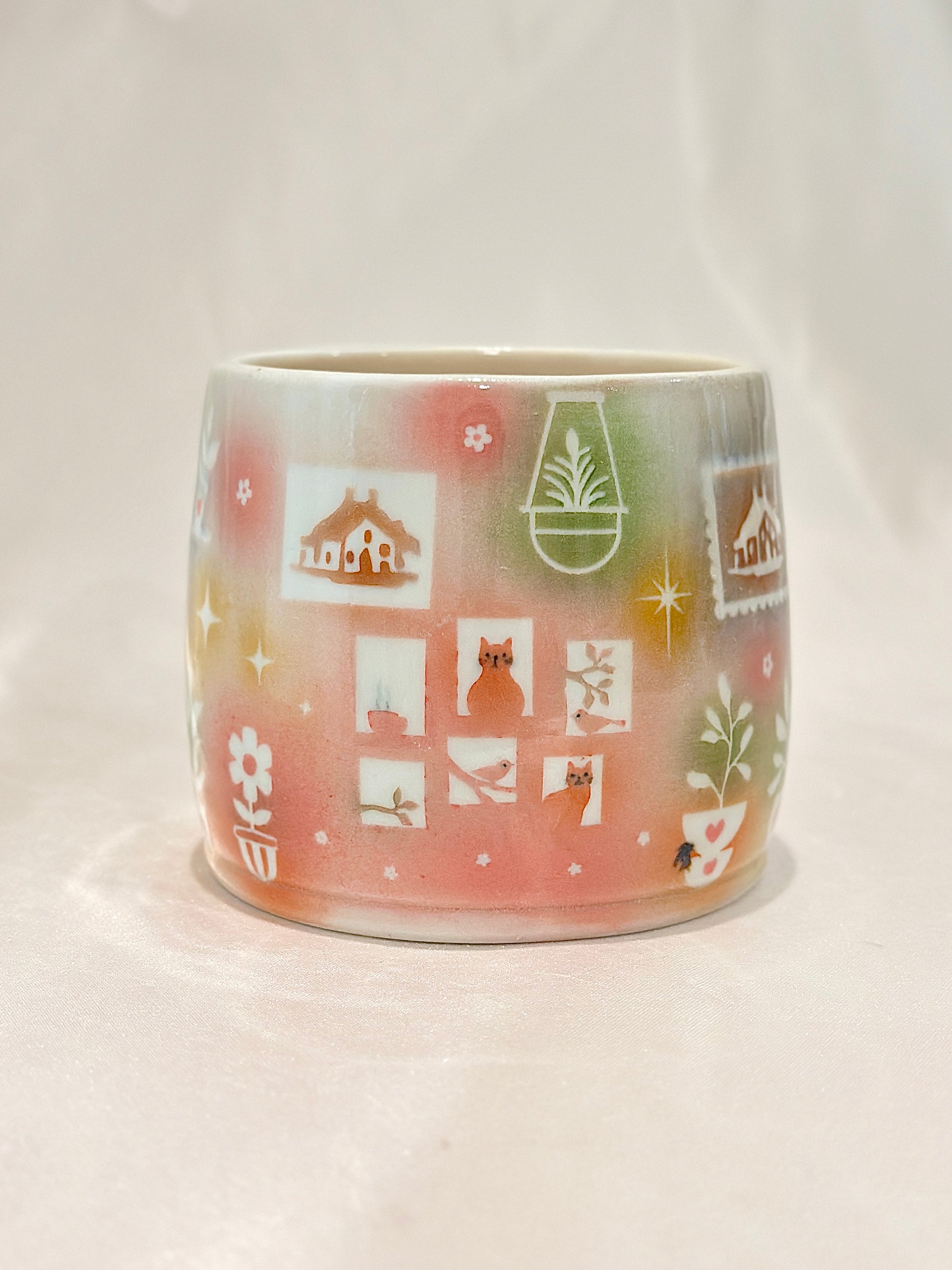 Soft washes of pastels hold tiny scenes, potted plants, a glowing cottage, and curious cats. This mug embodies the coziness of home, filled with warmth and quiet delight. Please note: One small speckle shown in photos 🪴