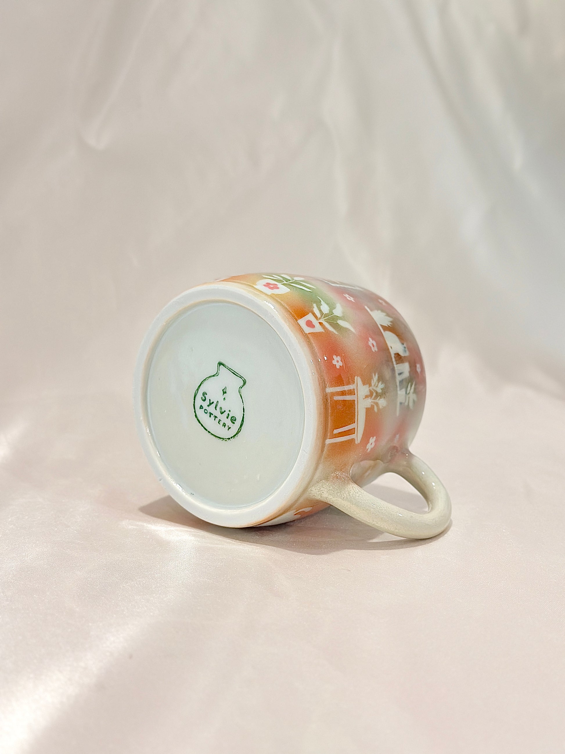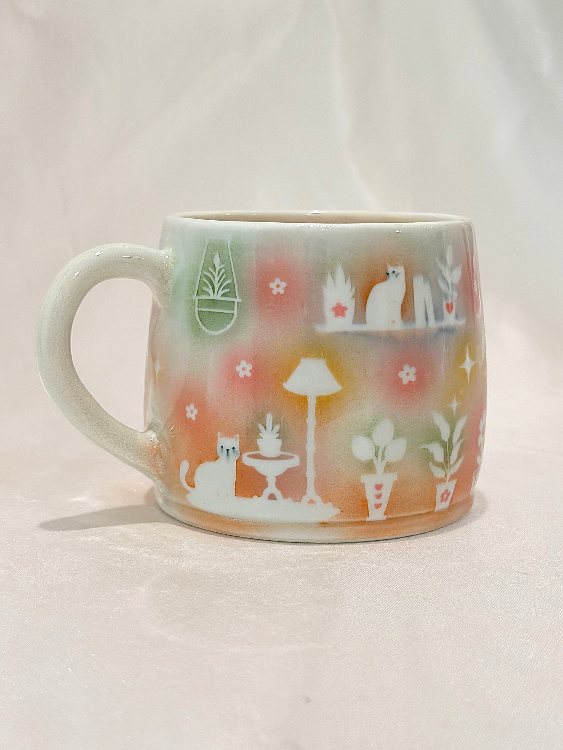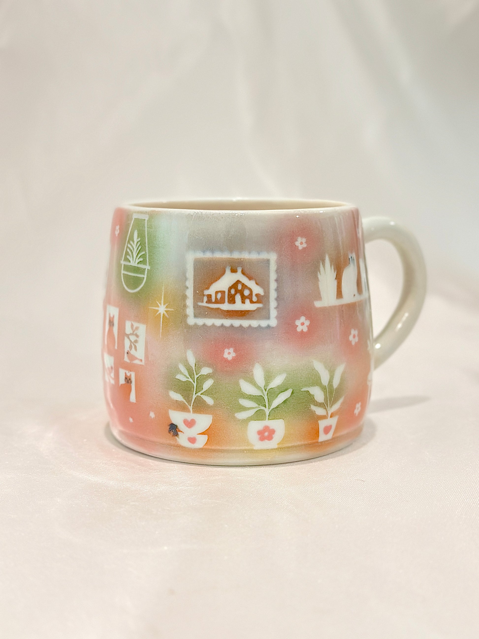 Soft washes of pastels hold tiny scenes, potted plants, a glowing cottage, and curious cats. This mug embodies the coziness of home, filled with warmth and quiet delight. Please note: One small speckle shown in photos 🪴