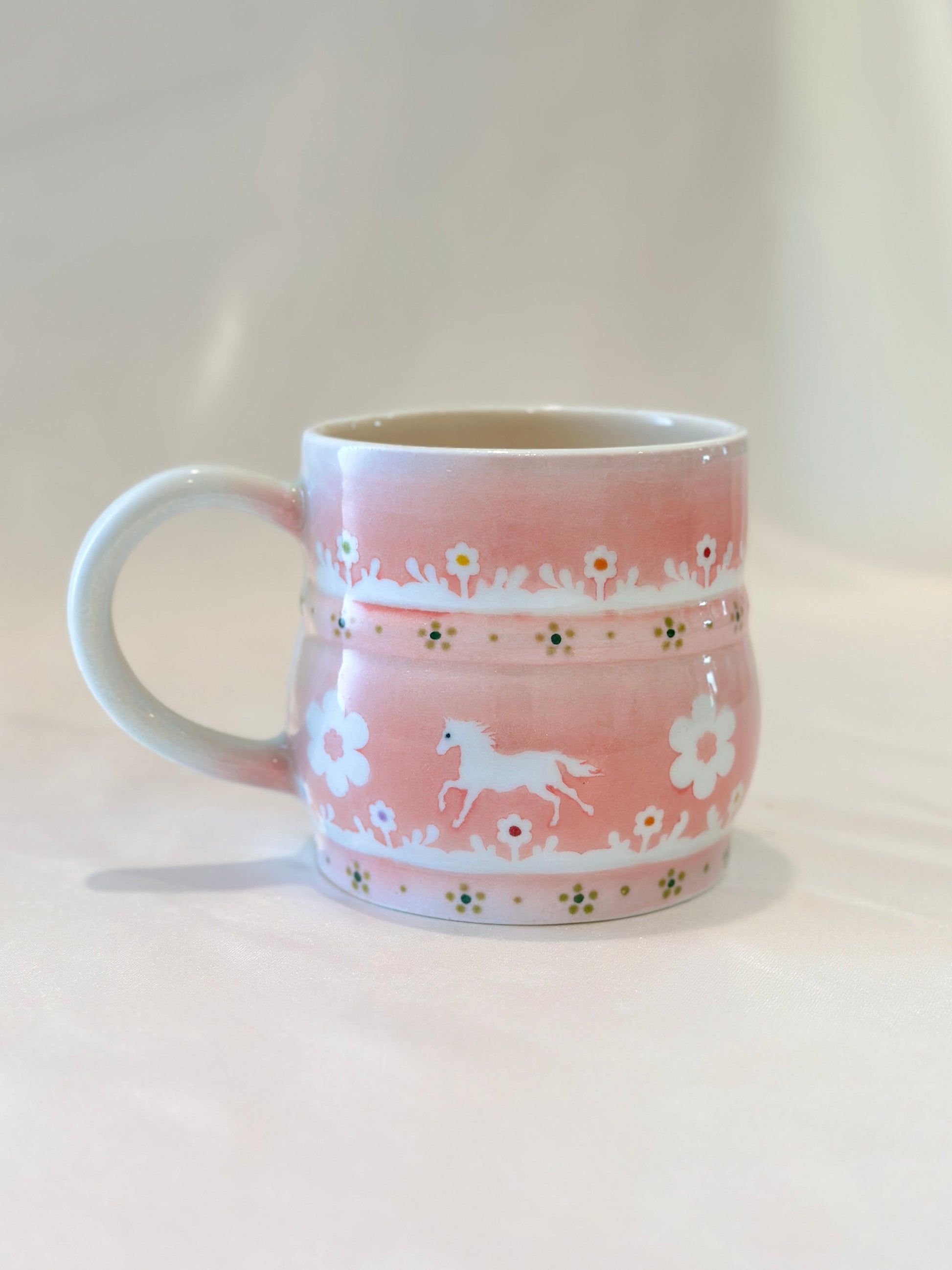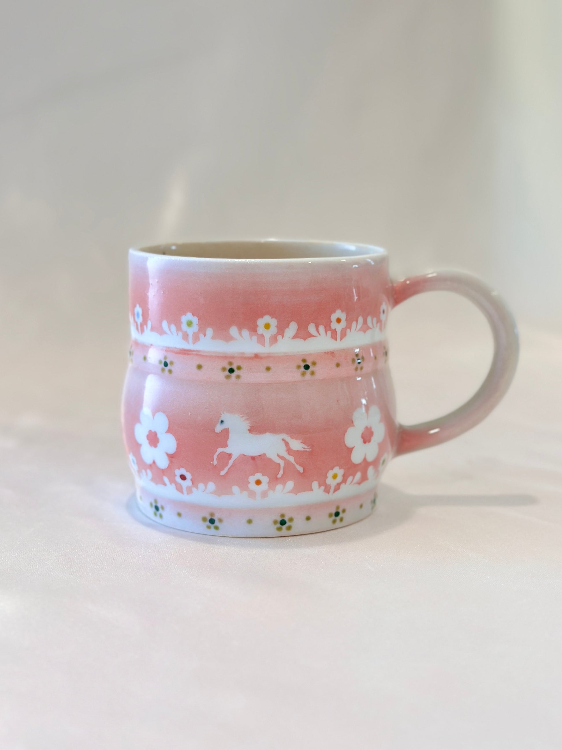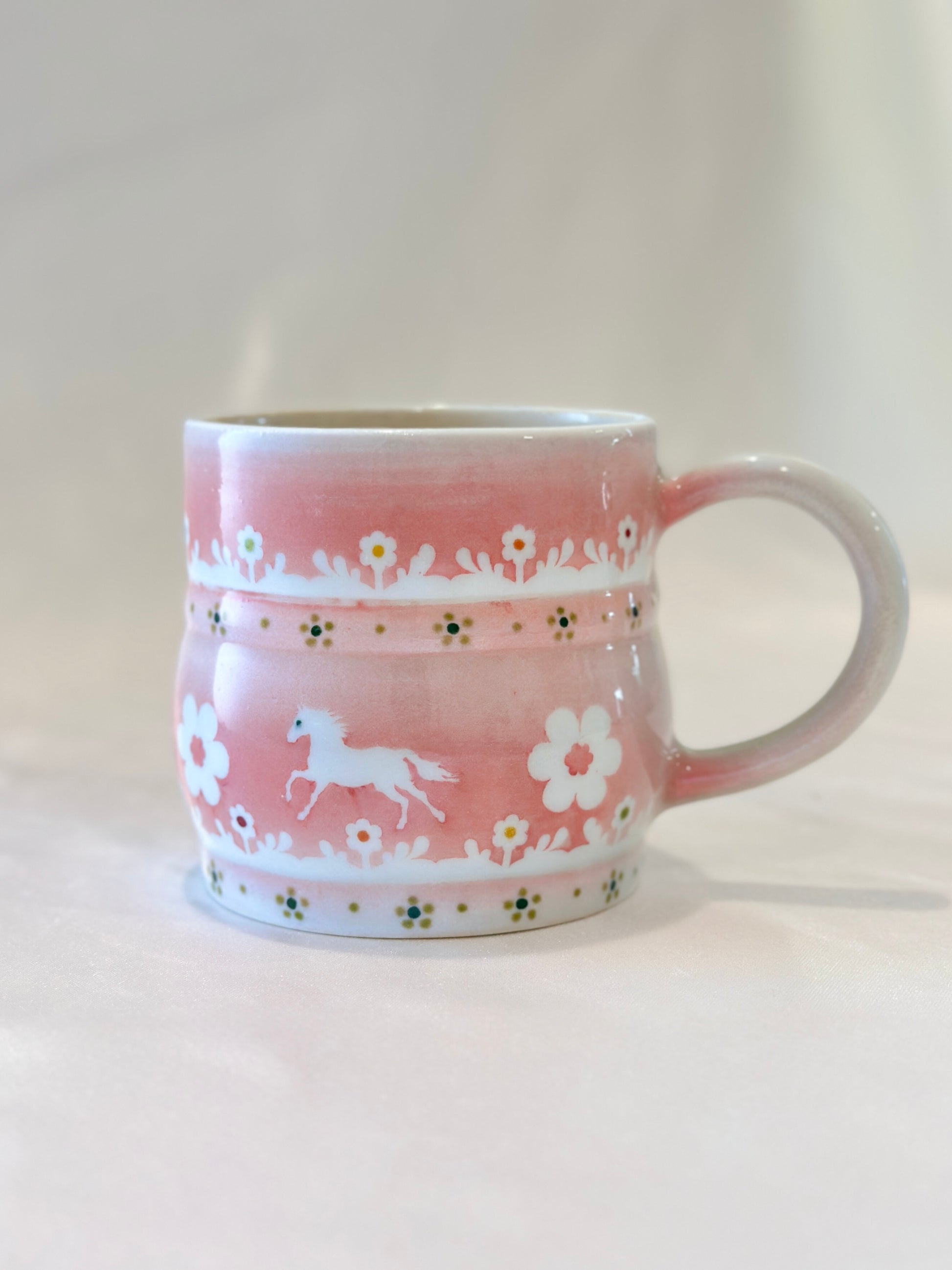 A soft blush glaze sets the stage for trotting white horses surrounded by blooming daisies and delicate foliage. This mug feels like a field daydream, simple and sweet,  made to carry a little grace into your everyday moments. Please note: slight wonky rim🐎