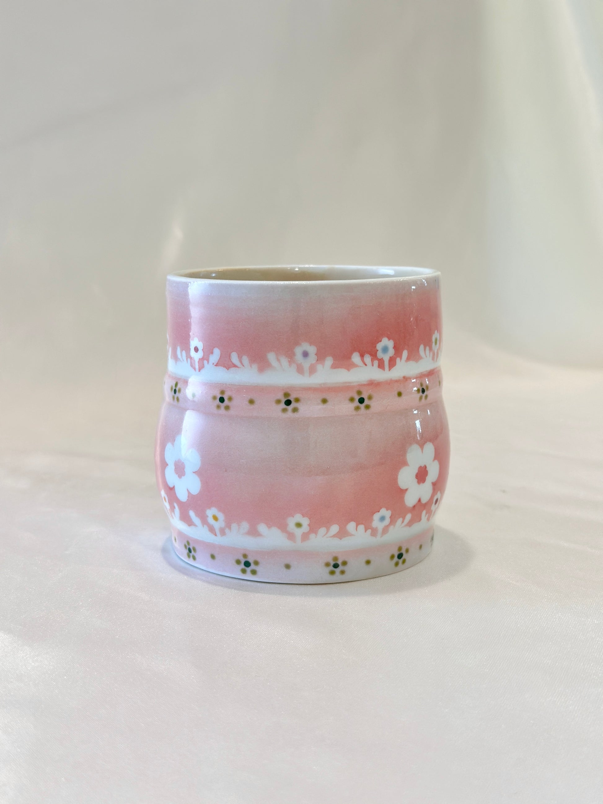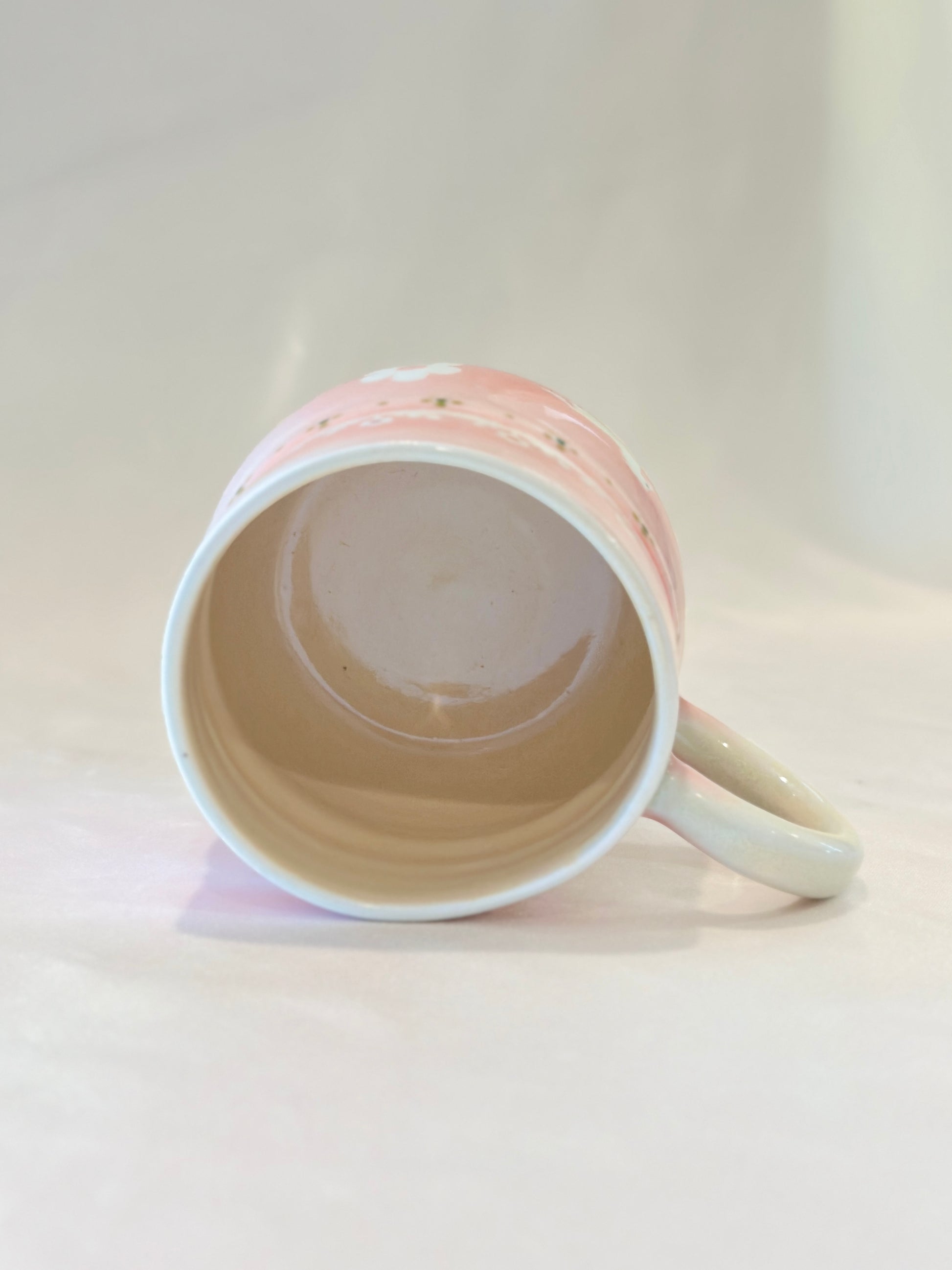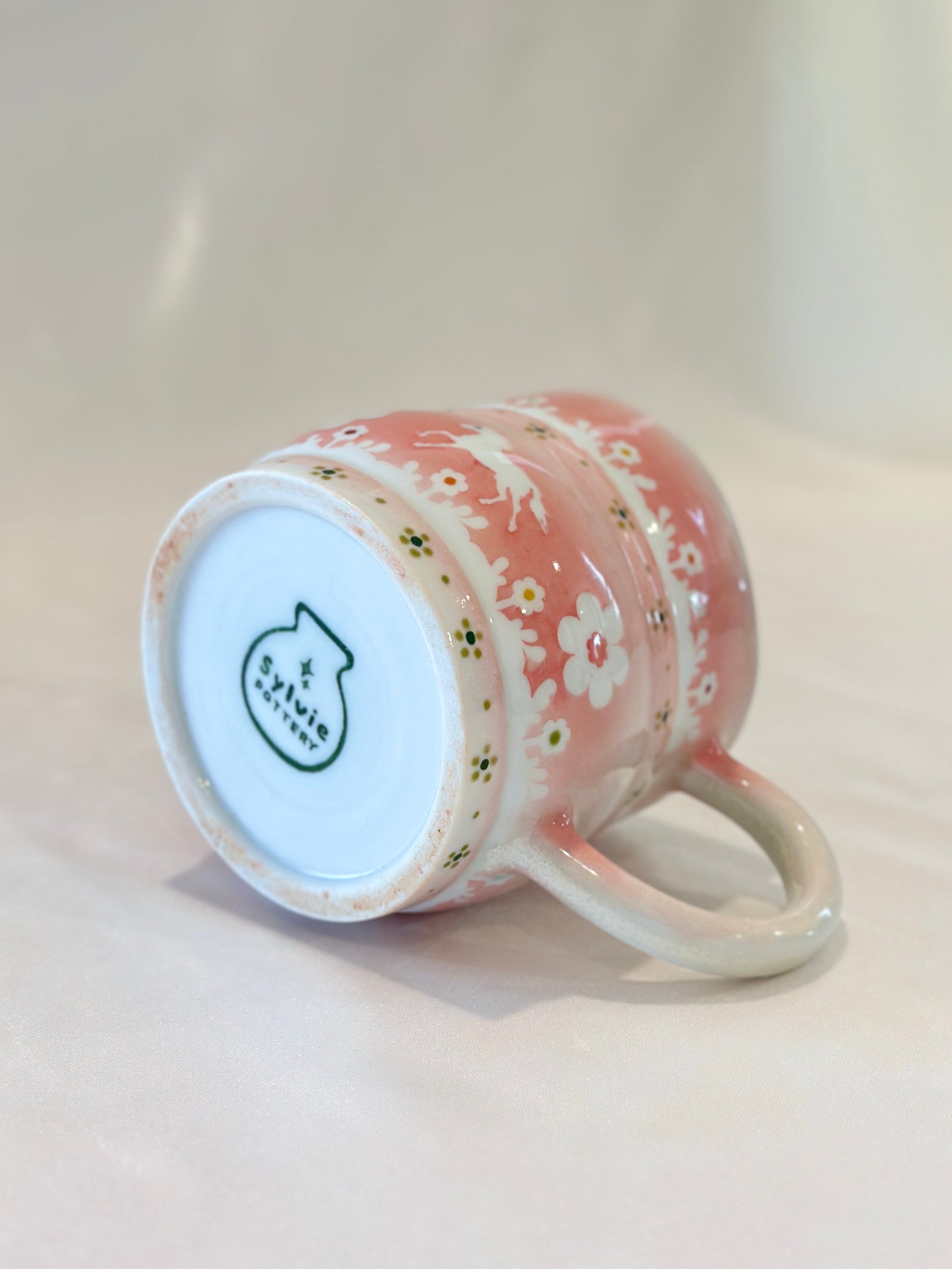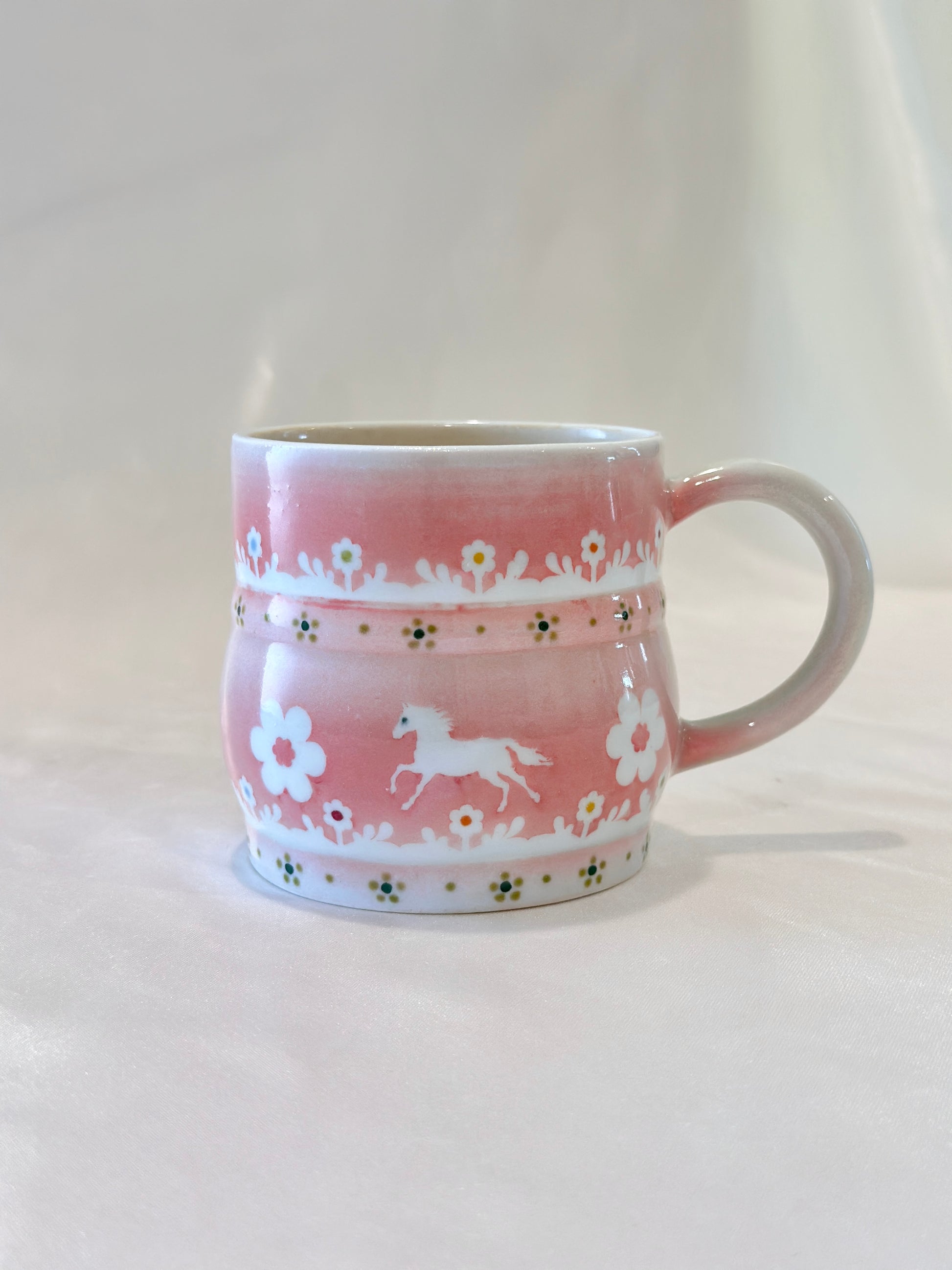 A soft blush glaze sets the stage for trotting white horses surrounded by blooming daisies and delicate foliage. This mug feels like a field daydream, simple and sweet,  made to carry a little grace into your everyday moments. Please note: slight wonky rim🐎