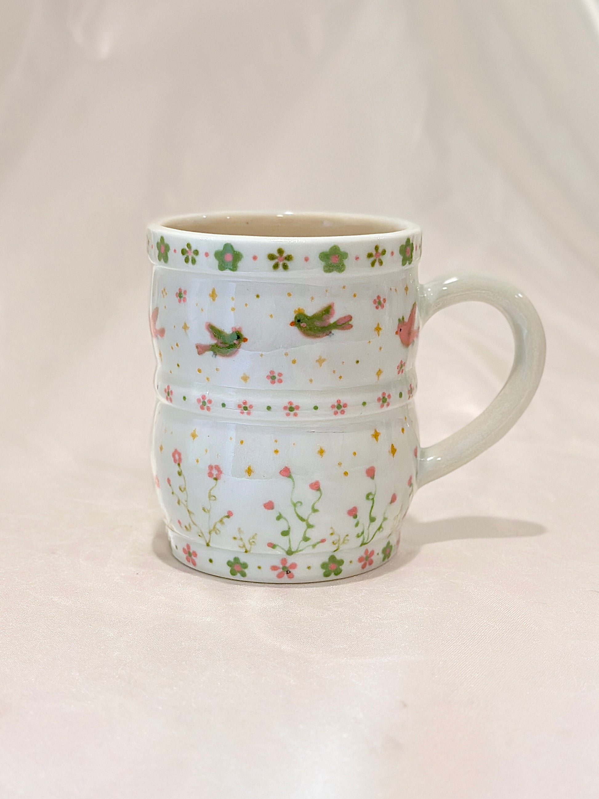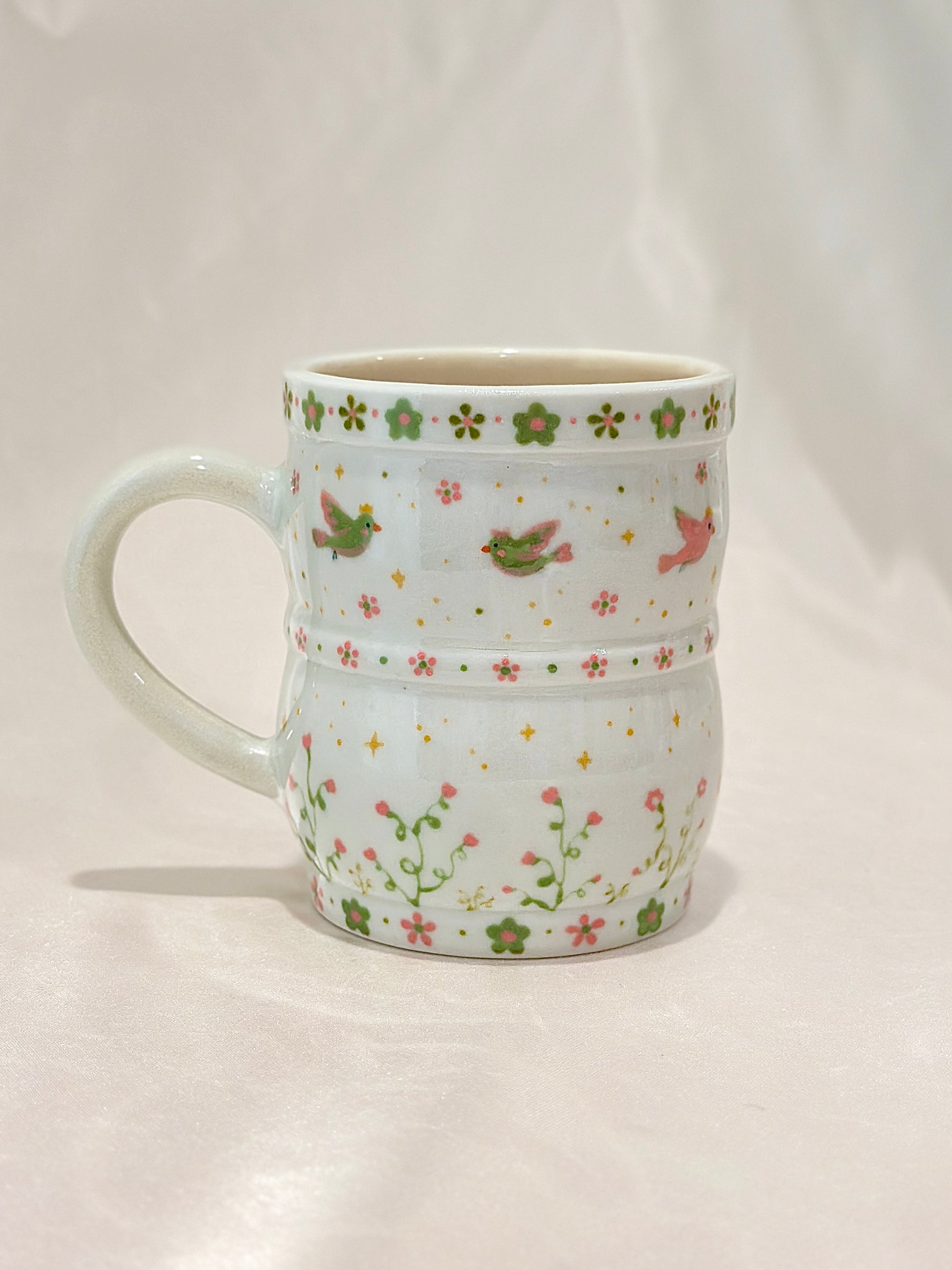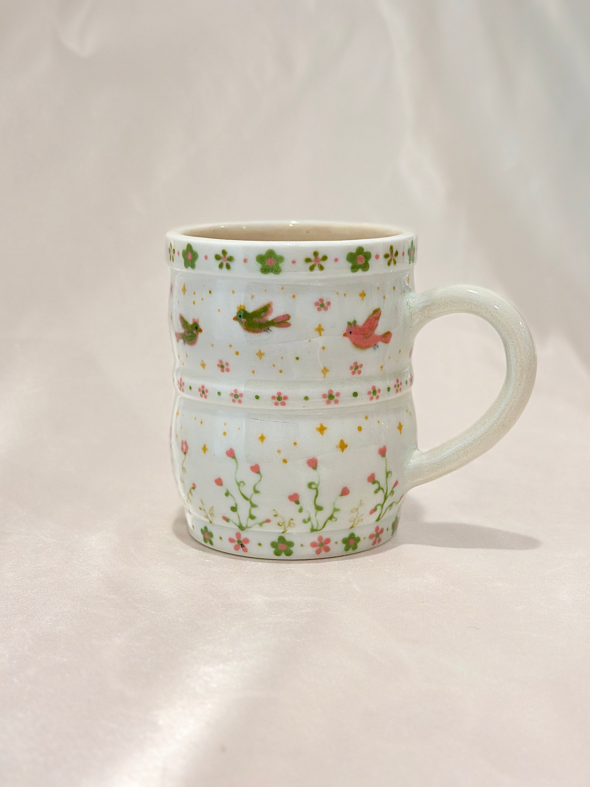 Tiny painted songbirds flutter among blossoms and stars, resting within delicate stems and gentle petals. This mug carries a reminder that every day begins with the possibility of light, renewal, and joy 🥹💚