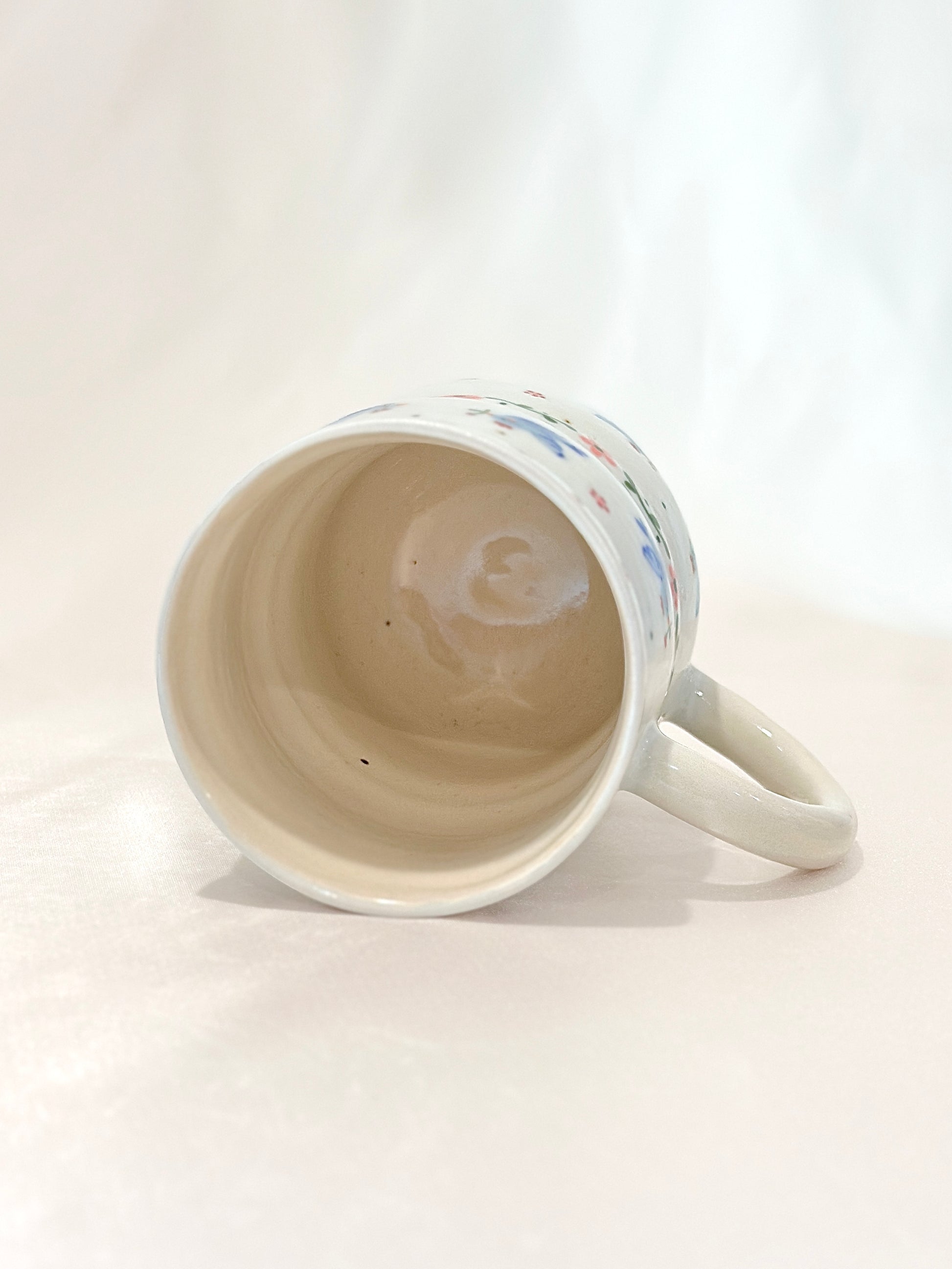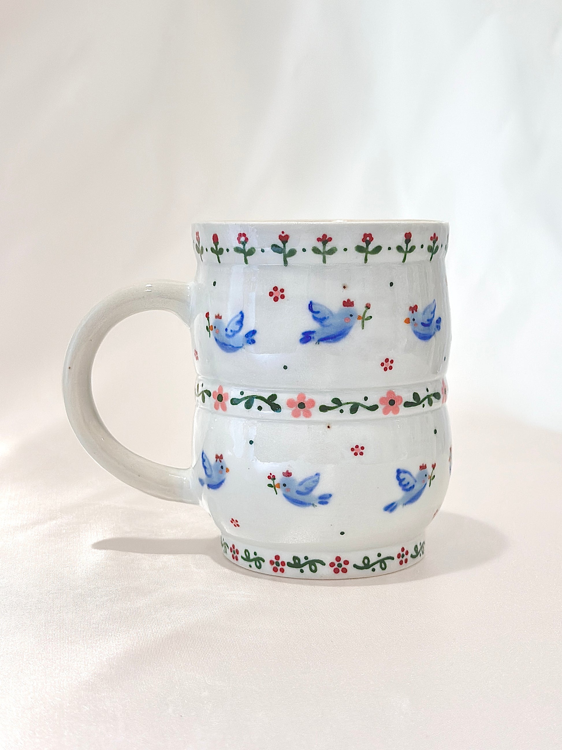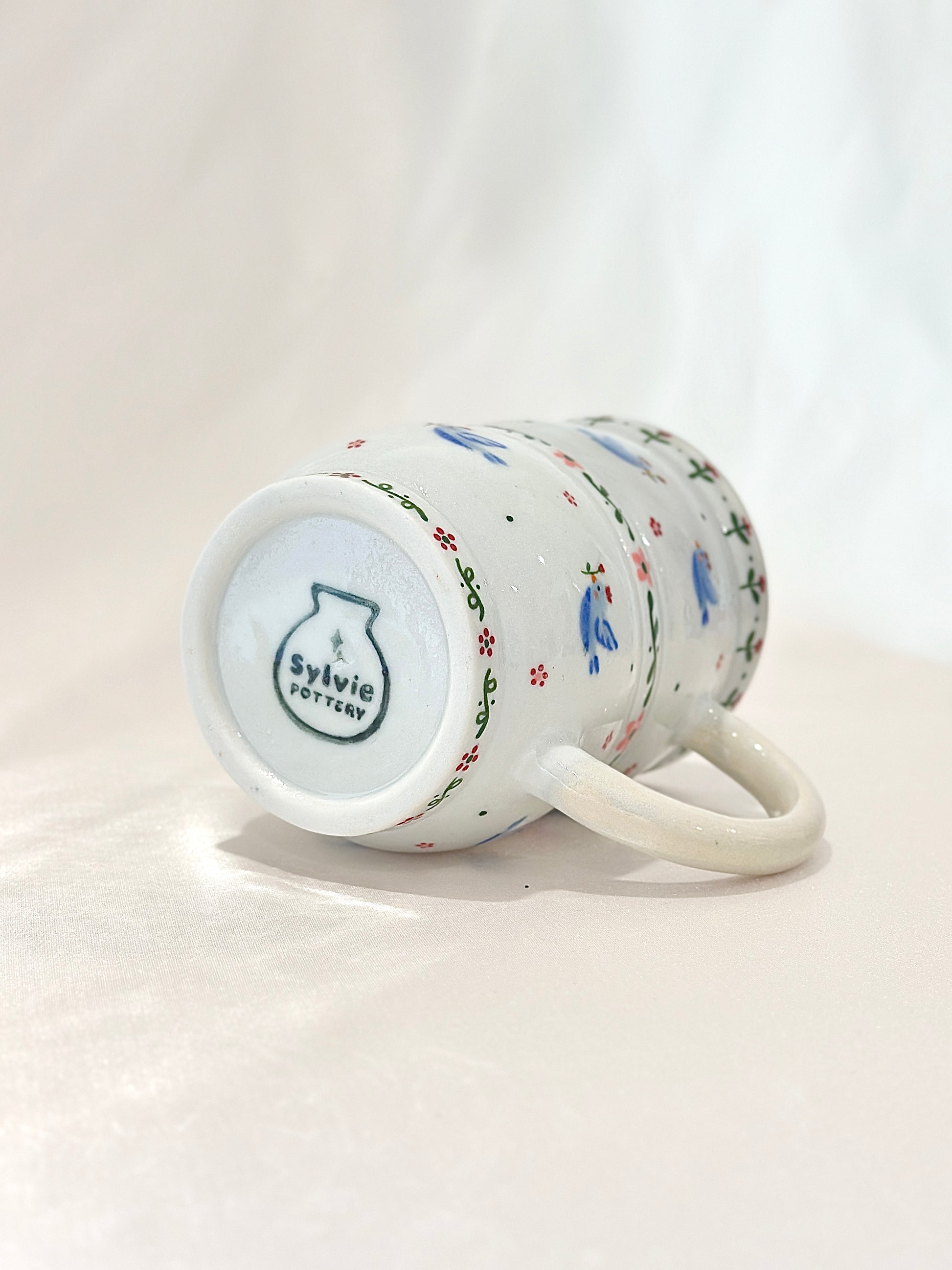 This joyful mug is adorned with bluebirds carrying tiny red flowers, fluttering between borders of bright garden blooms. The scene wraps around, creating a full circle of sweetness. A celebration of nature's tenderness and the small things that make life beautiful. Please note, some speckles interior 🪺