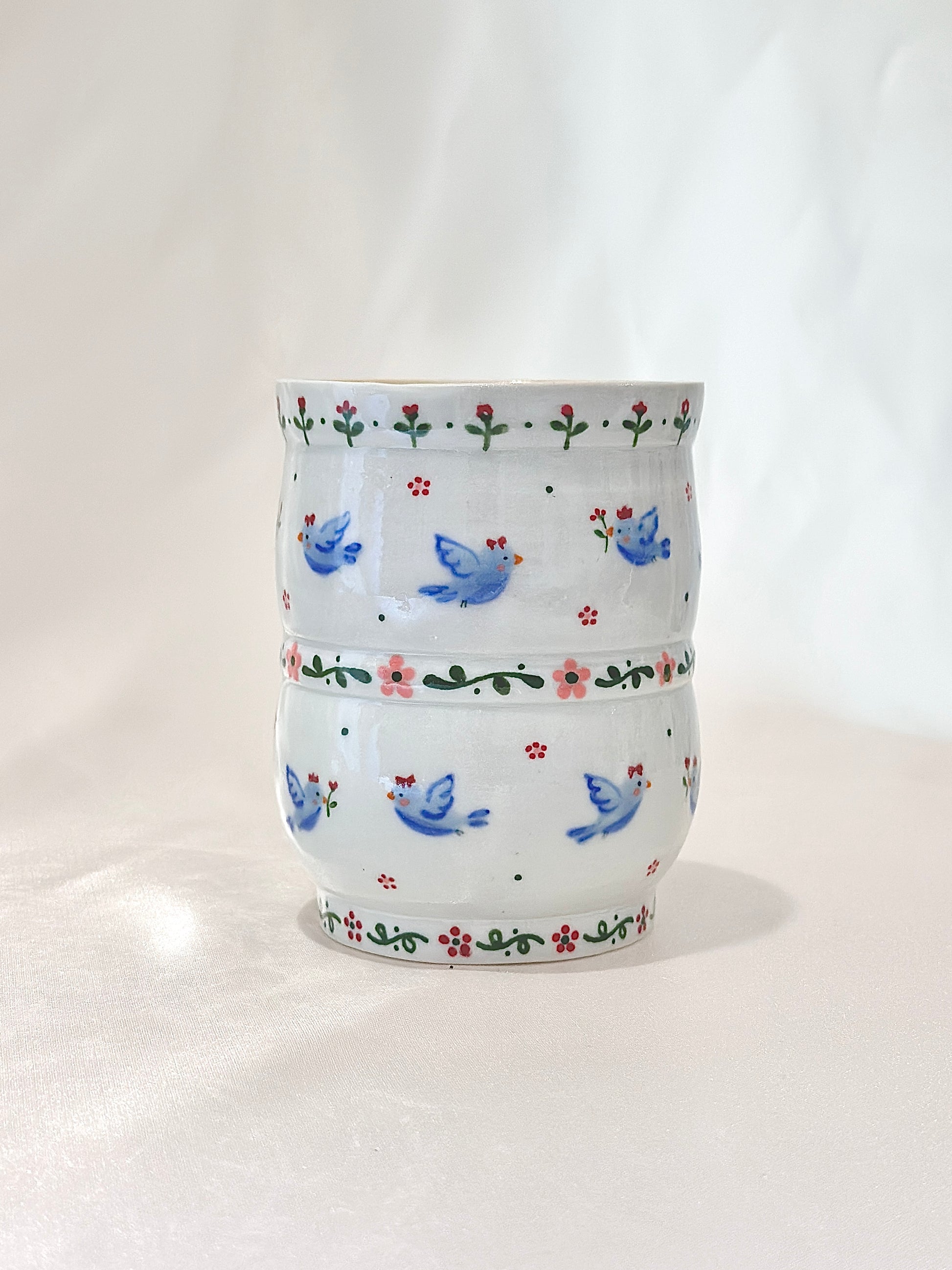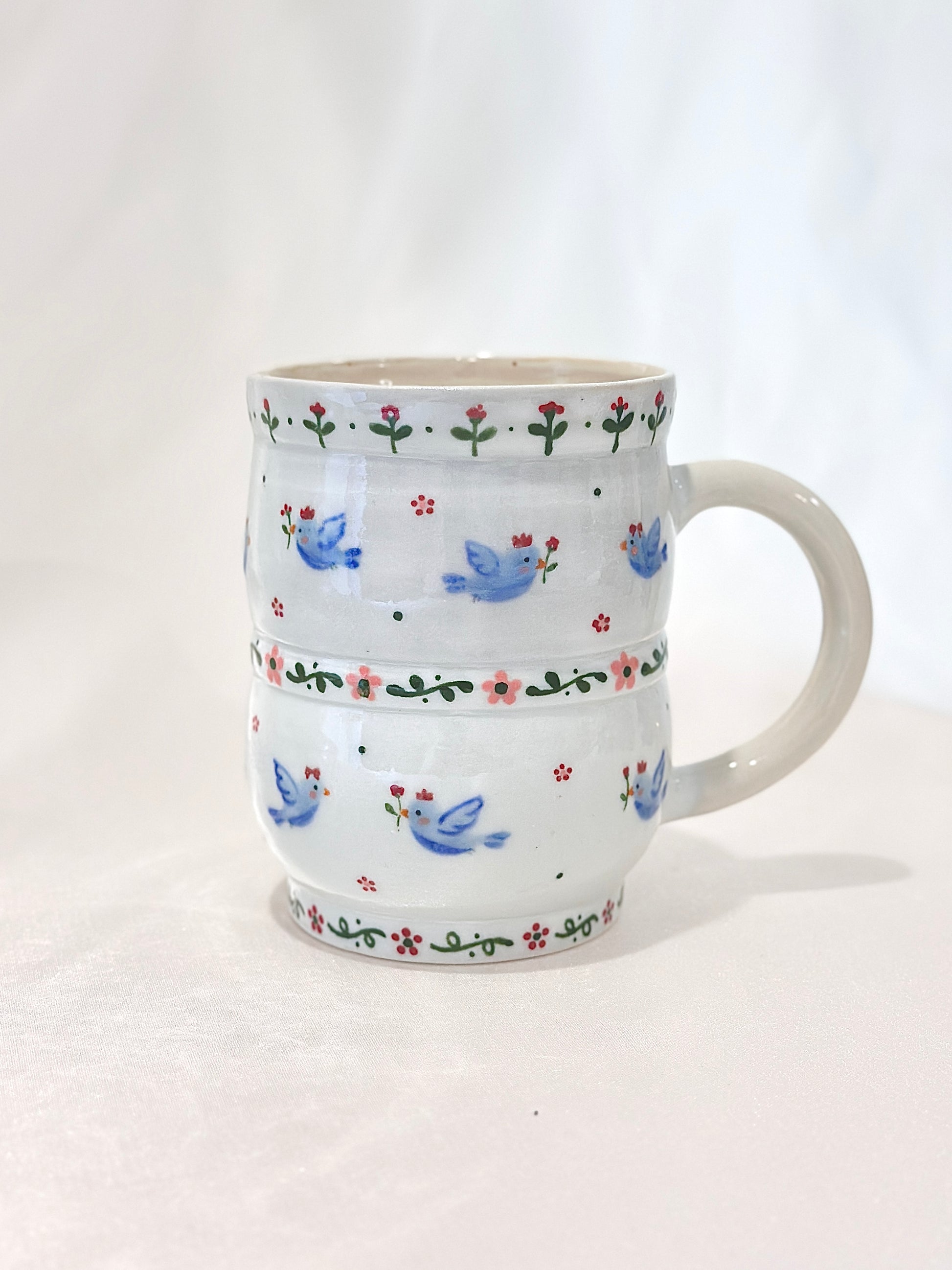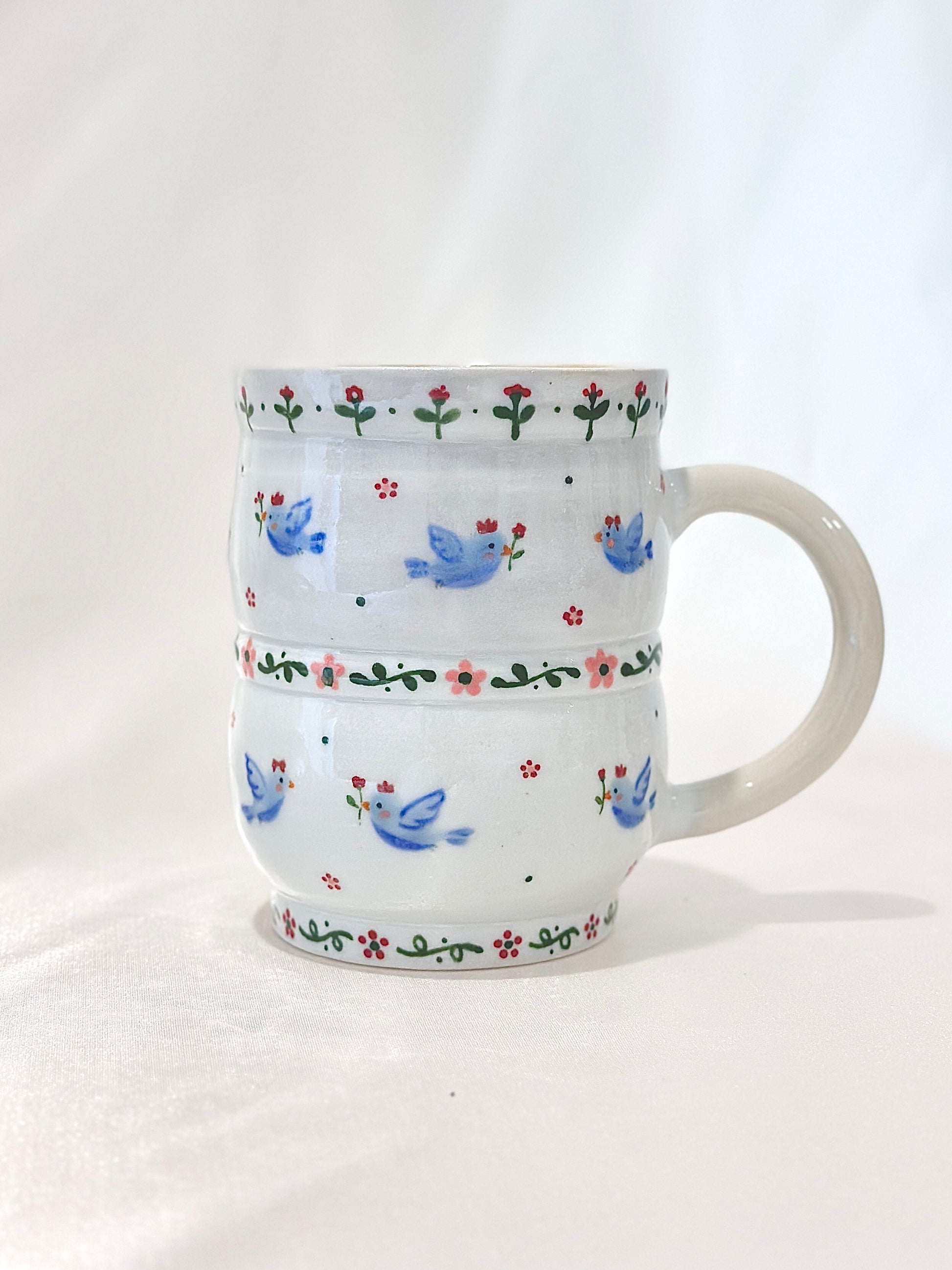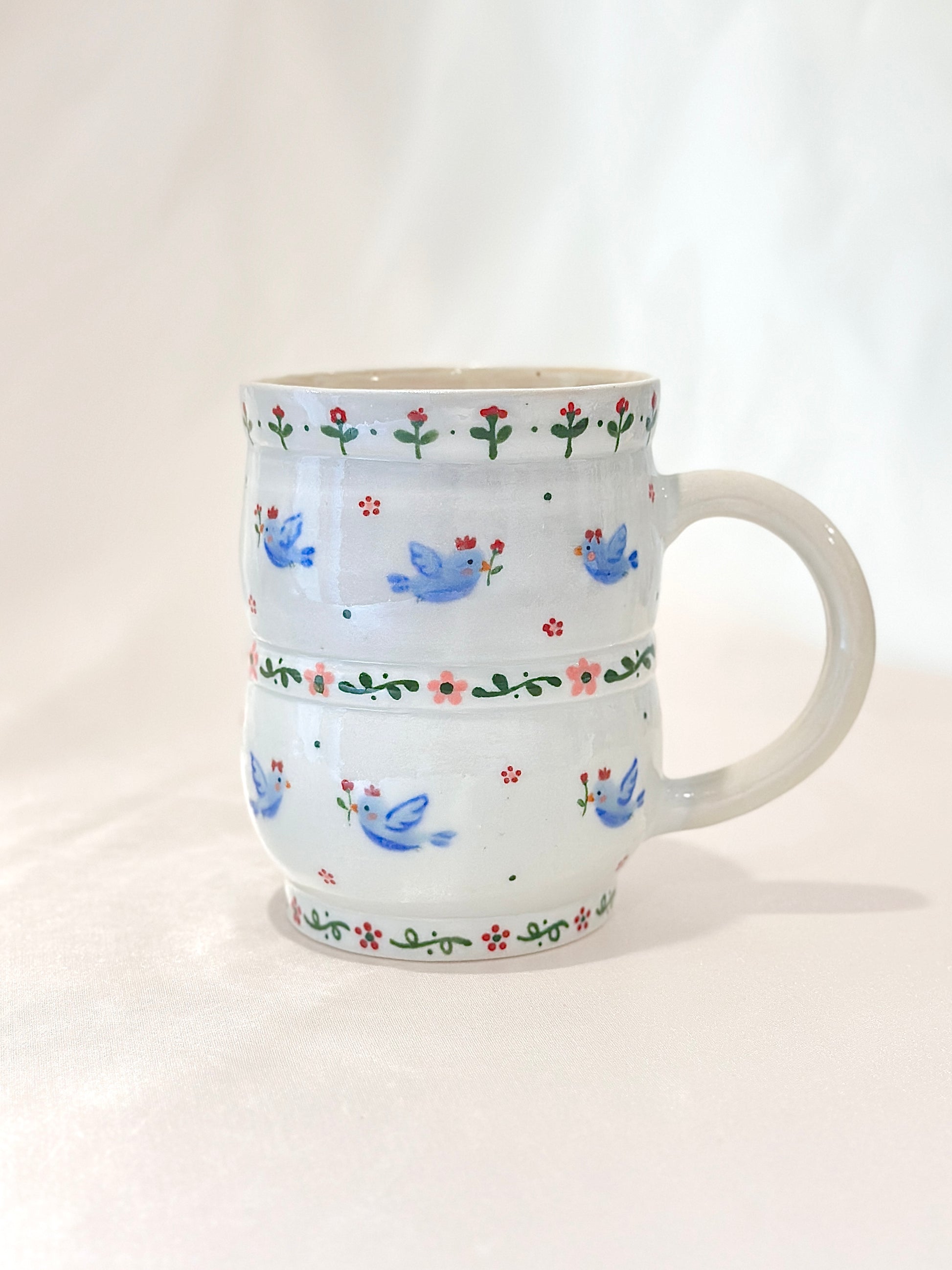 This joyful mug is adorned with bluebirds carrying tiny red flowers, fluttering between borders of bright garden blooms. The scene wraps around, creating a full circle of sweetness. A celebration of nature's tenderness and the small things that make life beautiful. Please note, some speckles interior 🪺