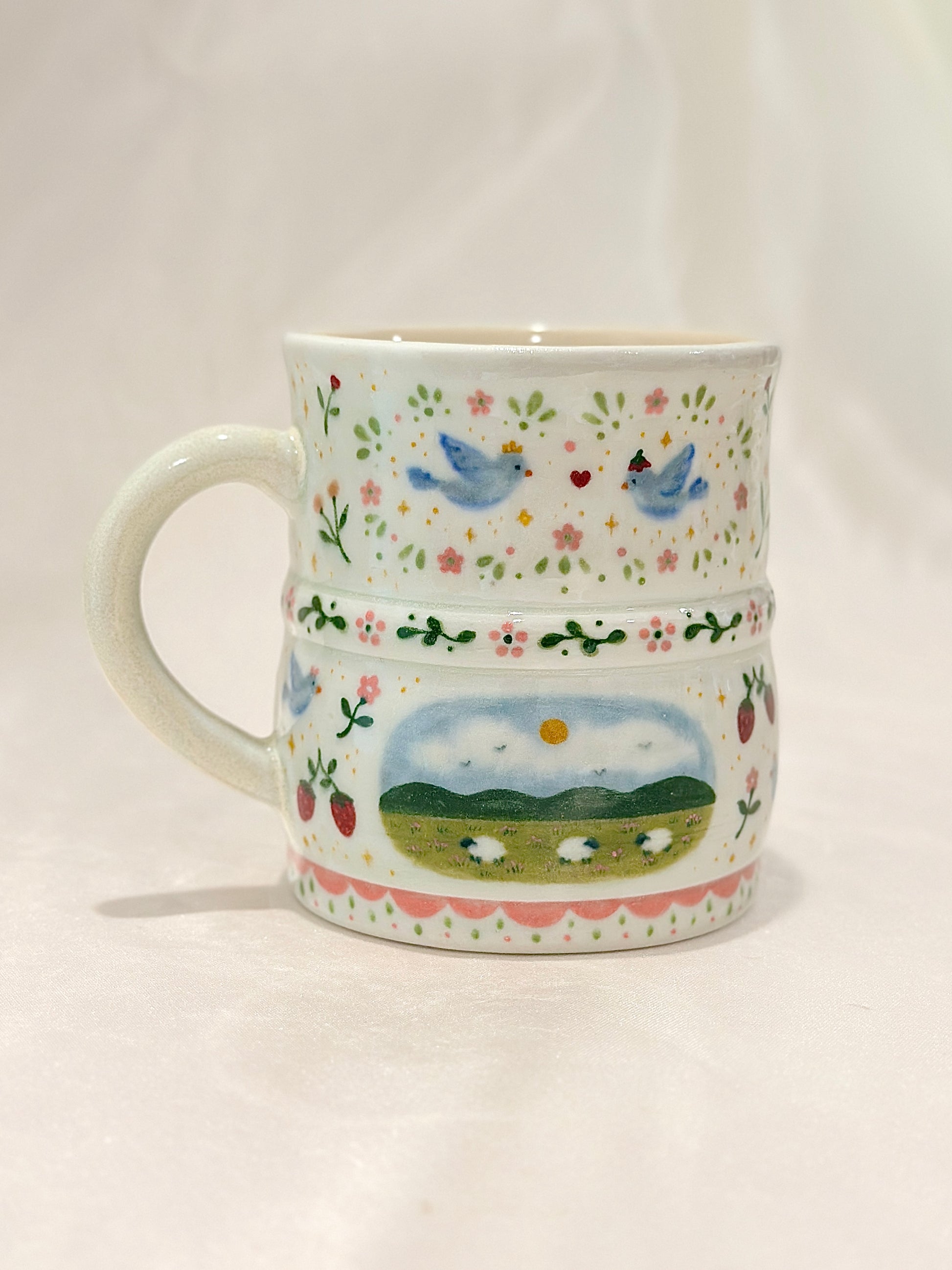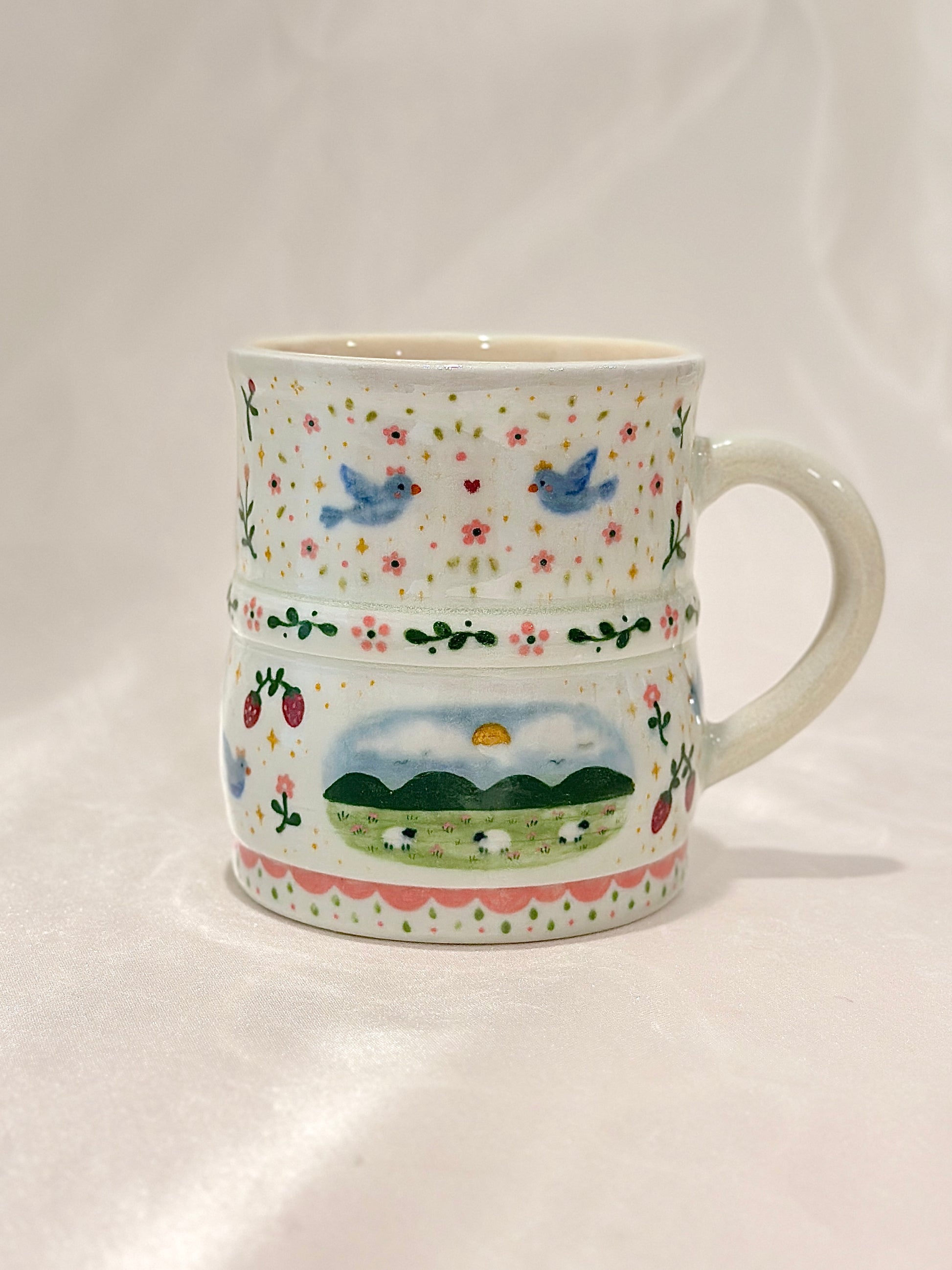 Gentle bluebirds flutter among blossoms while a golden sun rises over soft green hills dotted with sheep and florals. This mug carries the quiet joy of morning, tender and full of promise. Please note: some speckles 🐑