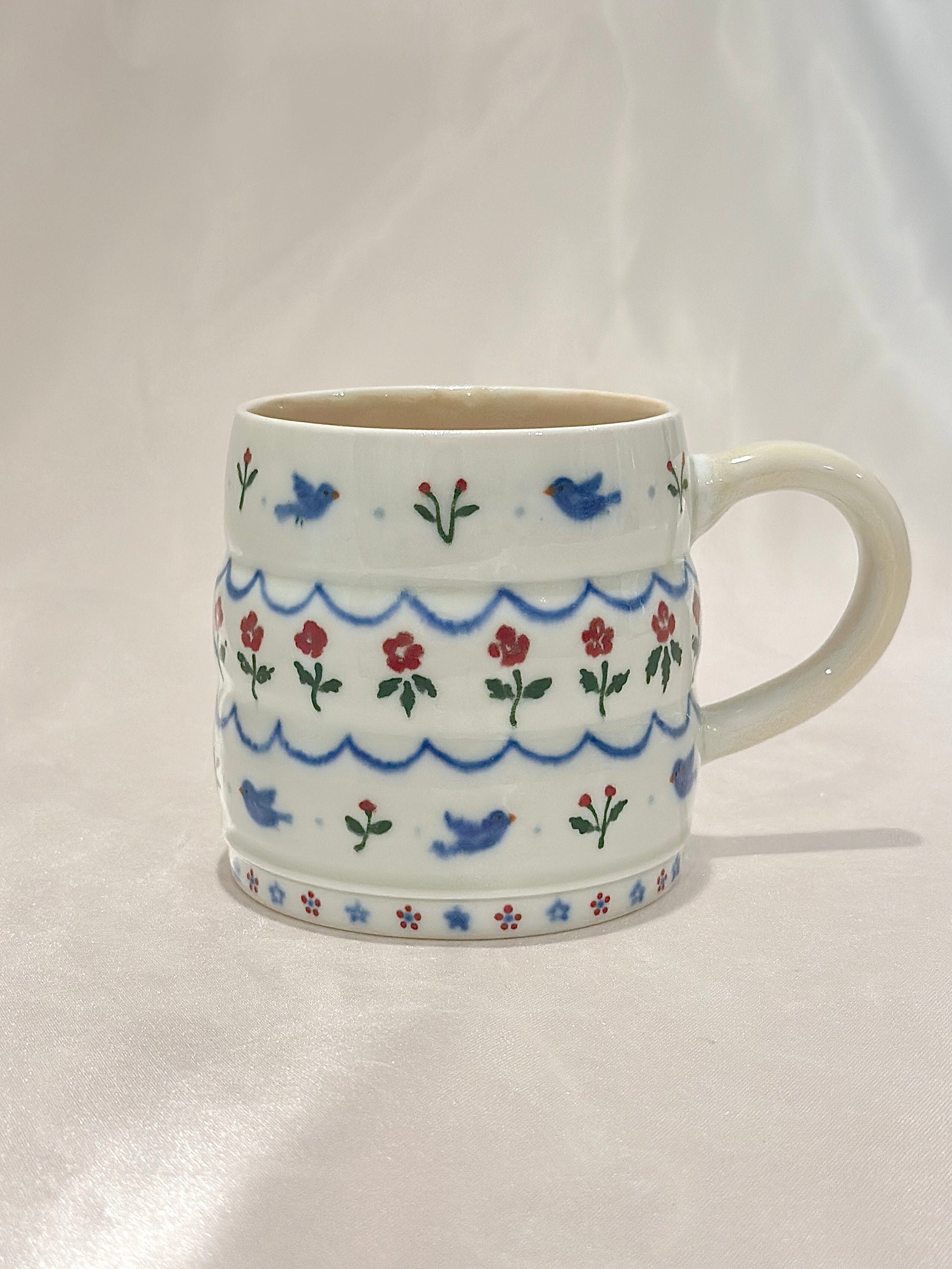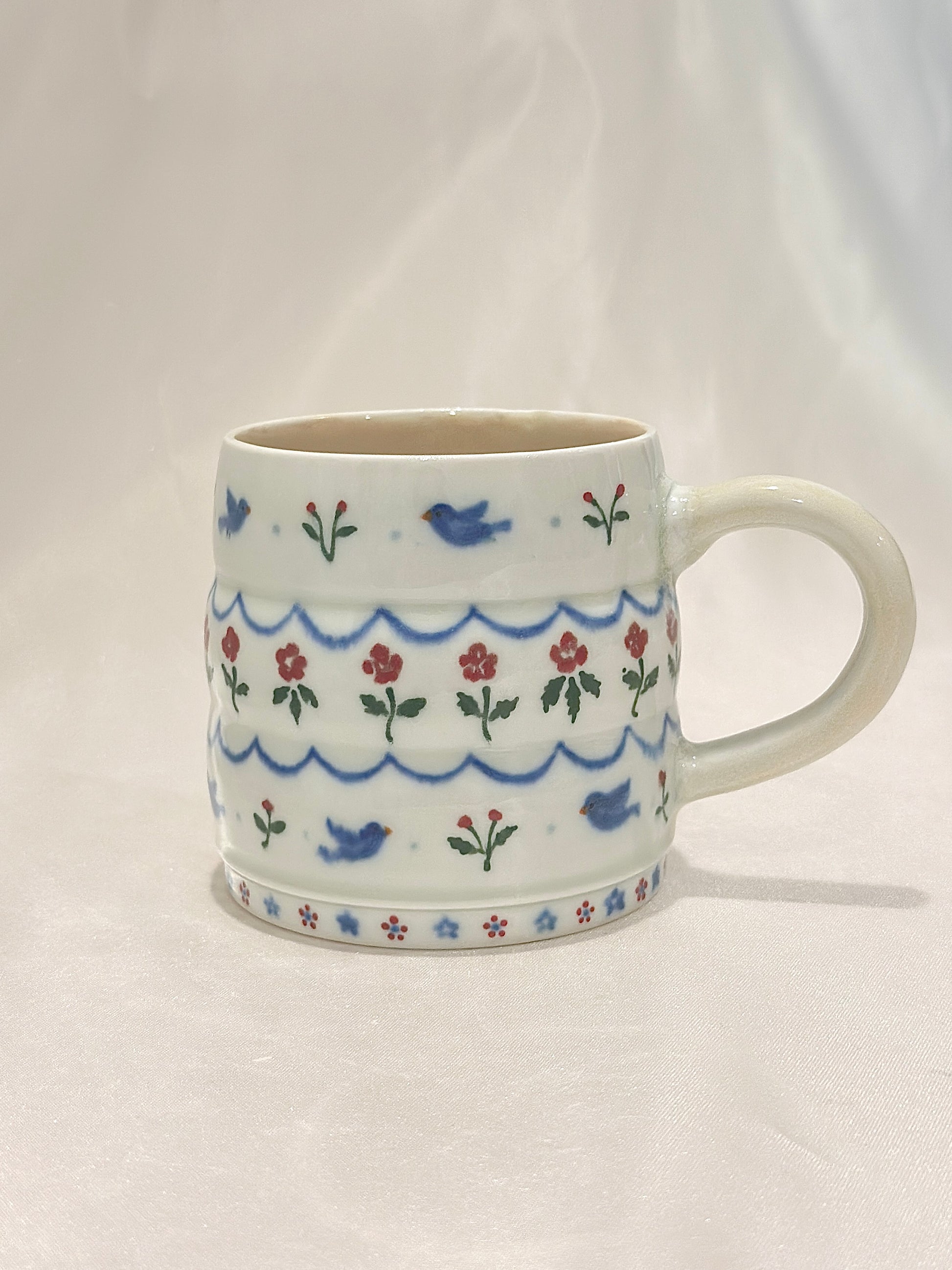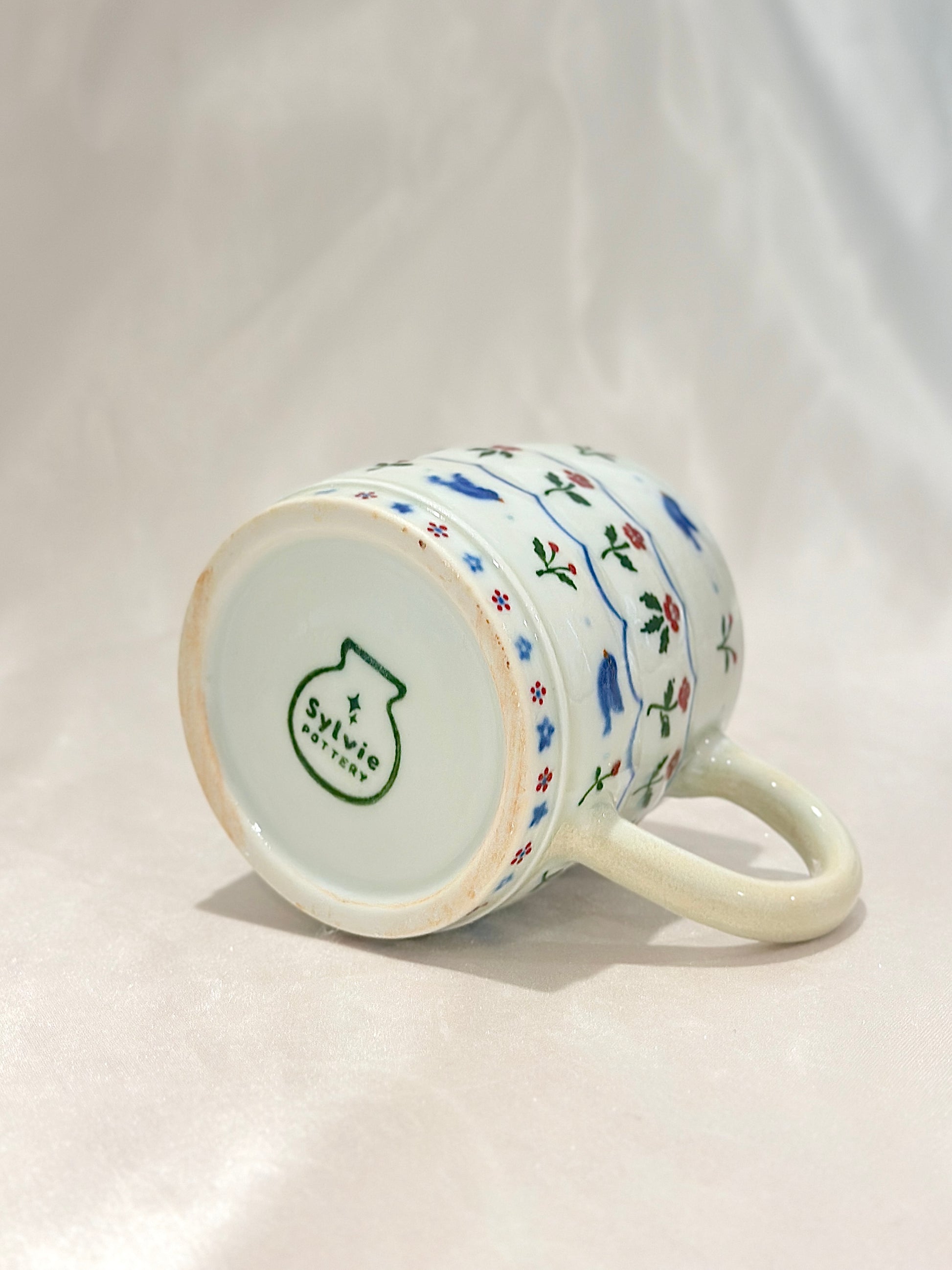 A ring of tiny bluebirds and bright red blossoms wraps around this mug like a stitched meadow scene. Scalloped borders frame the design with a storybook charm, making it feel like a sip of springtime in your hands đź’™