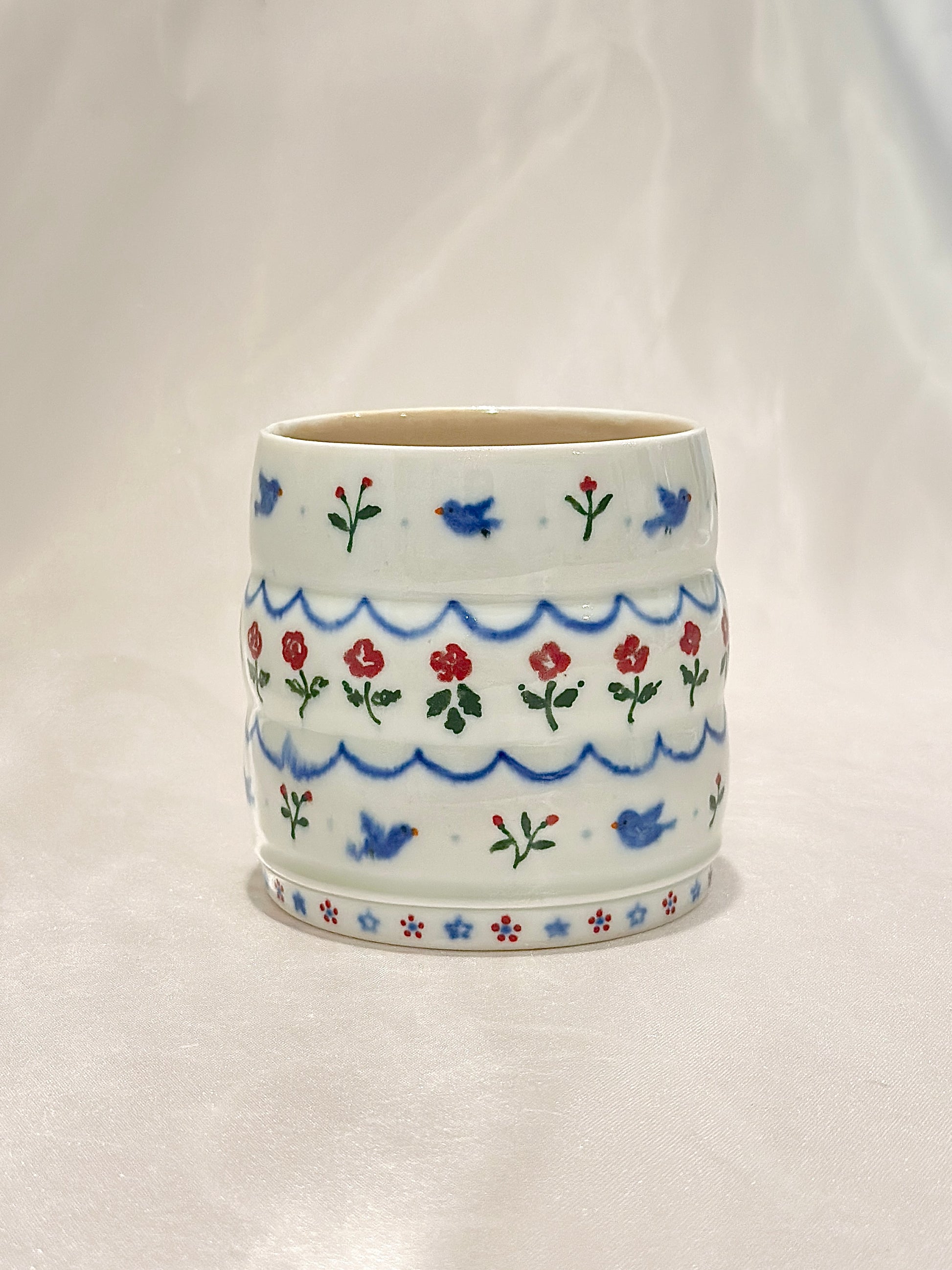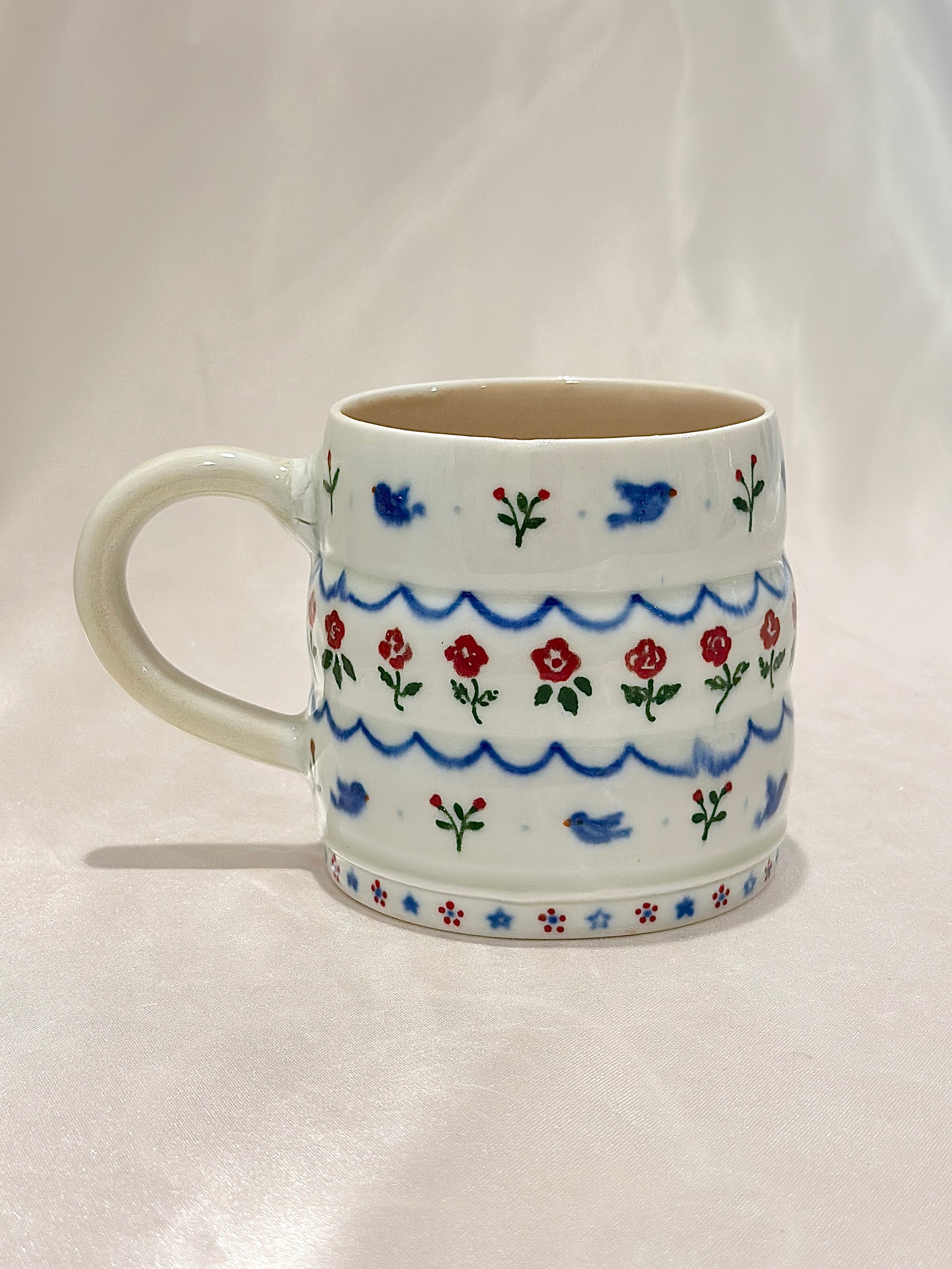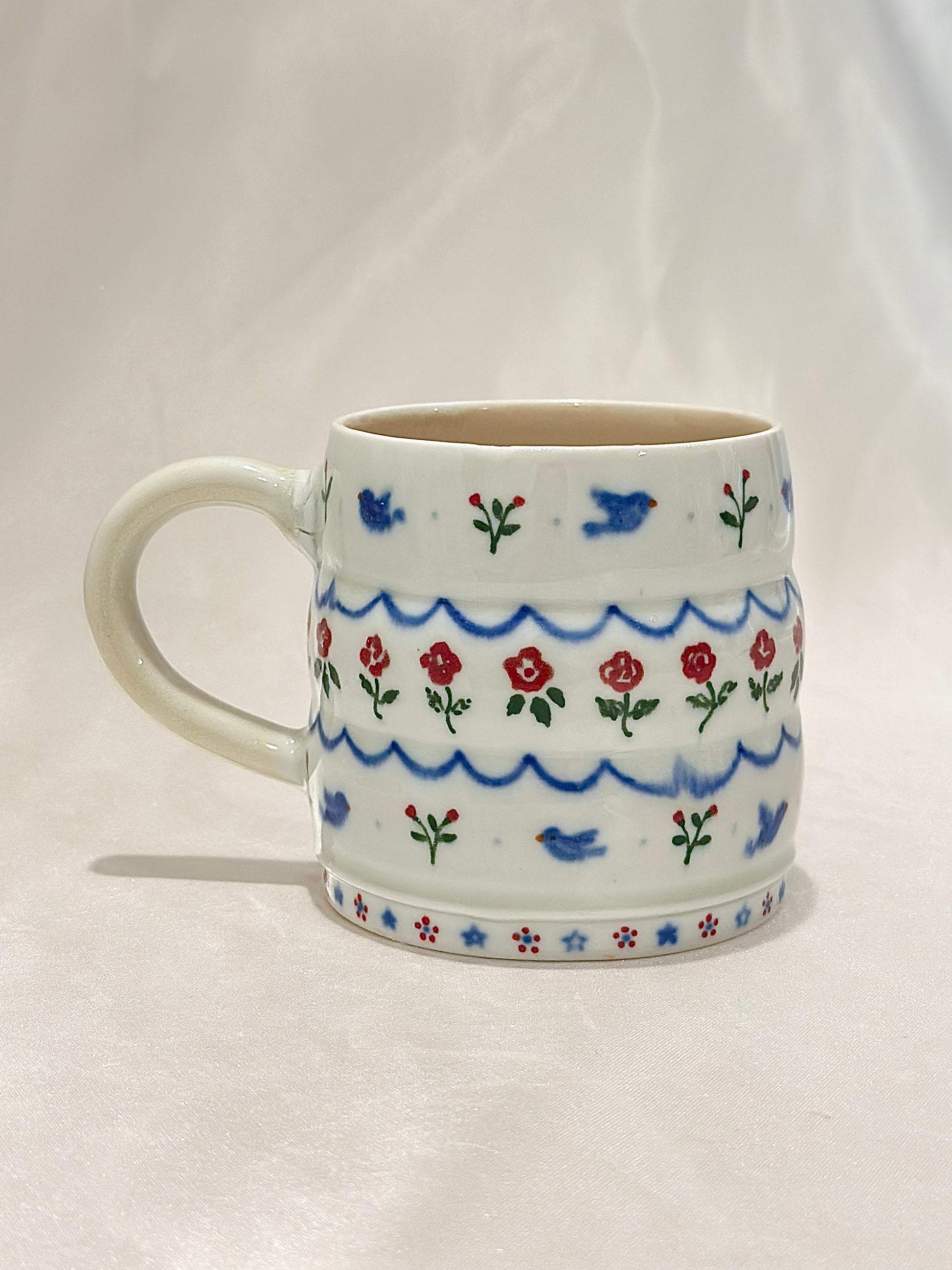 A ring of tiny bluebirds and bright red blossoms wraps around this mug like a stitched meadow scene. Scalloped borders frame the design with a storybook charm, making it feel like a sip of springtime in your hands đź’™