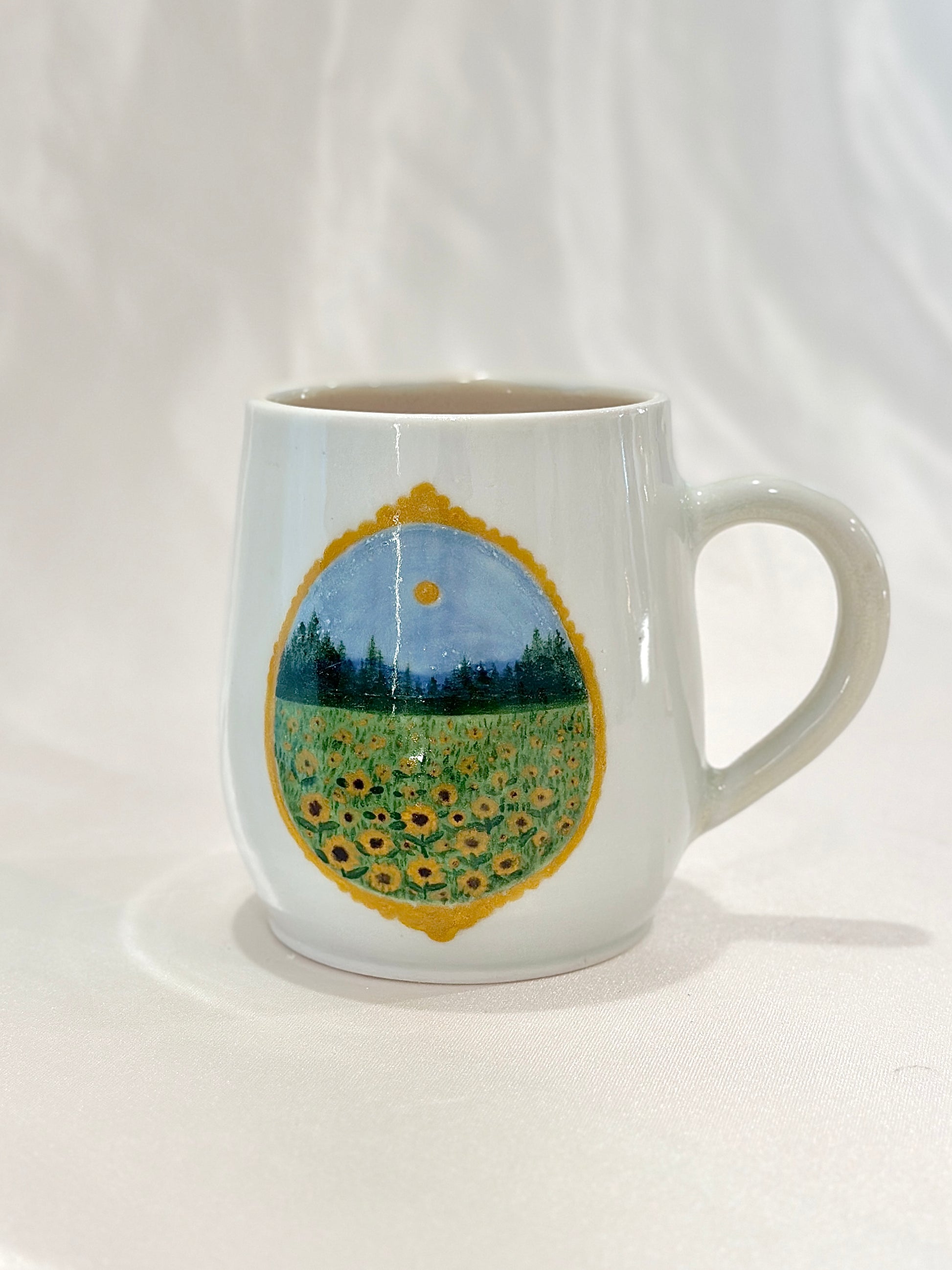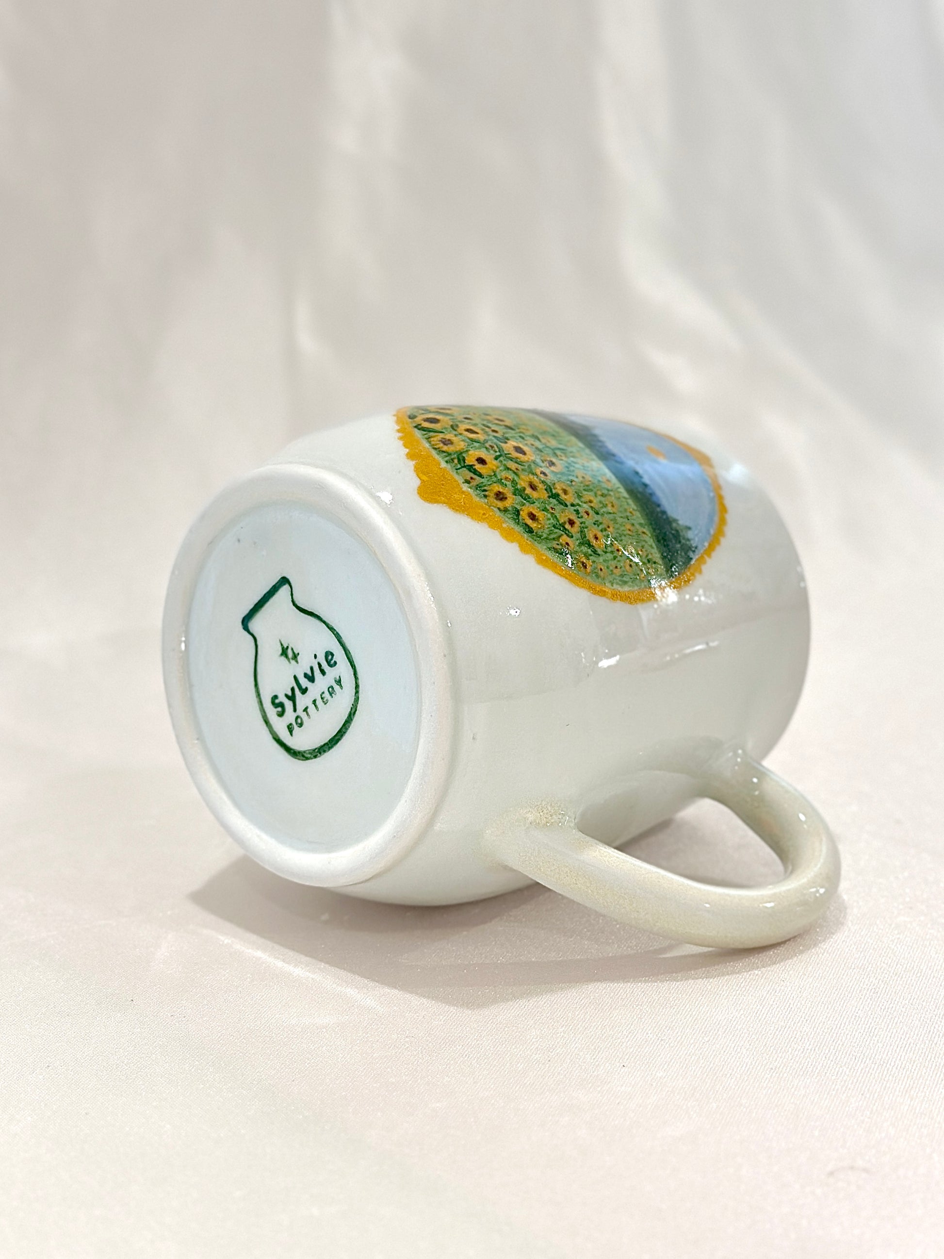 A field of golden sunflowers stretches toward a soft blue sky, framed in warm yellow like the edge of a tiny painting. The scene feels grounding and bright, a moment of sunlight held gently in your hands. This mug is for warm mornings and quiet afternoons, a reminder that beauty can be simple and steady. Please note: some speckles 🌻