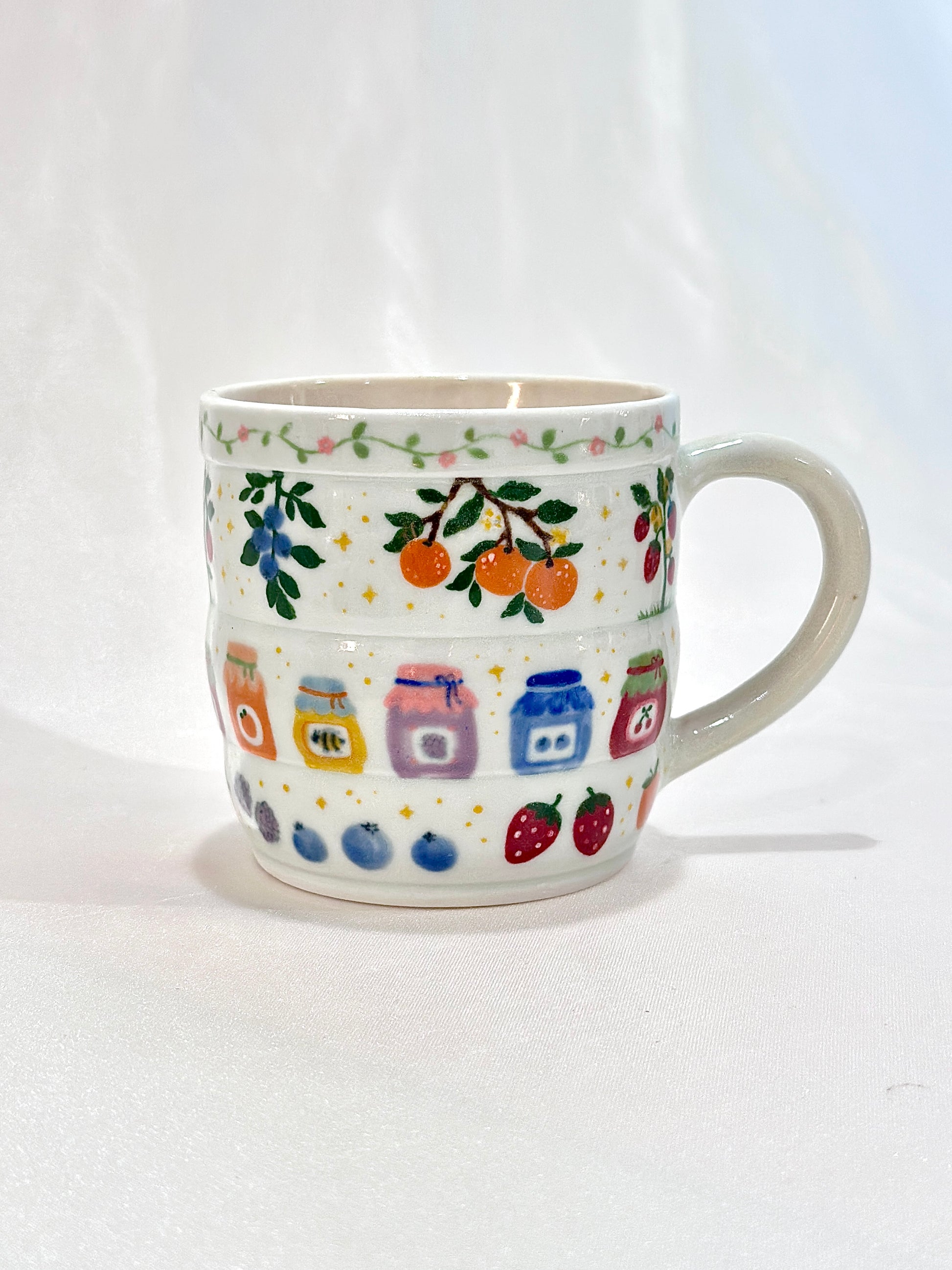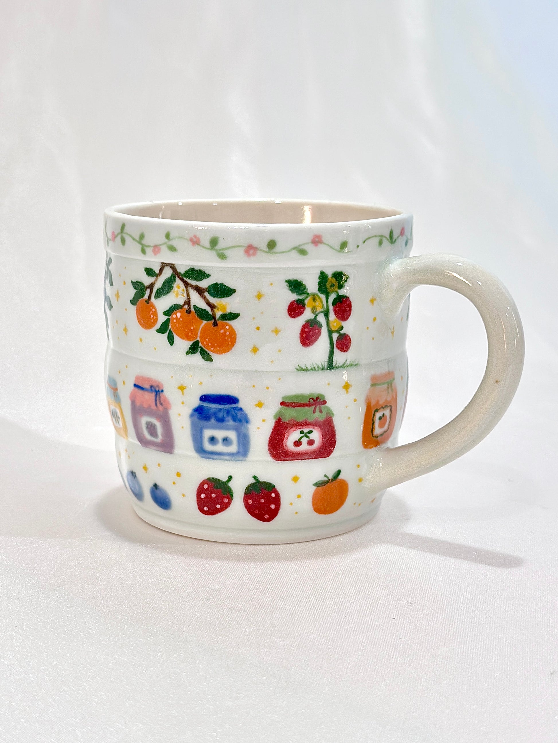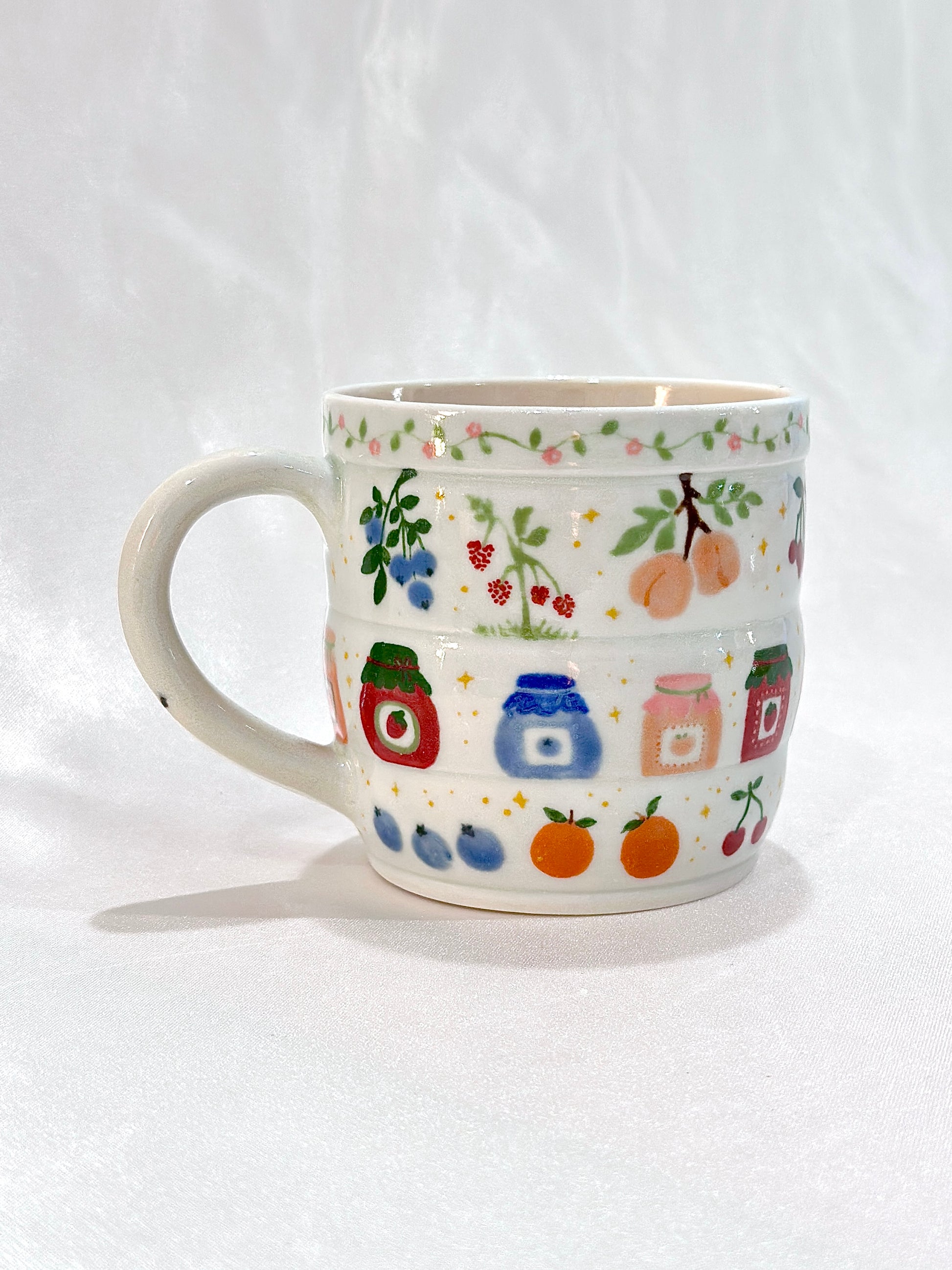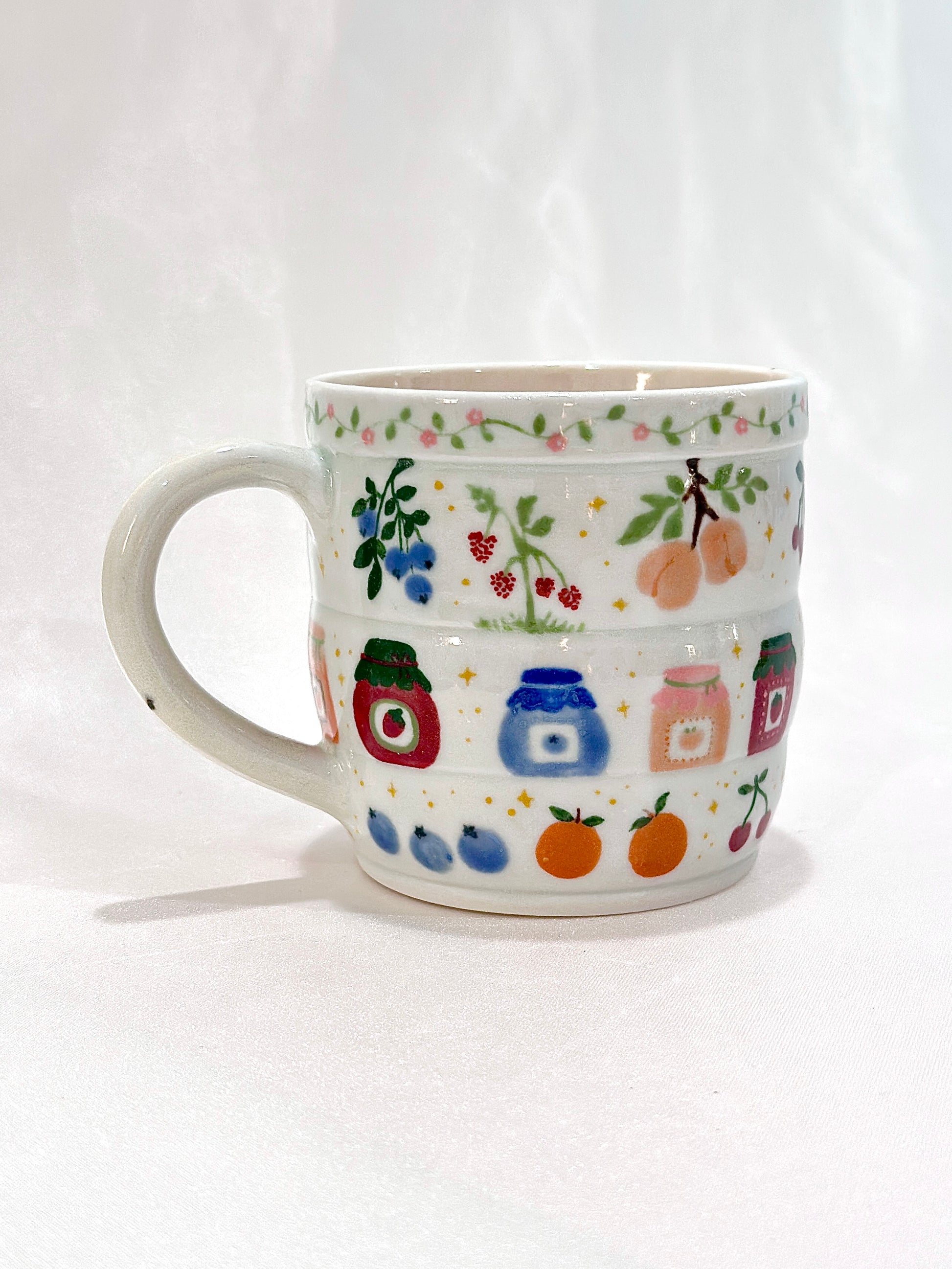 Rows of fruits, berries, and sweet little jam jars wrap around this mug like a cheerful kitchen shelf. It feels warm and homey, like stepping into a cottage pantry filled with summer preserves. The details bring a sense of abundance and sweetness, making every sip feel comforting and bright. Please note: some speckles ✿