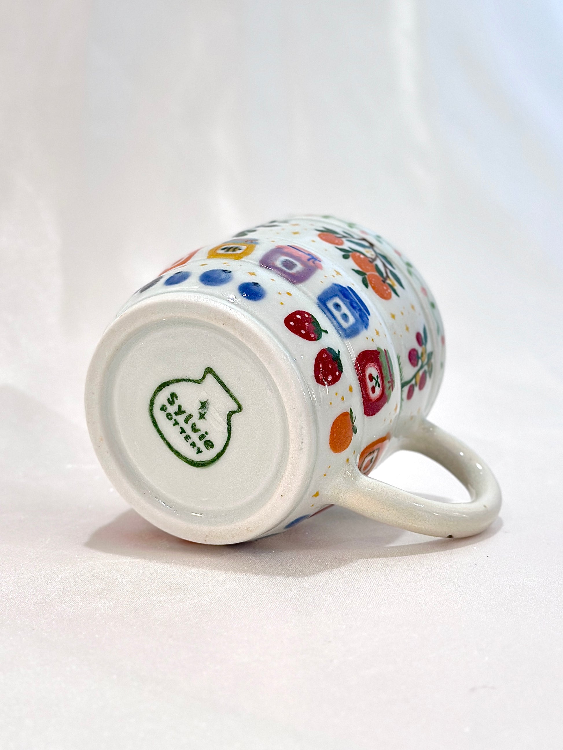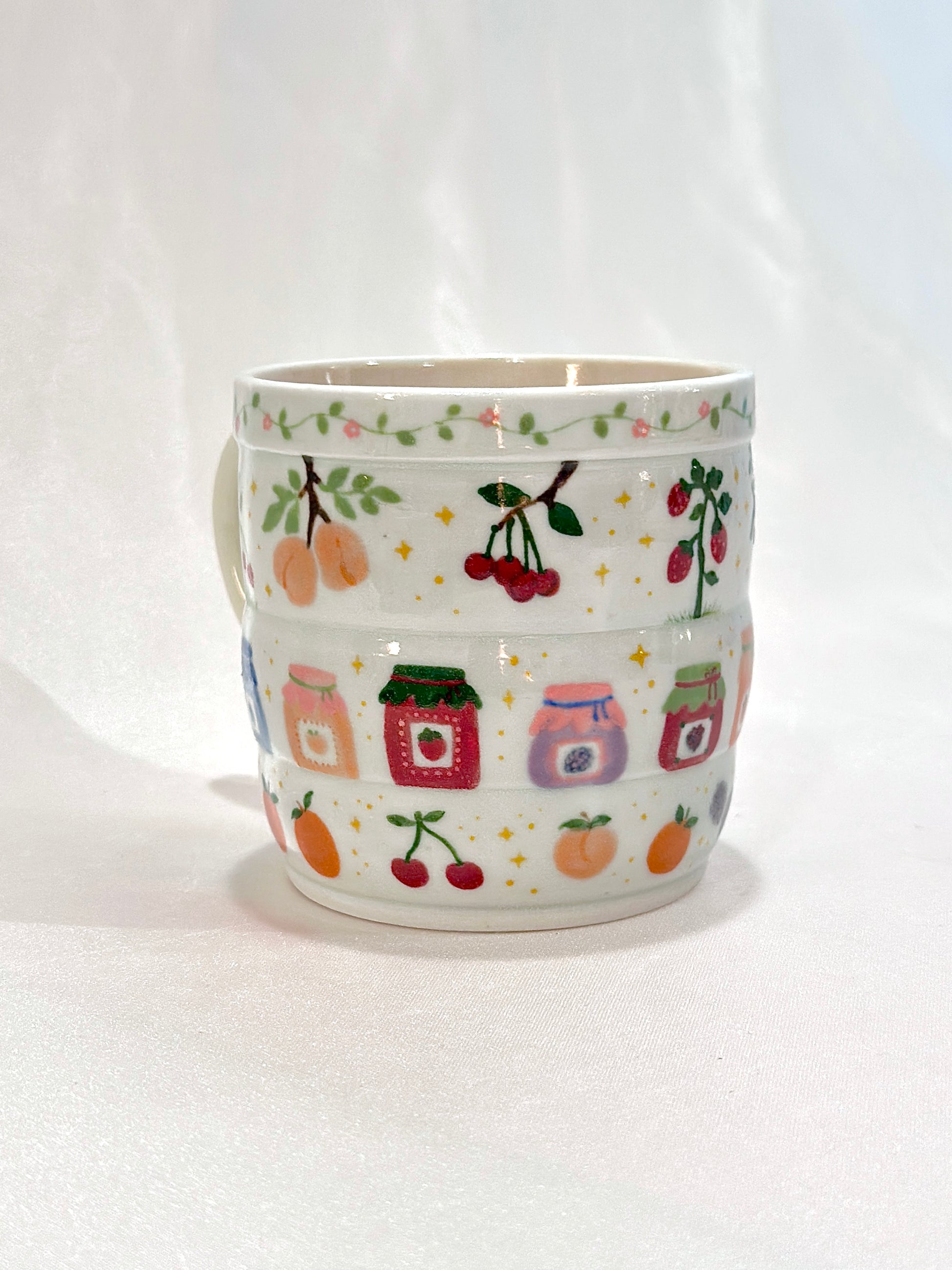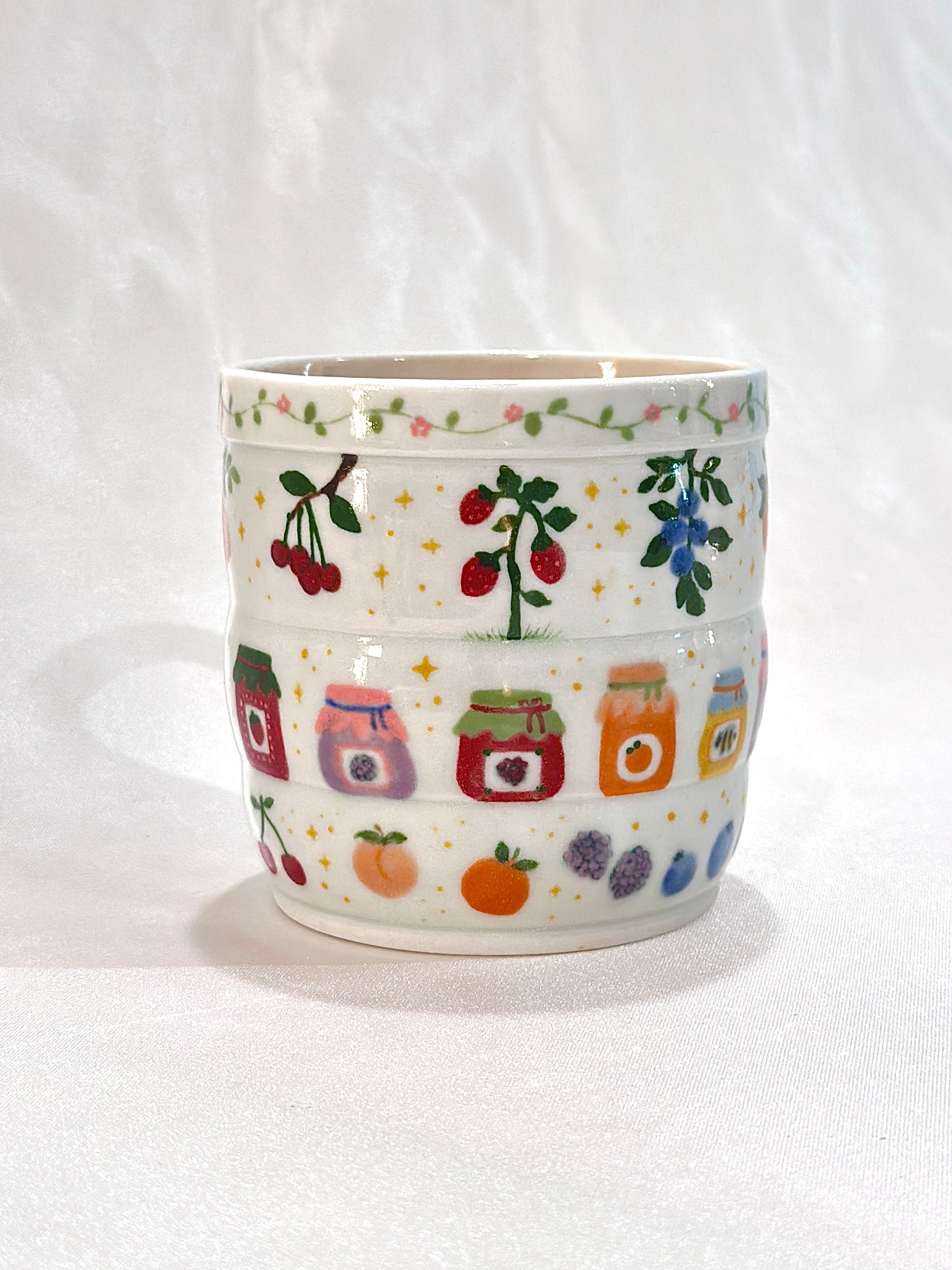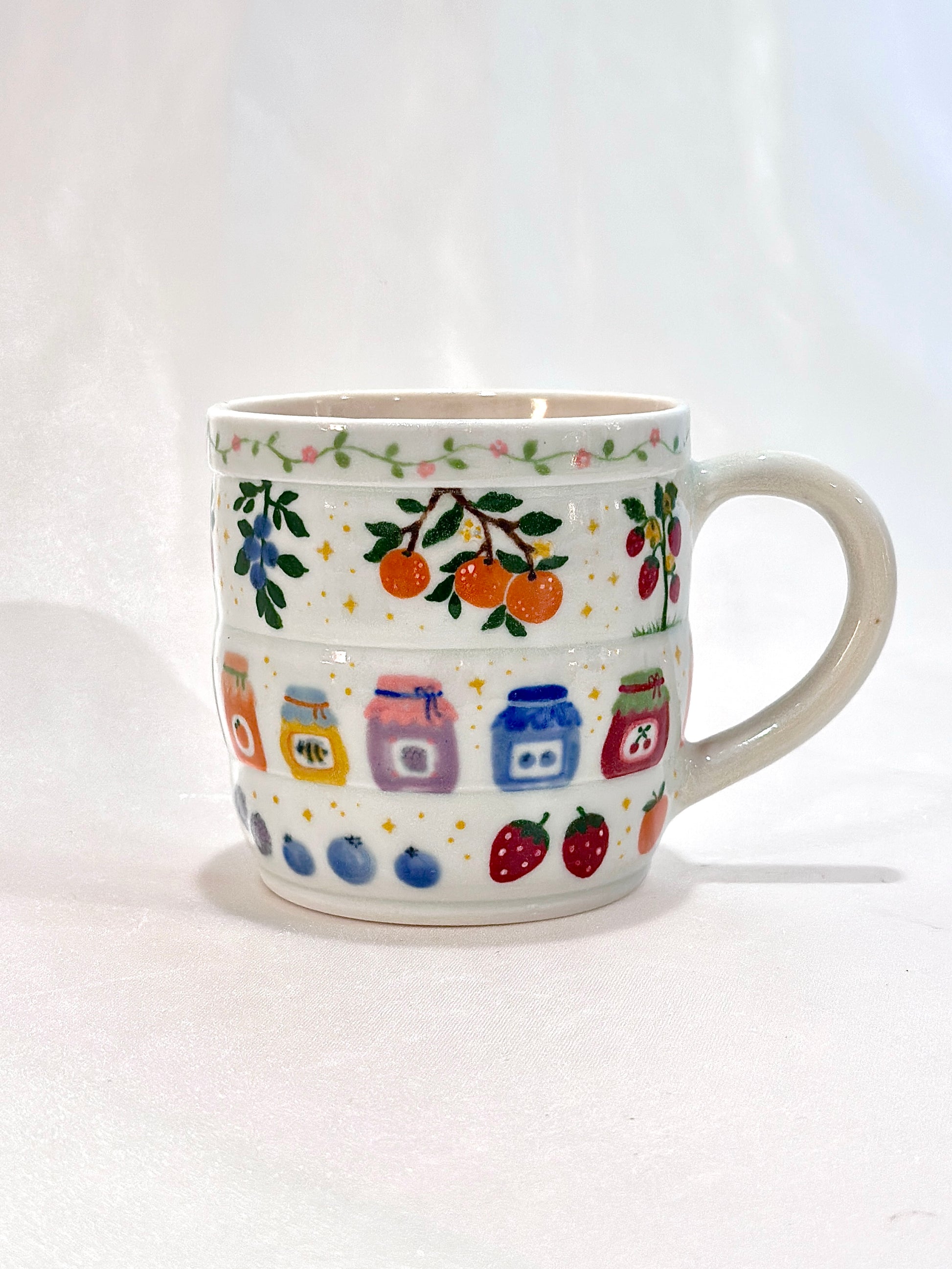 Rows of fruits, berries, and sweet little jam jars wrap around this mug like a cheerful kitchen shelf. It feels warm and homey, like stepping into a cottage pantry filled with summer preserves. The details bring a sense of abundance and sweetness, making every sip feel comforting and bright. Please note: some speckles ✿