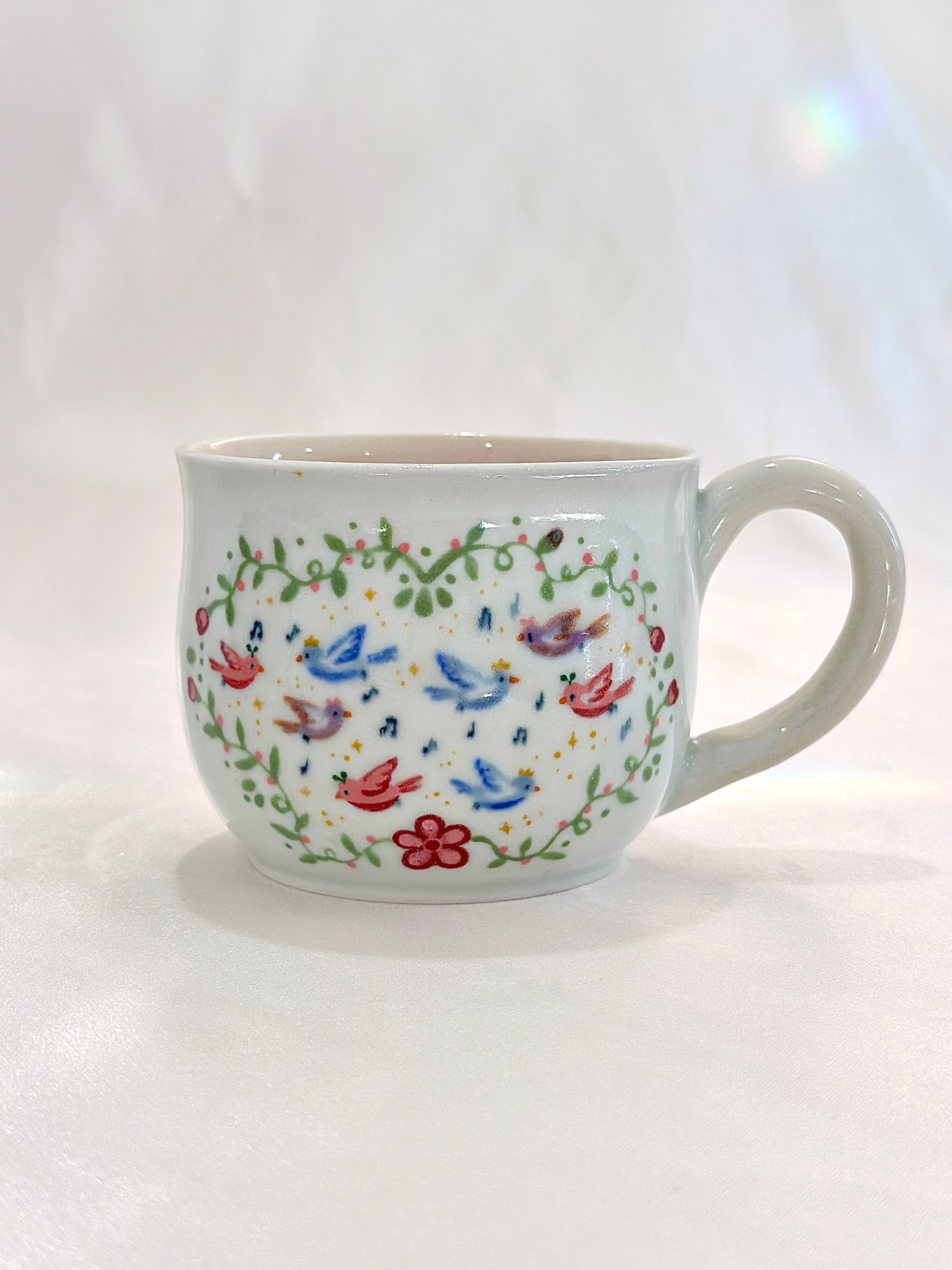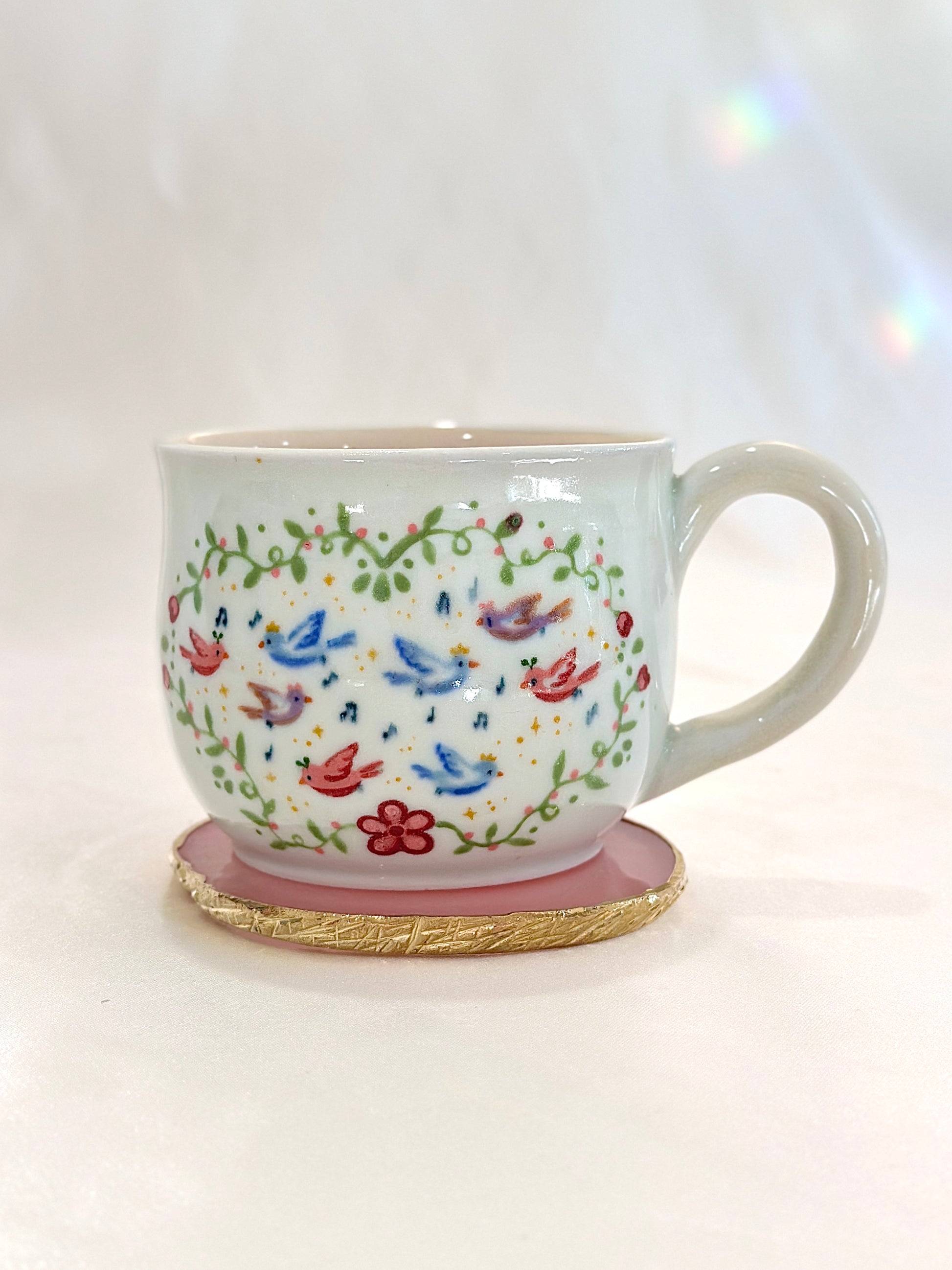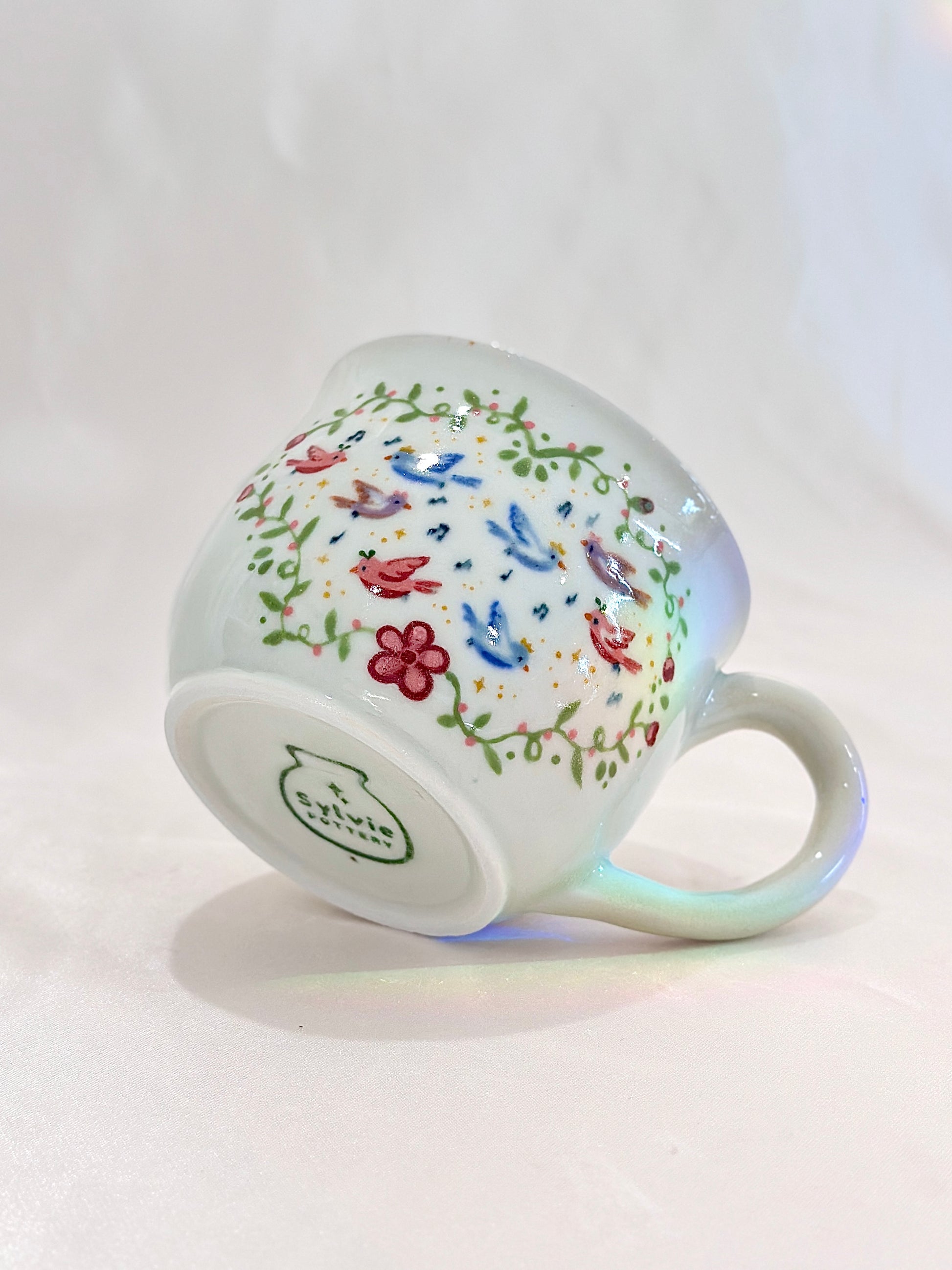 A ring of tiny birds fills this mug with joyful motion, their red and blue wings fluttering among gentle florals and golden speckles. It feels like morning in a blooming garden, where everything sings softly around you. A tender reminder that simple beauty is enough to brighten a whole day✨