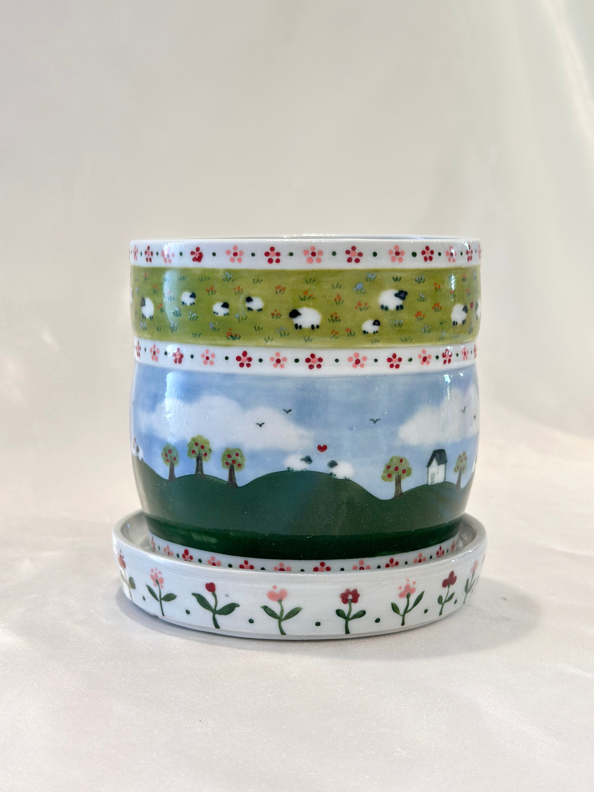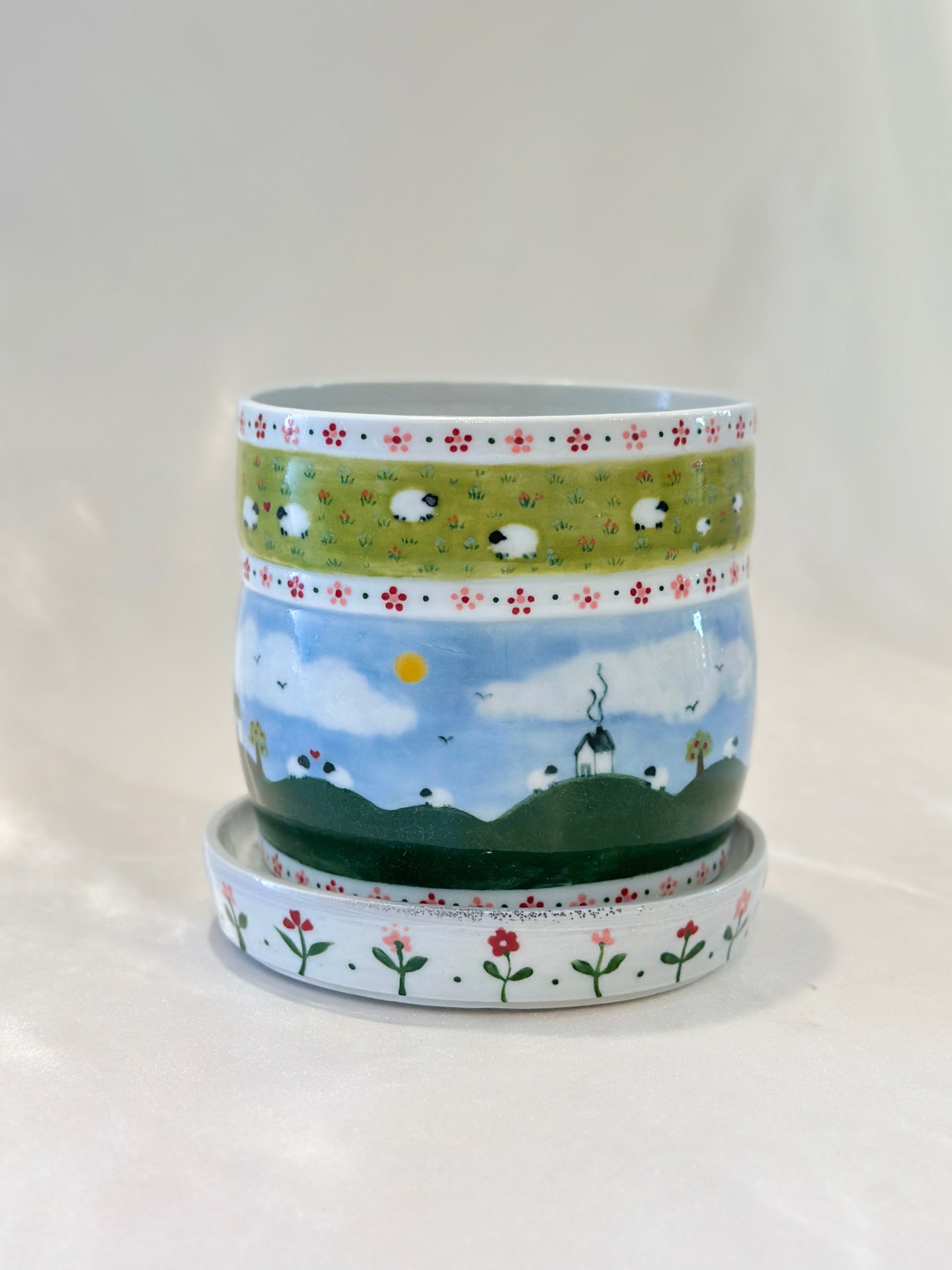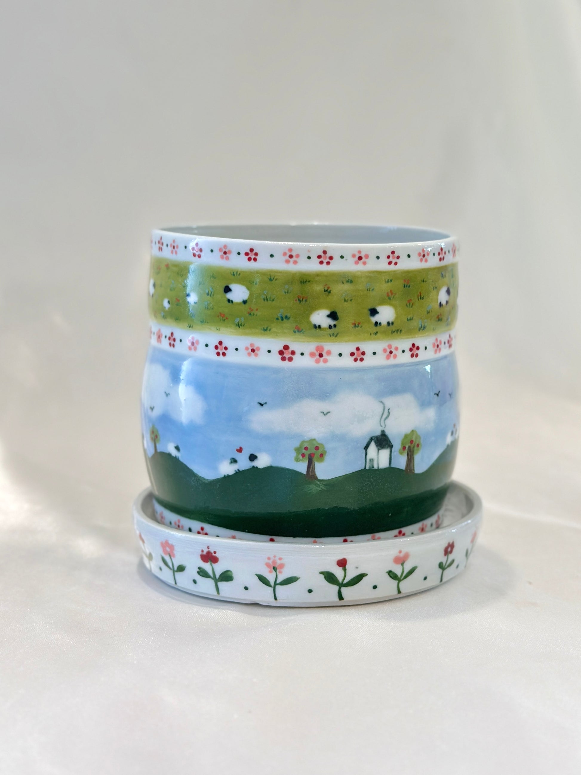 This oval-rimmed planter is painted with a peaceful countryside scene with floral borders. It comes with a matching floral drainage tray and a built-in drainage hole, blending function with charm. A gentle pastoral world, made to bring beauty, ease, and a breath of fresh air into your space. Please note: The rim is oval from the firing process, but won’t affect function once potted 🌿🐑🌸