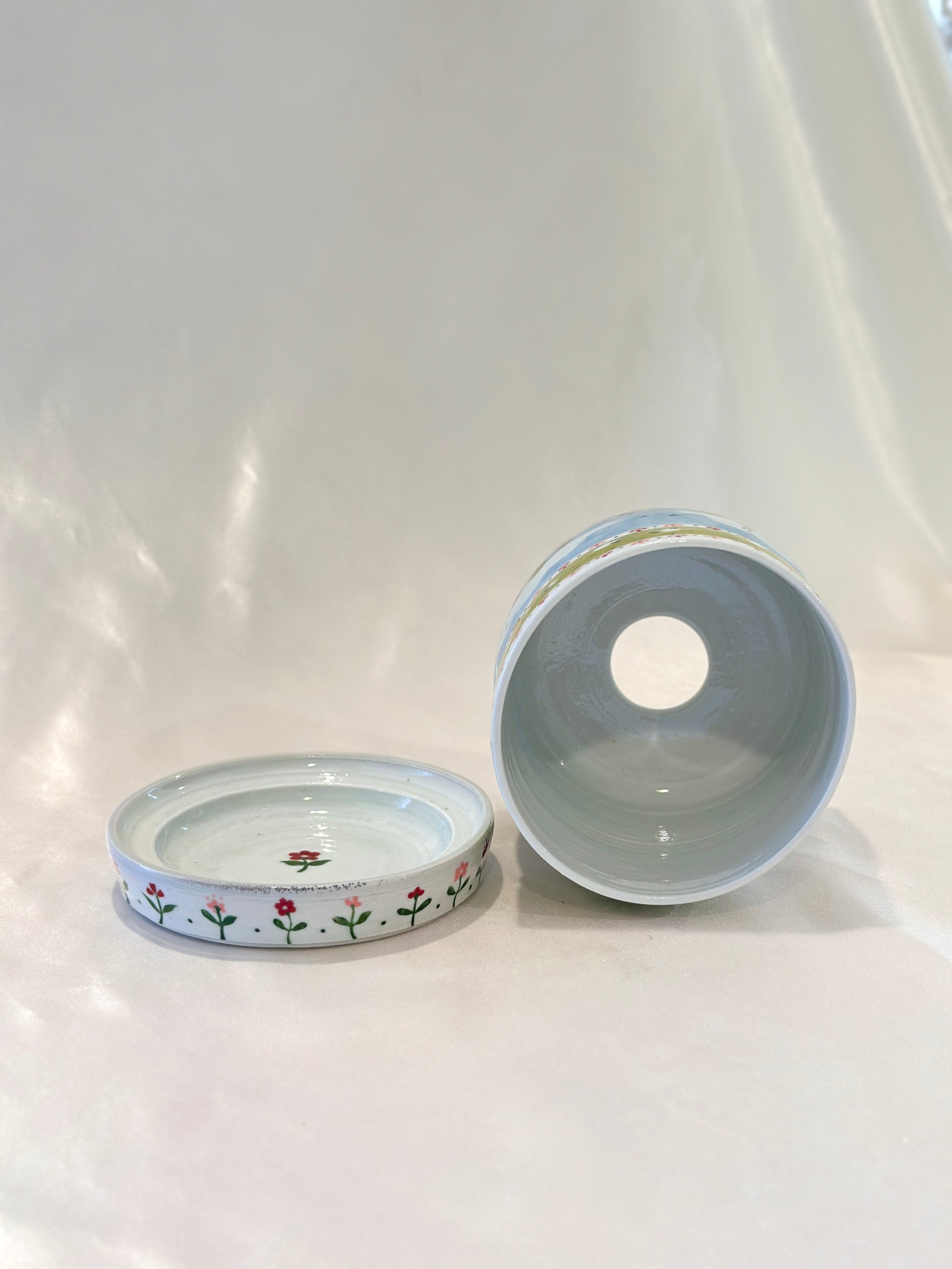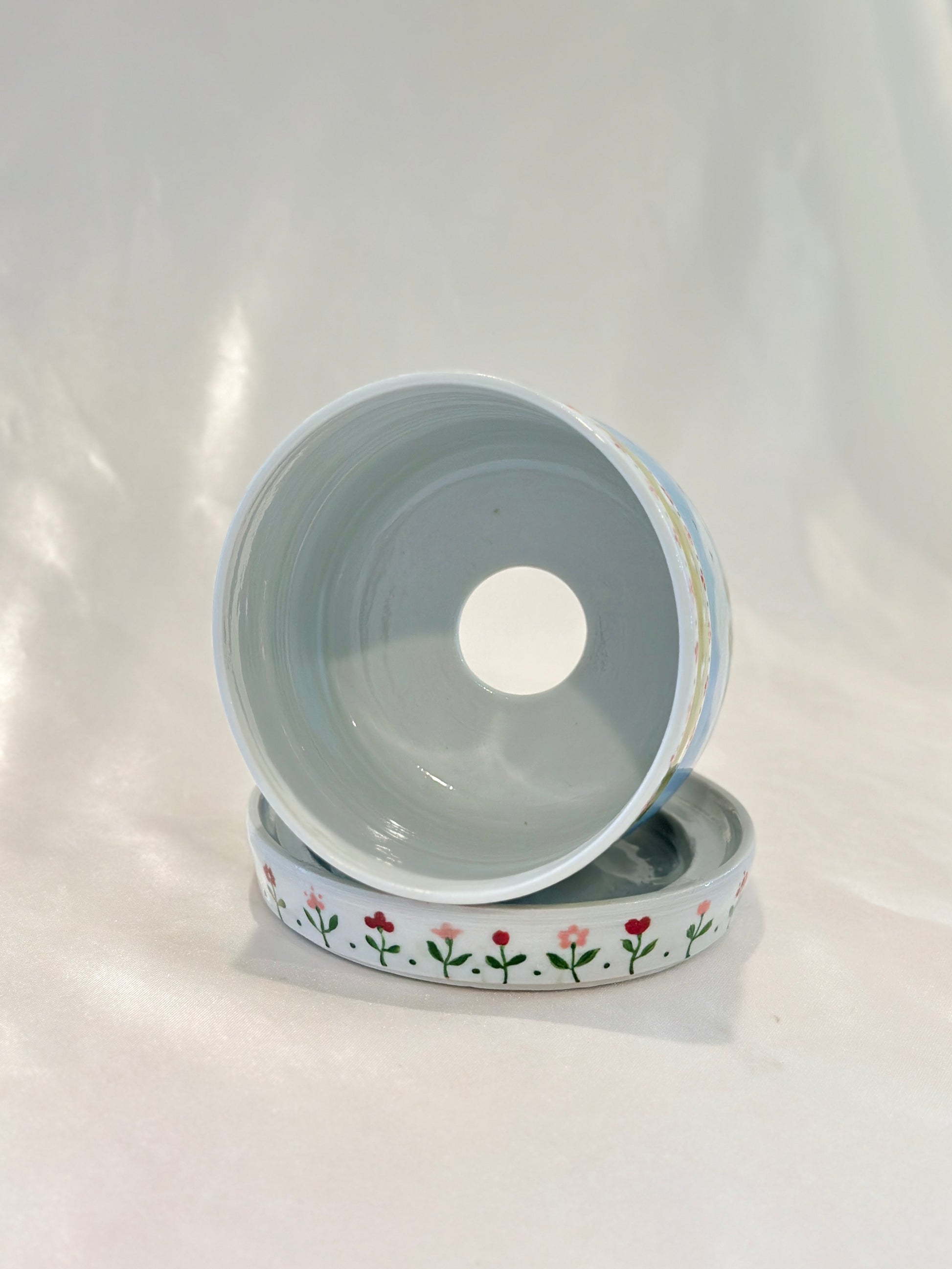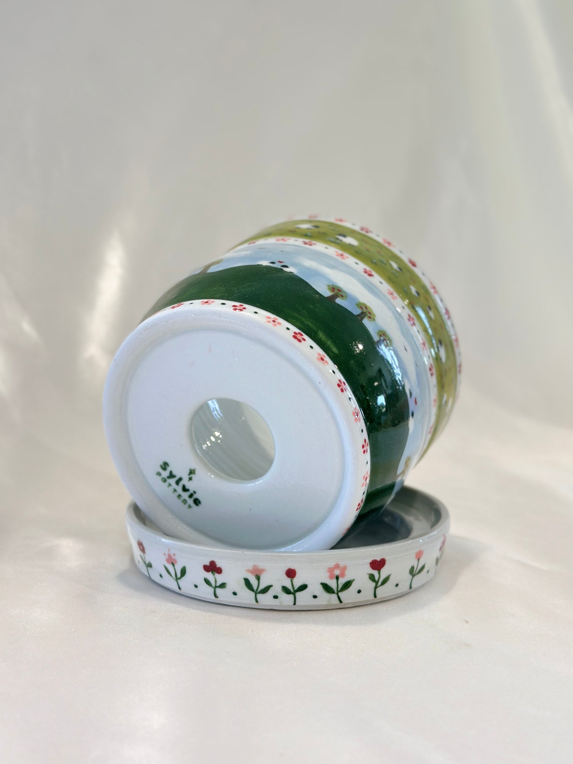 This oval-rimmed planter is painted with a peaceful countryside scene with floral borders. It comes with a matching floral drainage tray and a built-in drainage hole, blending function with charm. A gentle pastoral world, made to bring beauty, ease, and a breath of fresh air into your space. Please note: The rim is oval from the firing process, but won’t affect function once potted 🌿🐑🌸
