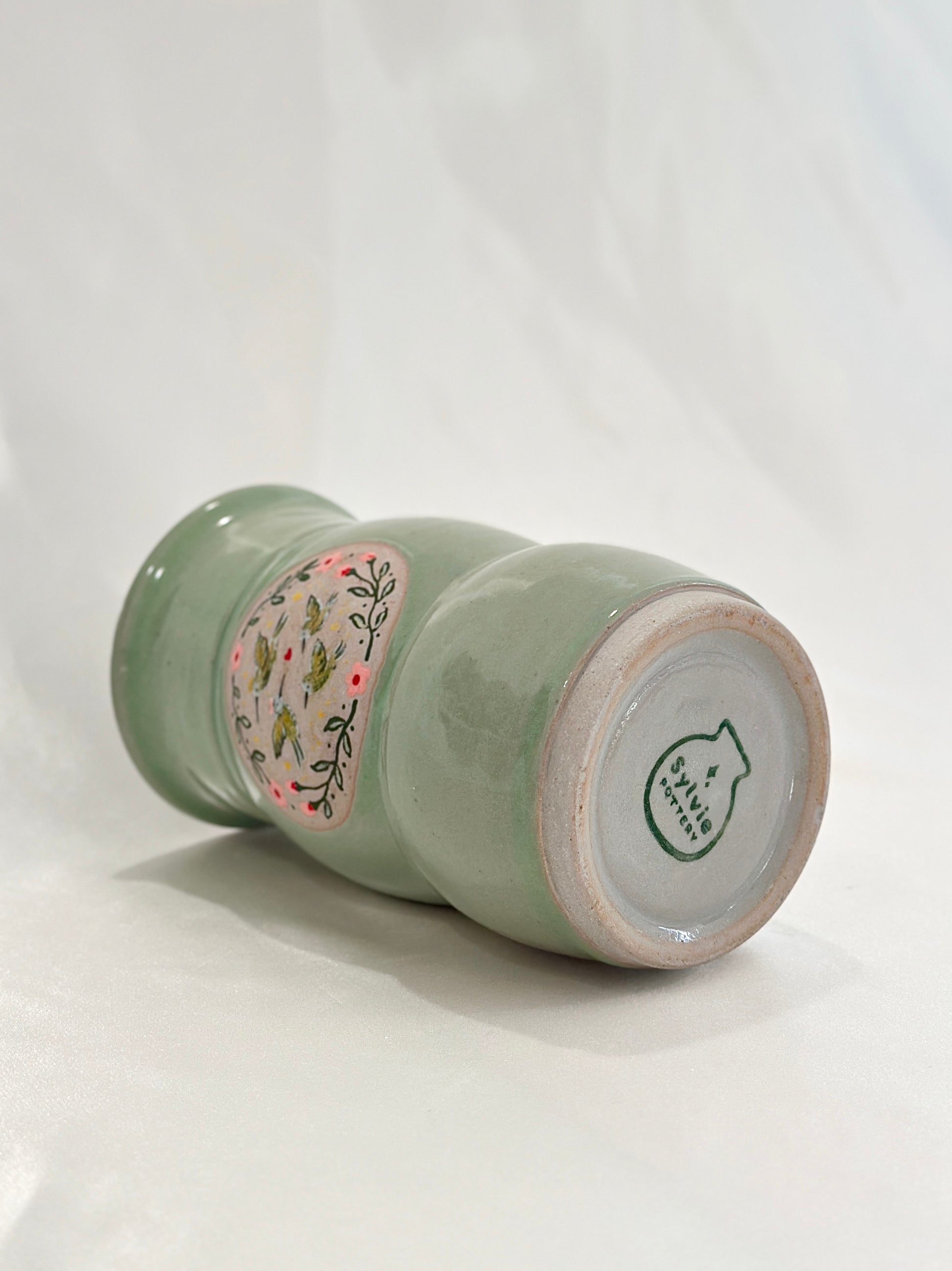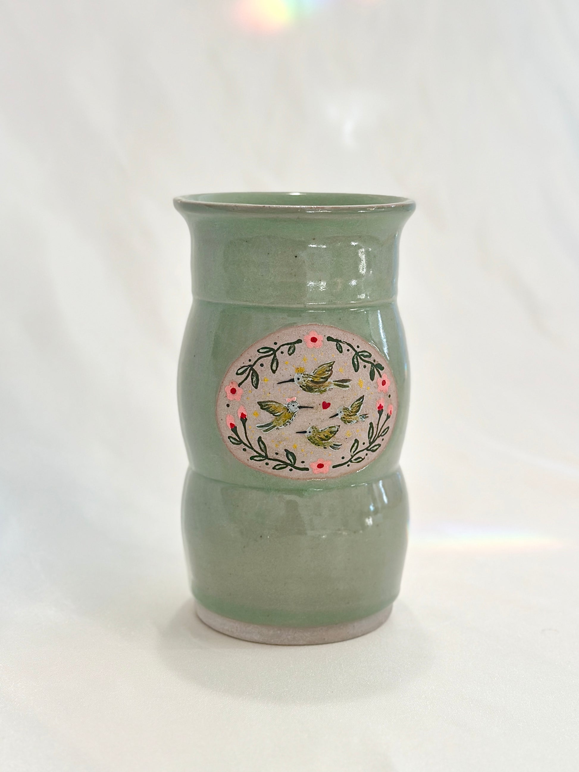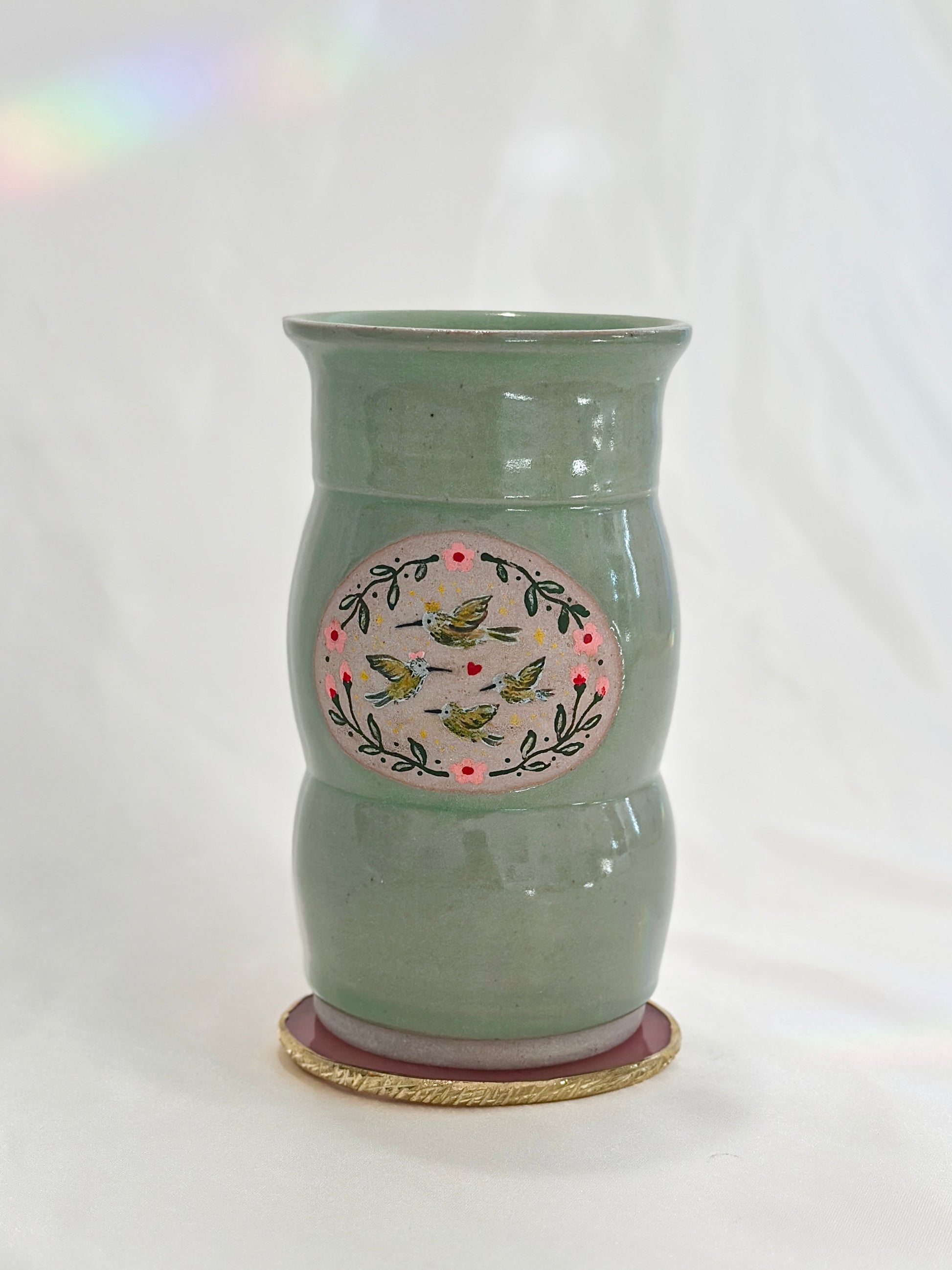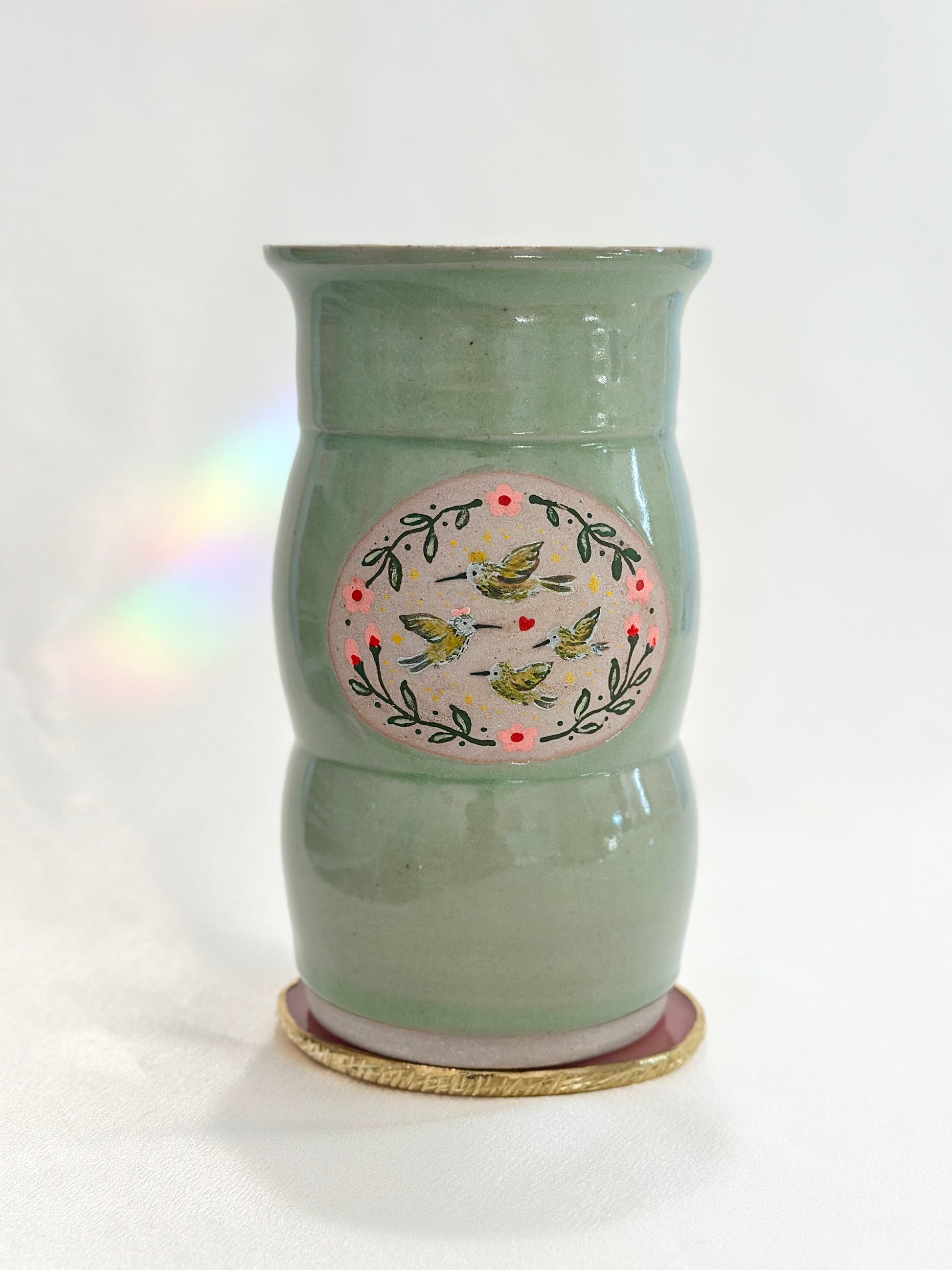 A soft green peaceful glaze wraps around this vase with a hummingbird family gathering at its heart, surrounded by gentle blossoms and leafy vines. The design evokes a moment of dawn, peaceful and full of life 😌