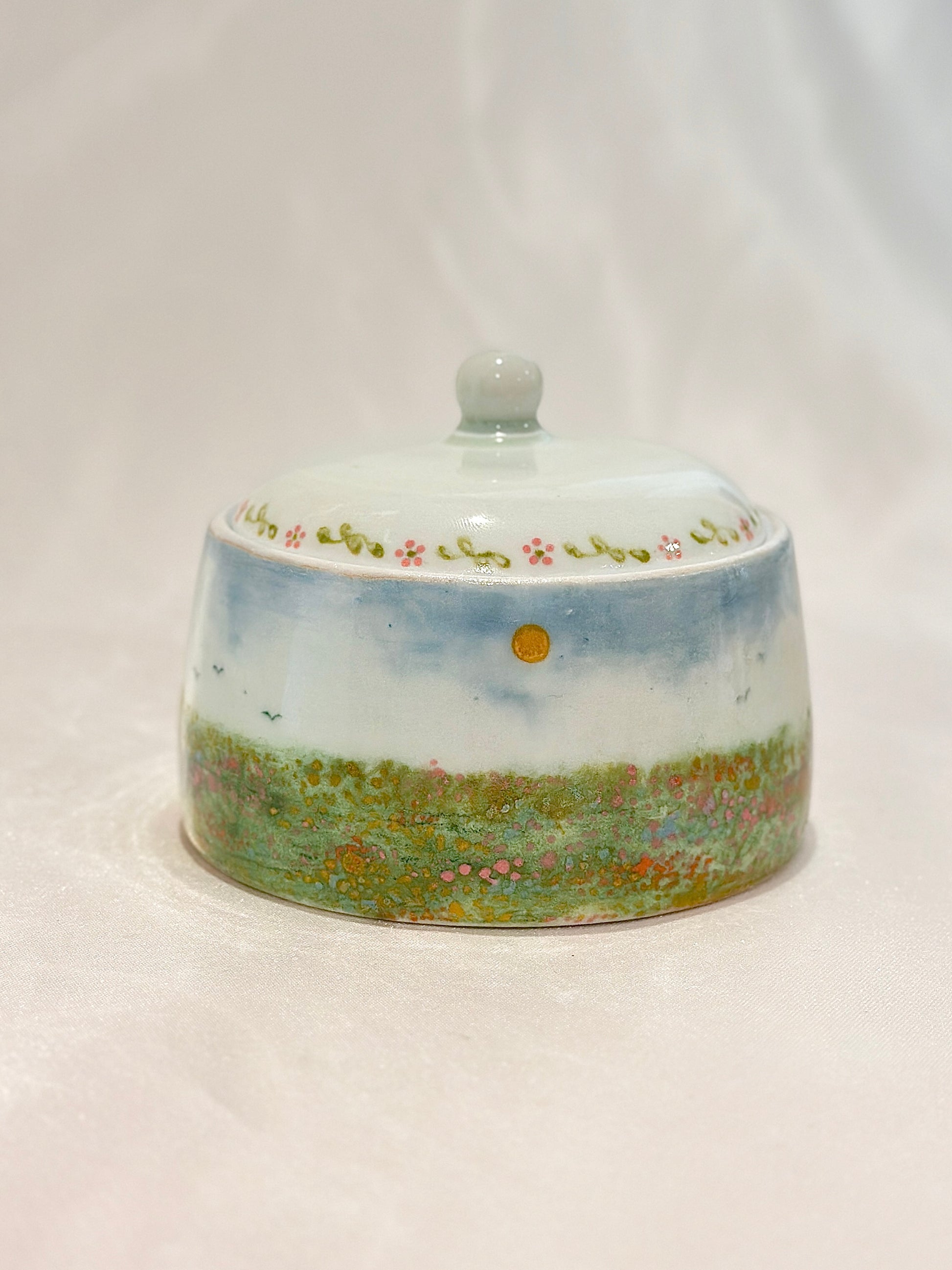 Wildflowers bloom across a rolling meadow beneath a golden sun, encircling this gentle porcelain trinket jar. A soft, dreamy landscape for your tiny treasures ☁️