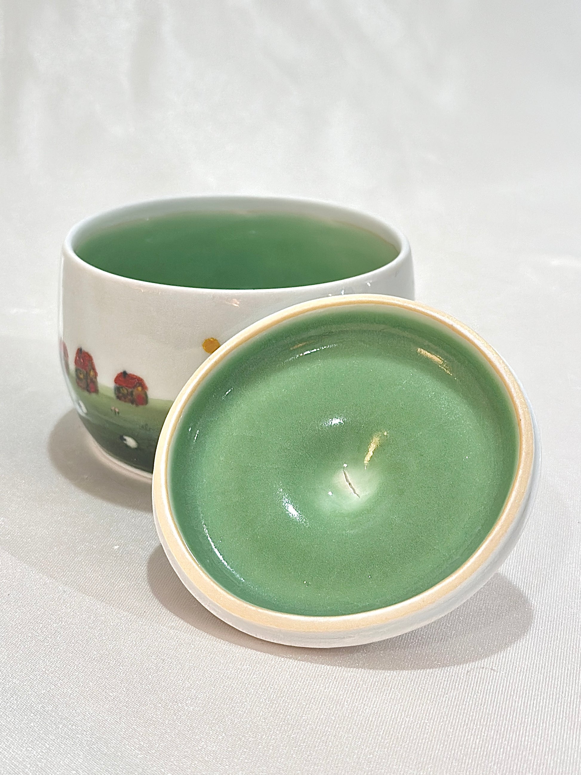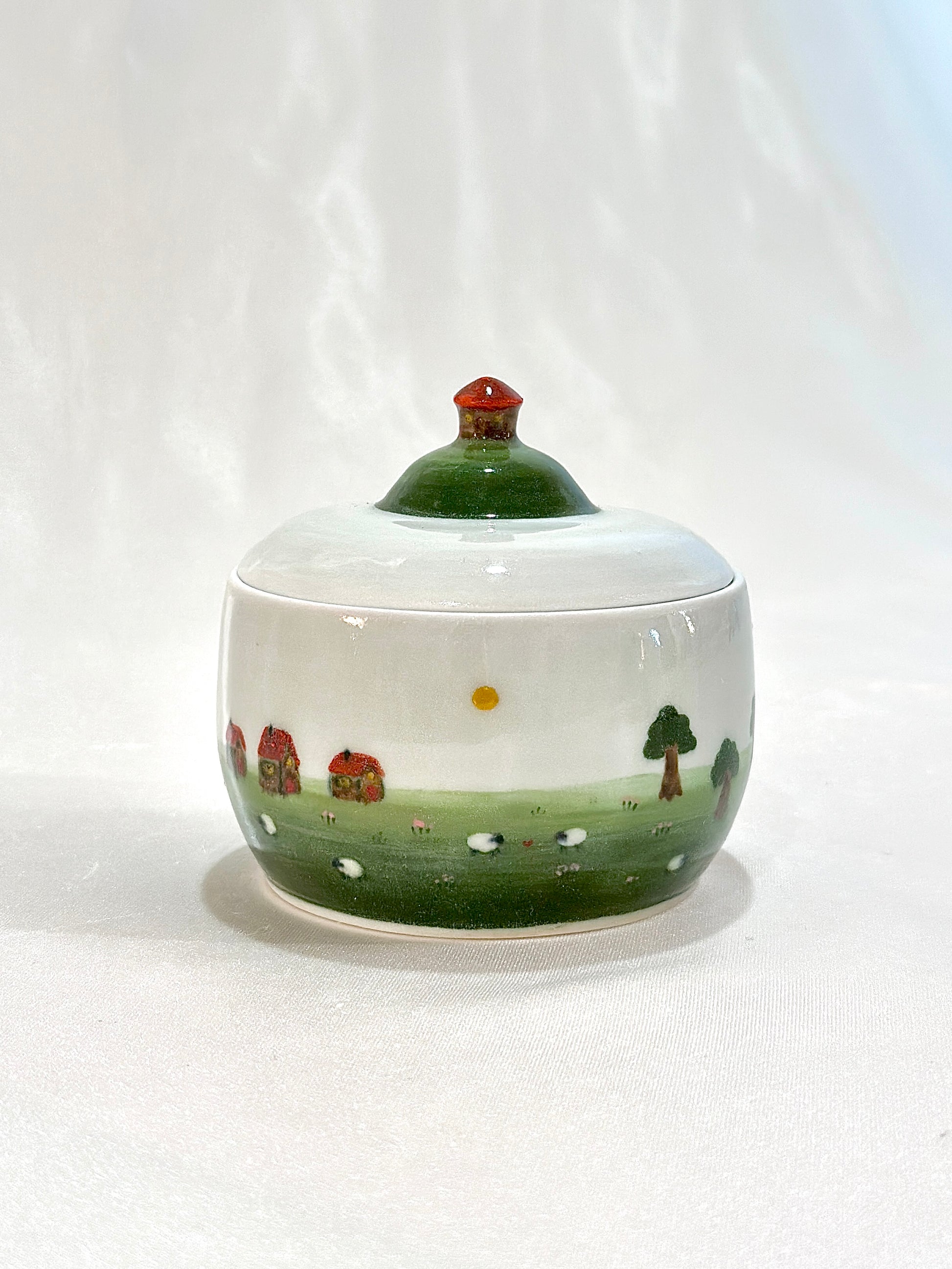 A quiet green meadow wraps around this trinket jar, dotted with tiny sheep and warm red-roofed cottages. The little hilltop knob on the lid feels like a miniature world of its own. It carries a peaceful countryside feeling, perfect for holding small treasures, rings, or keepsakes. Please: Small cosmetic craze line underneath lid 🌿