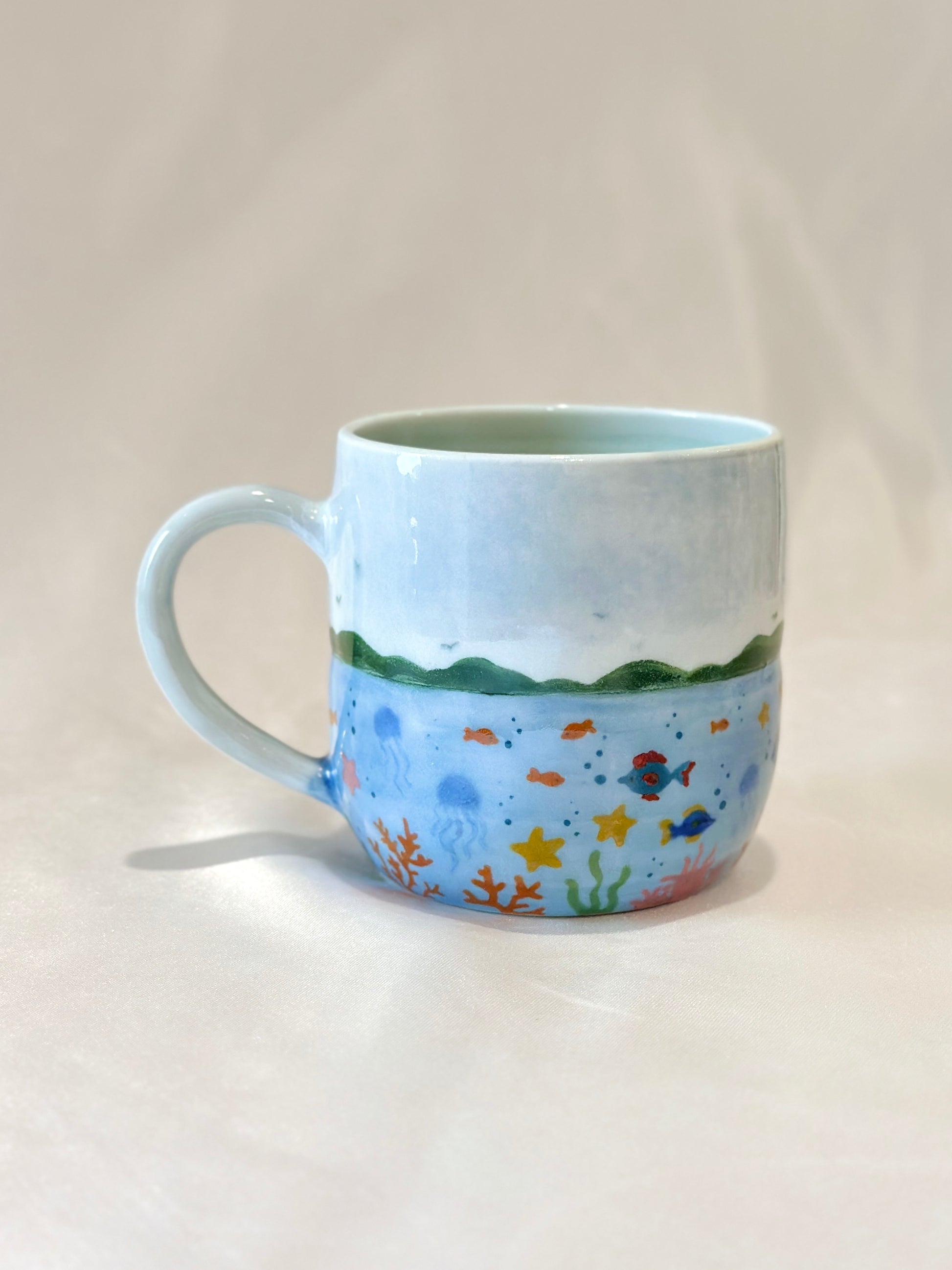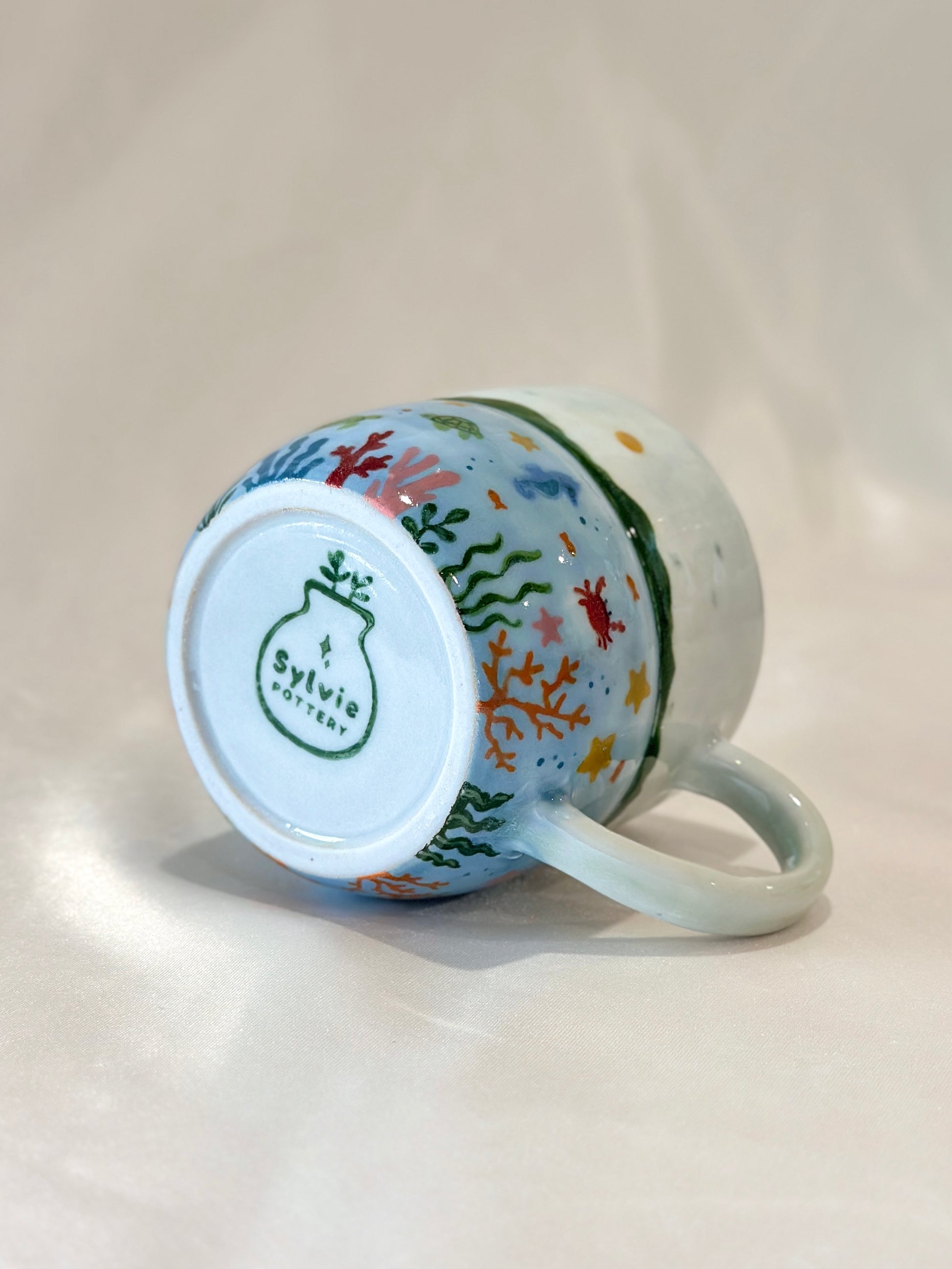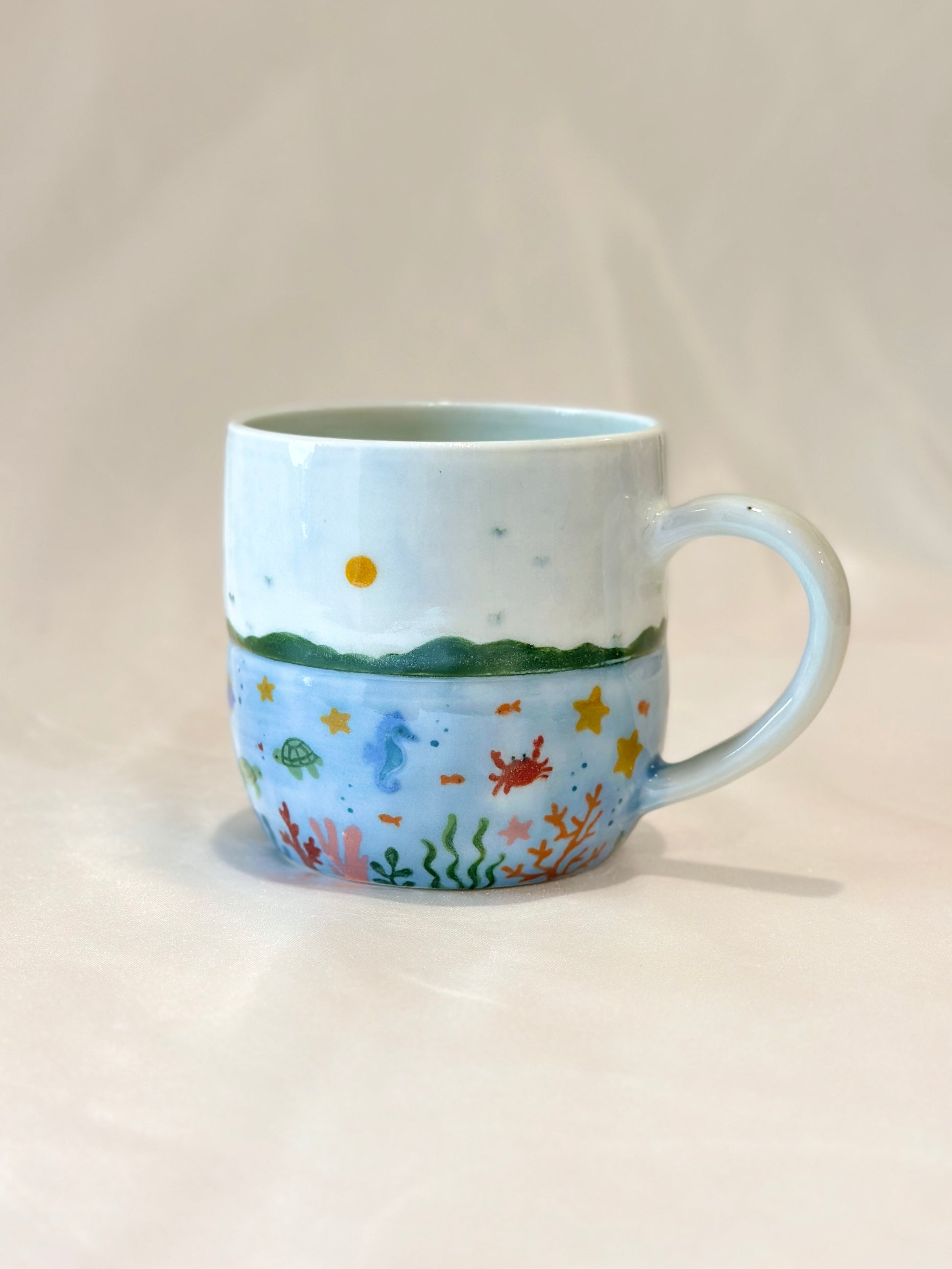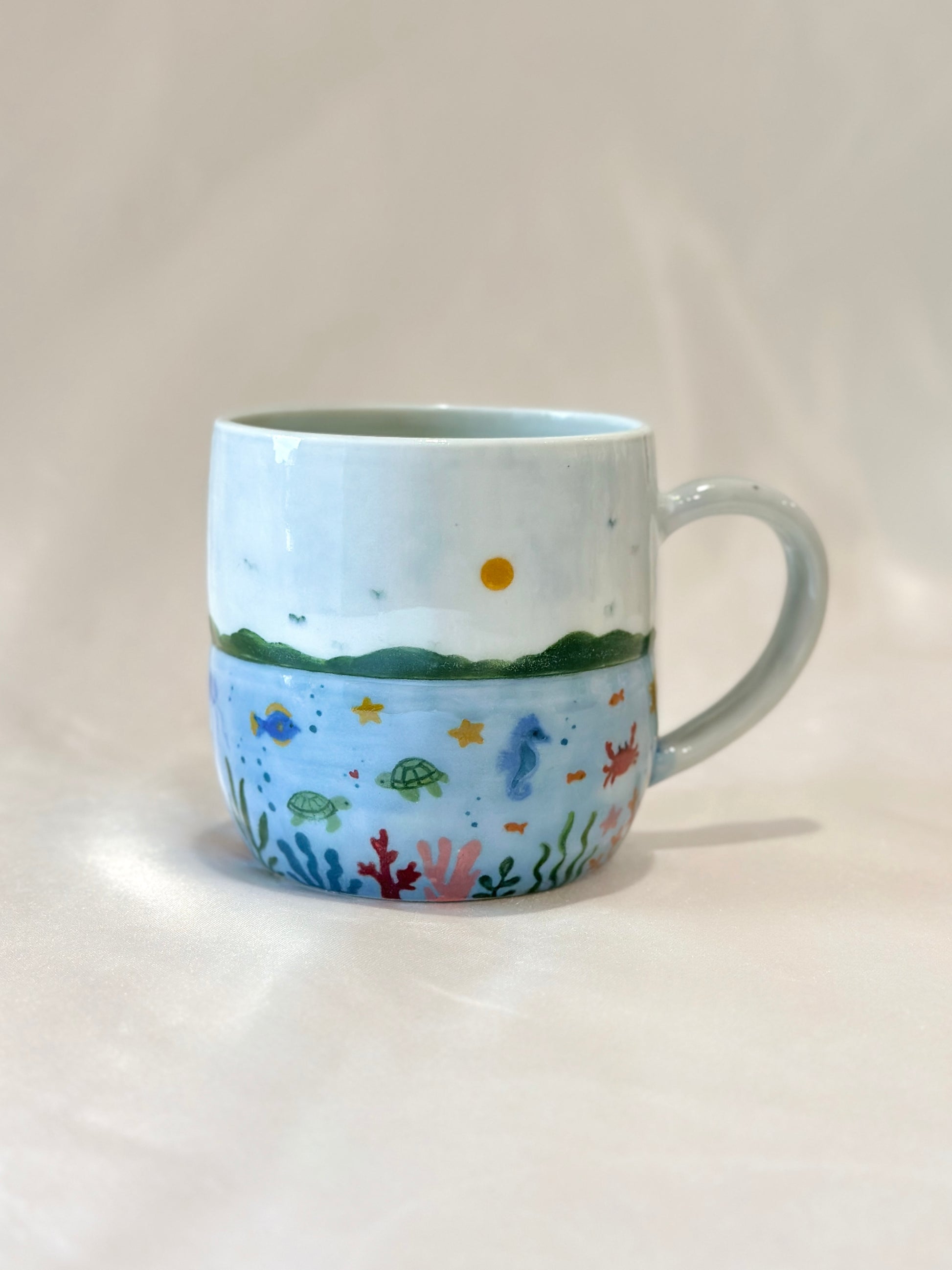 The sea comes alive around this piece, coral, turtles, seahorses, and tiny starfish drift in painted blues beneath a glowing sun. A playful underwater garden made to carry the calm of the ocean into your day 🐢