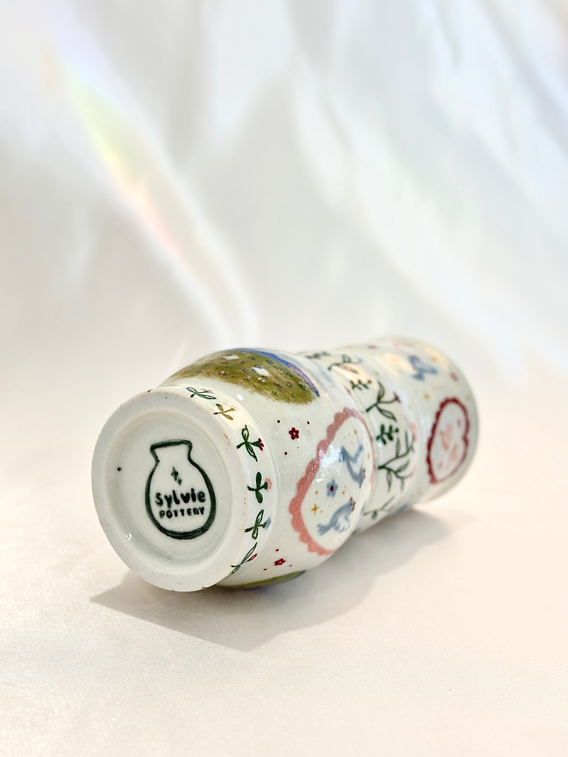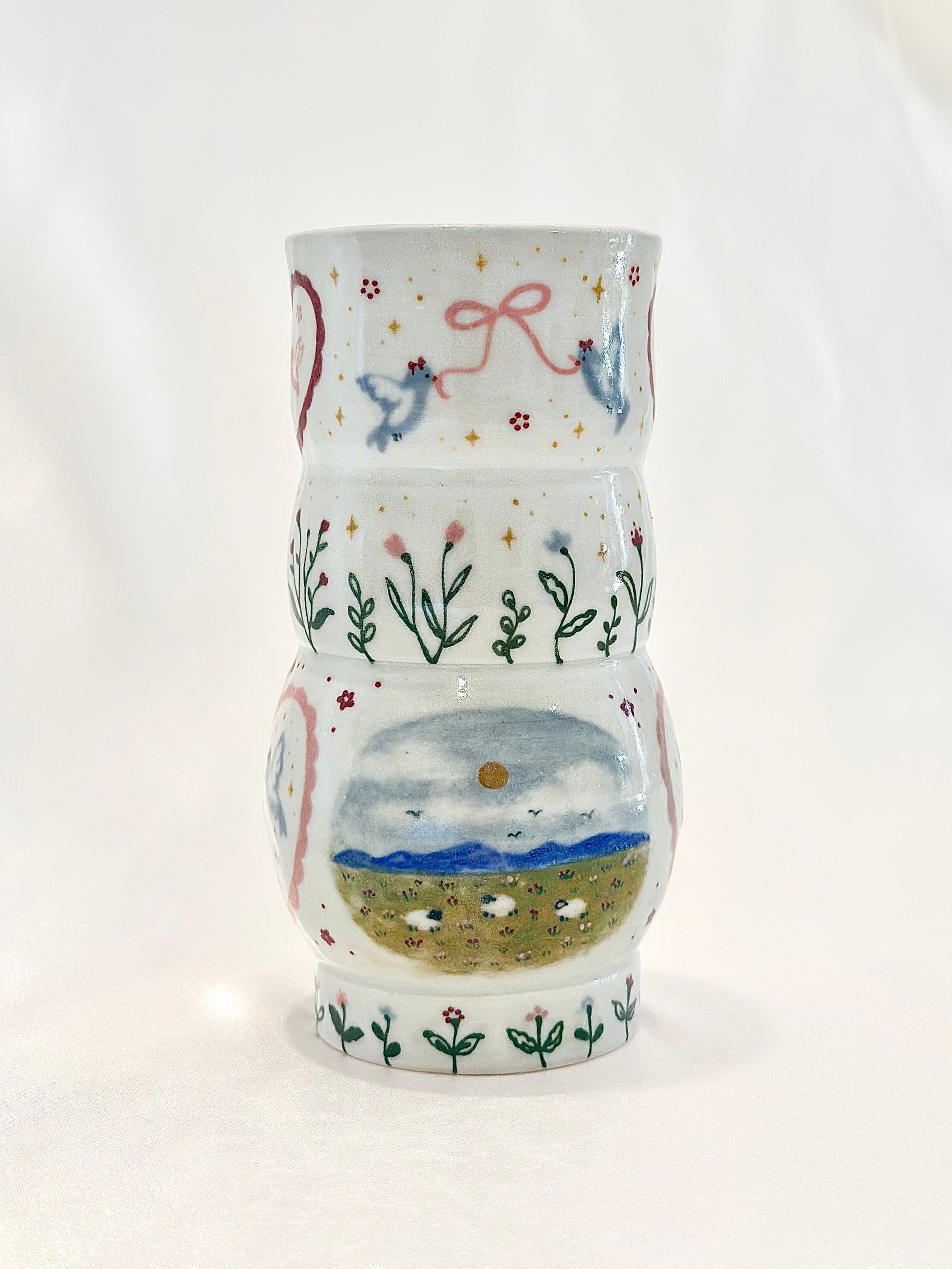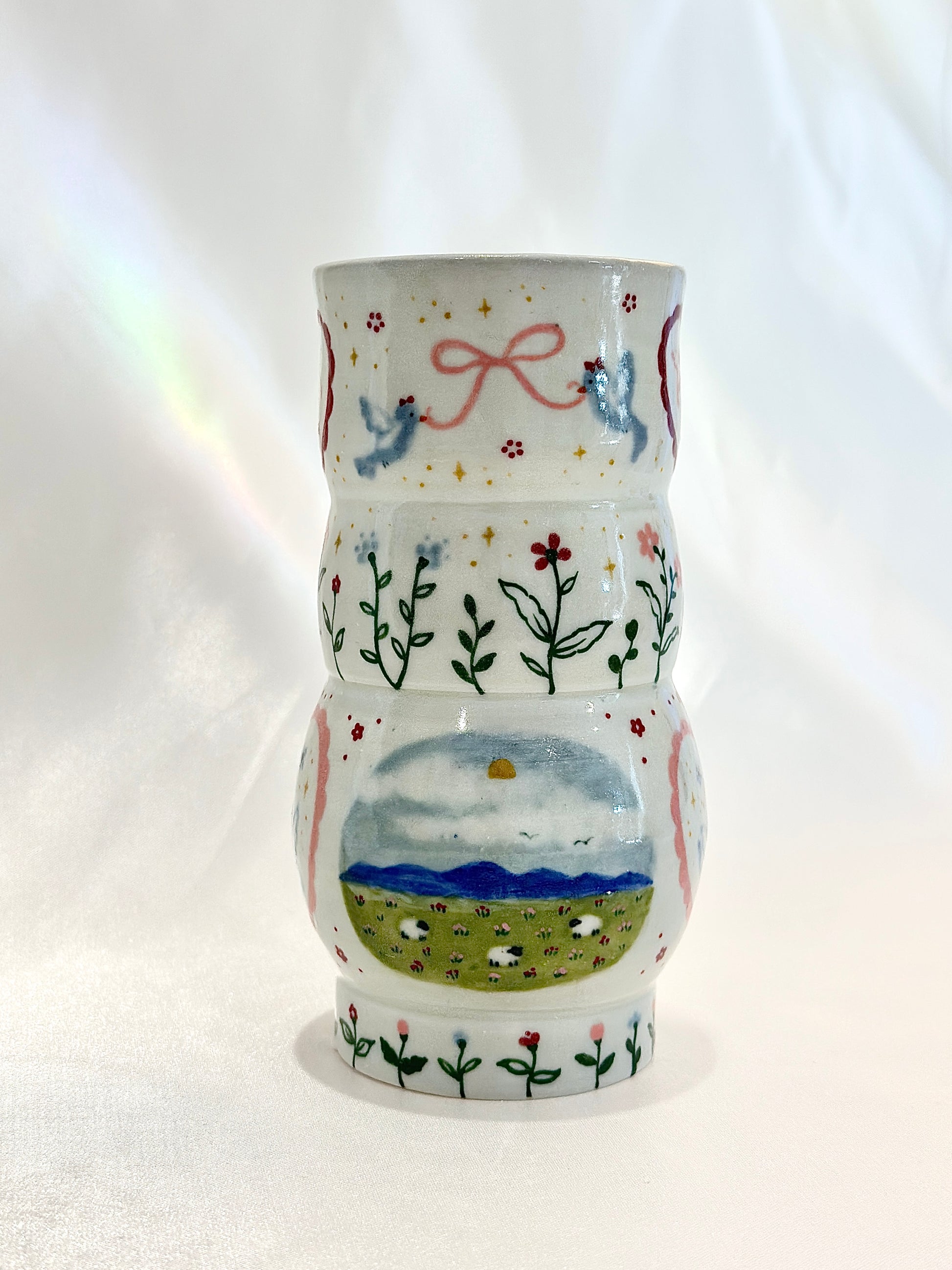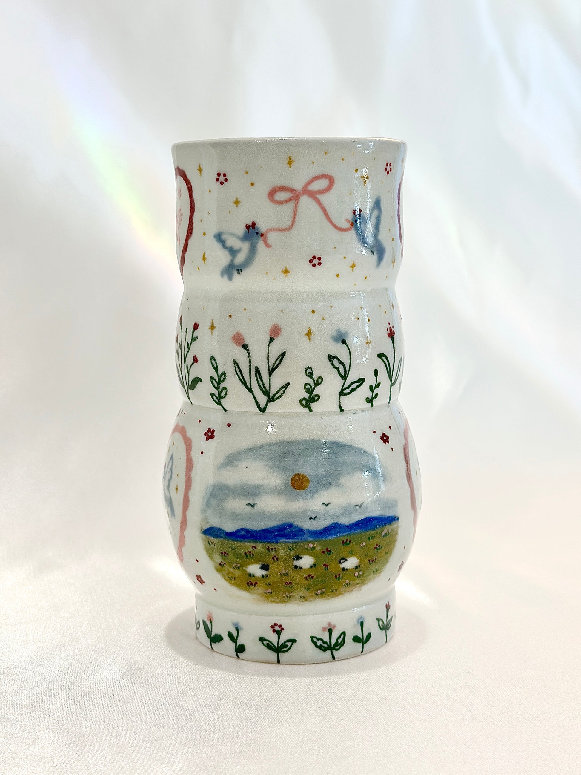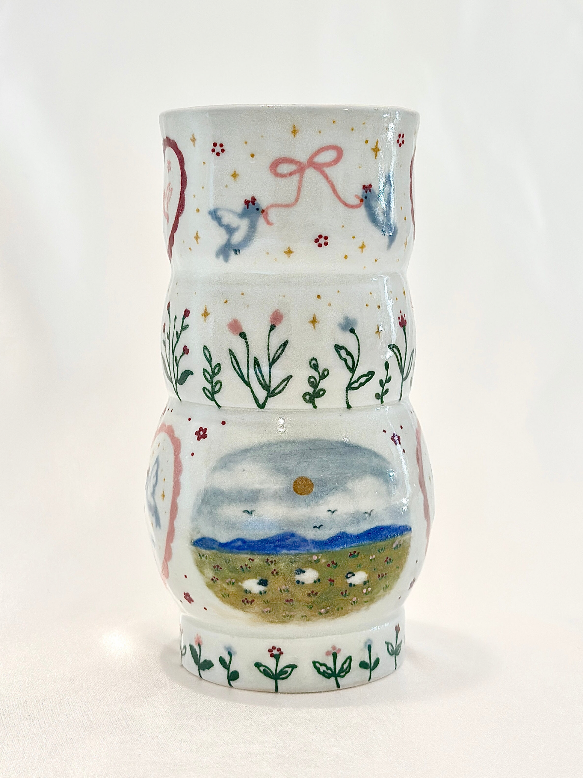 A trio of vignettes circles this three tiered bubble vase. Each element flows into the next, like a soft story unfolding in porcelainš·