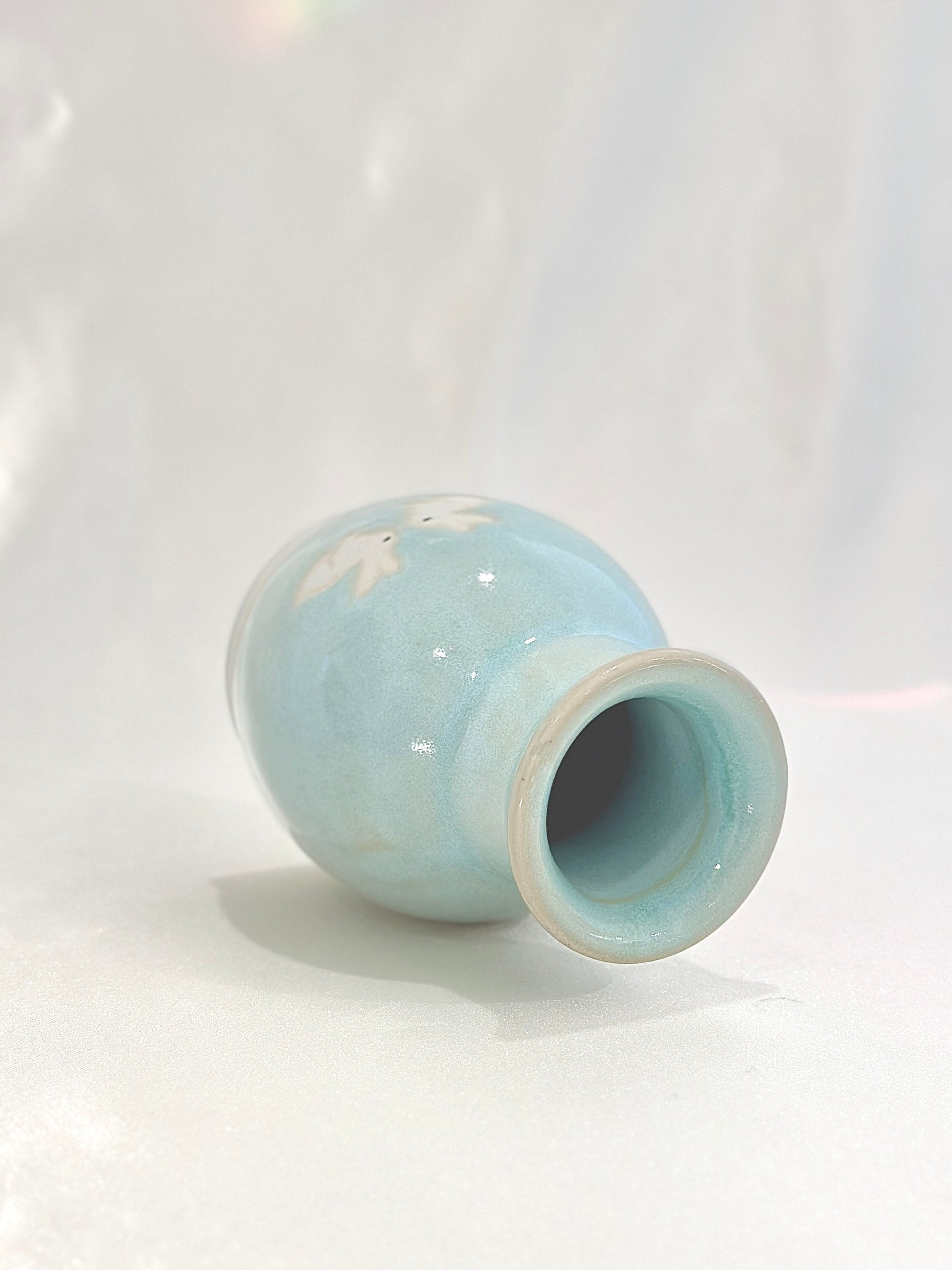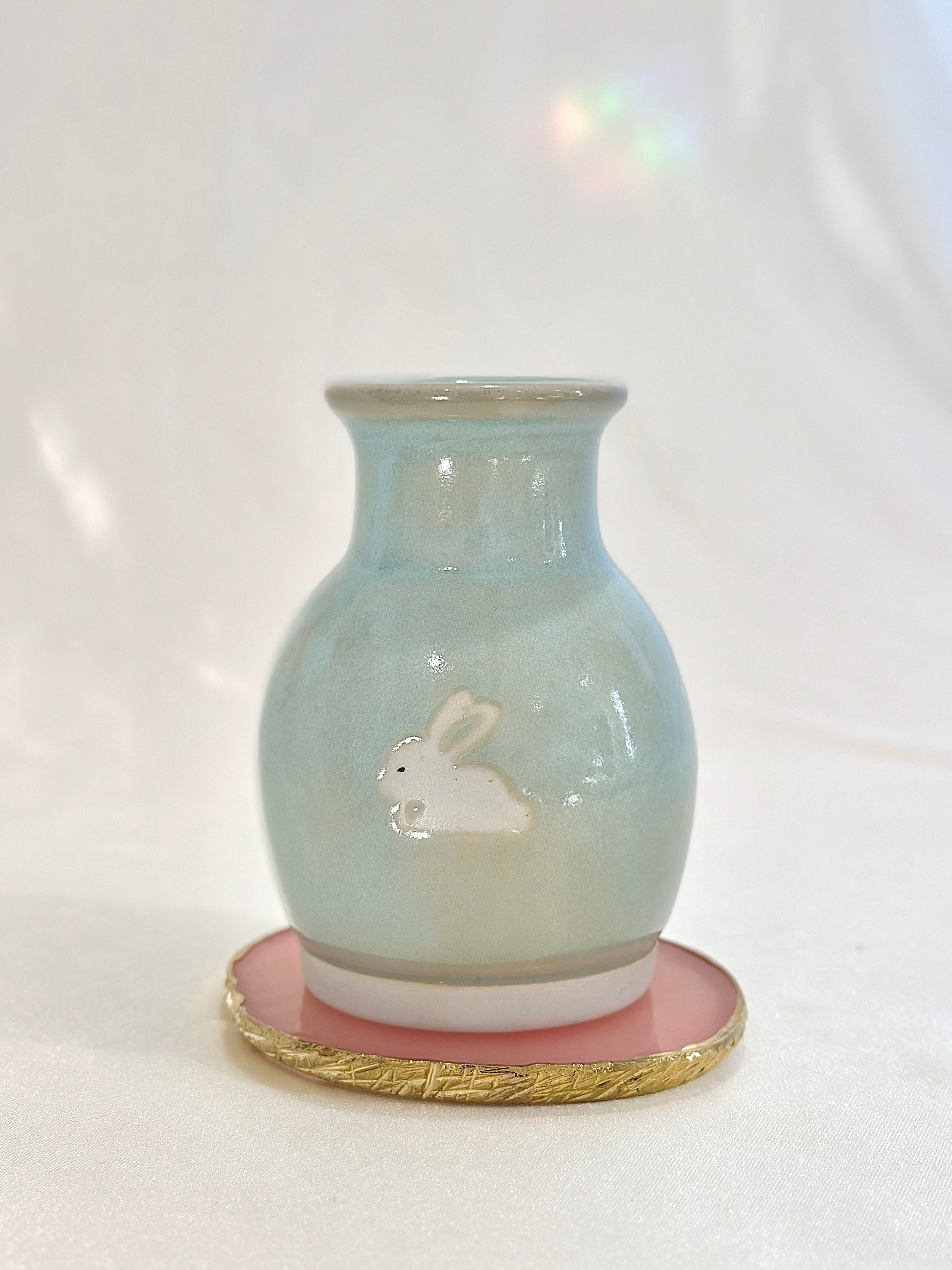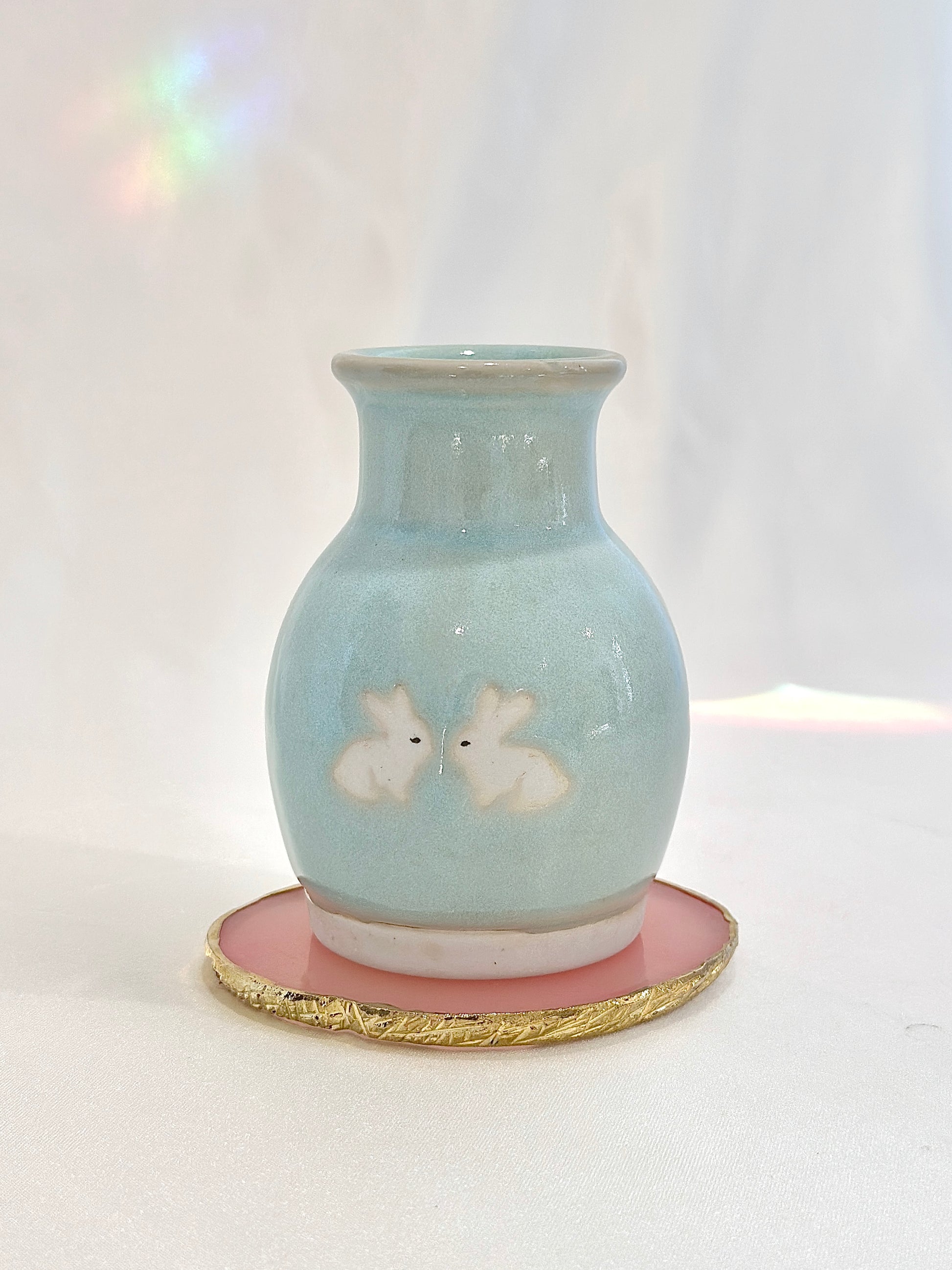 This sweet little bud vase is glazed in soft sky blue, with two gentle bunnies facing one another at its center and a single one on the other side. The form is small and tender, like a keepsake meant to hold a single stem or small buds. This piece is a whisper of softness, reminding you to hold onto gentleness even on busy days. A small companion for your desk, windowsill, or altar of everyday beauty 🐇💗